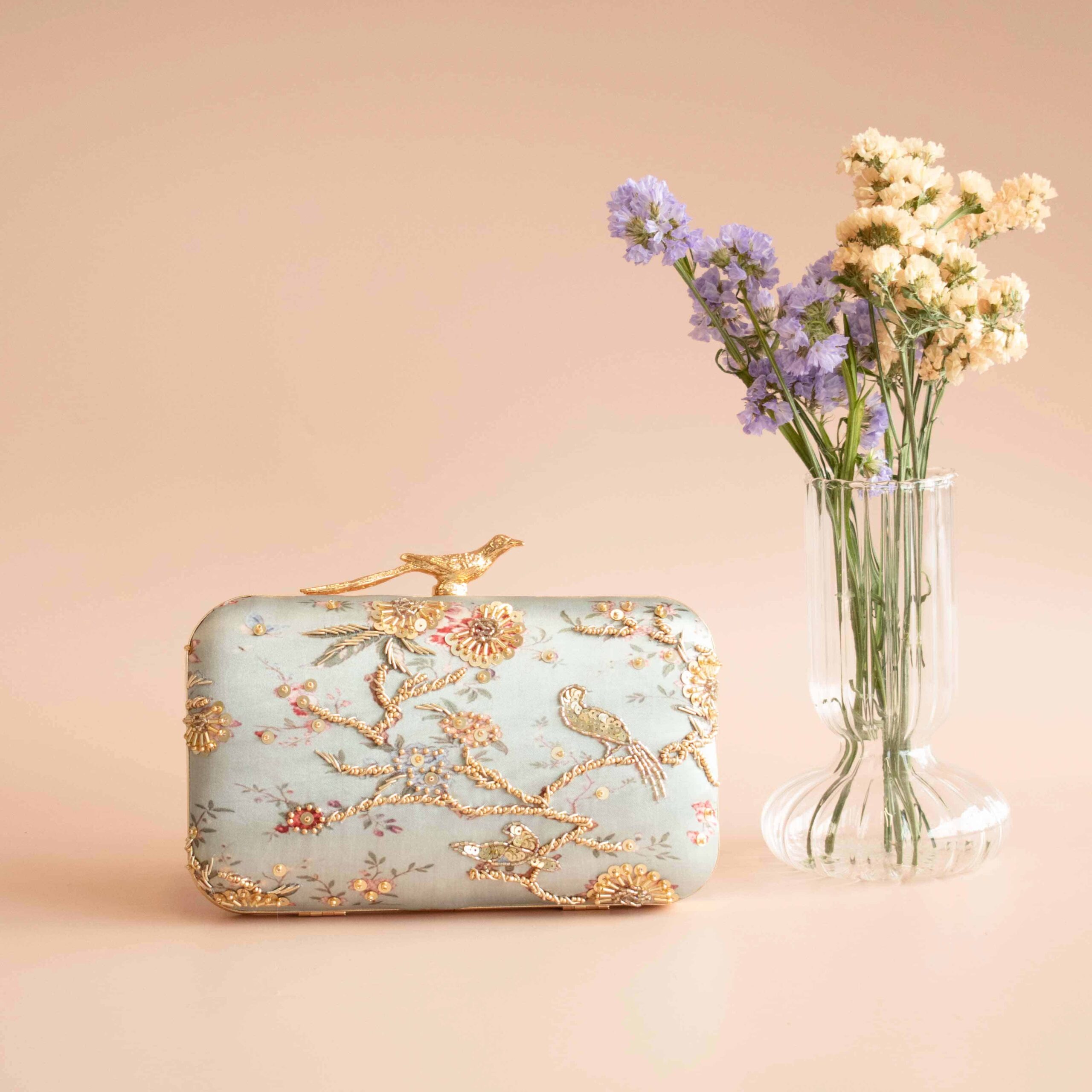 A very elegant and quirky rectangular shaped clutch. This clutch has a printed mint satin silk base embellished with gold zardozi, sequins and beads on the front side and just the print on the back.