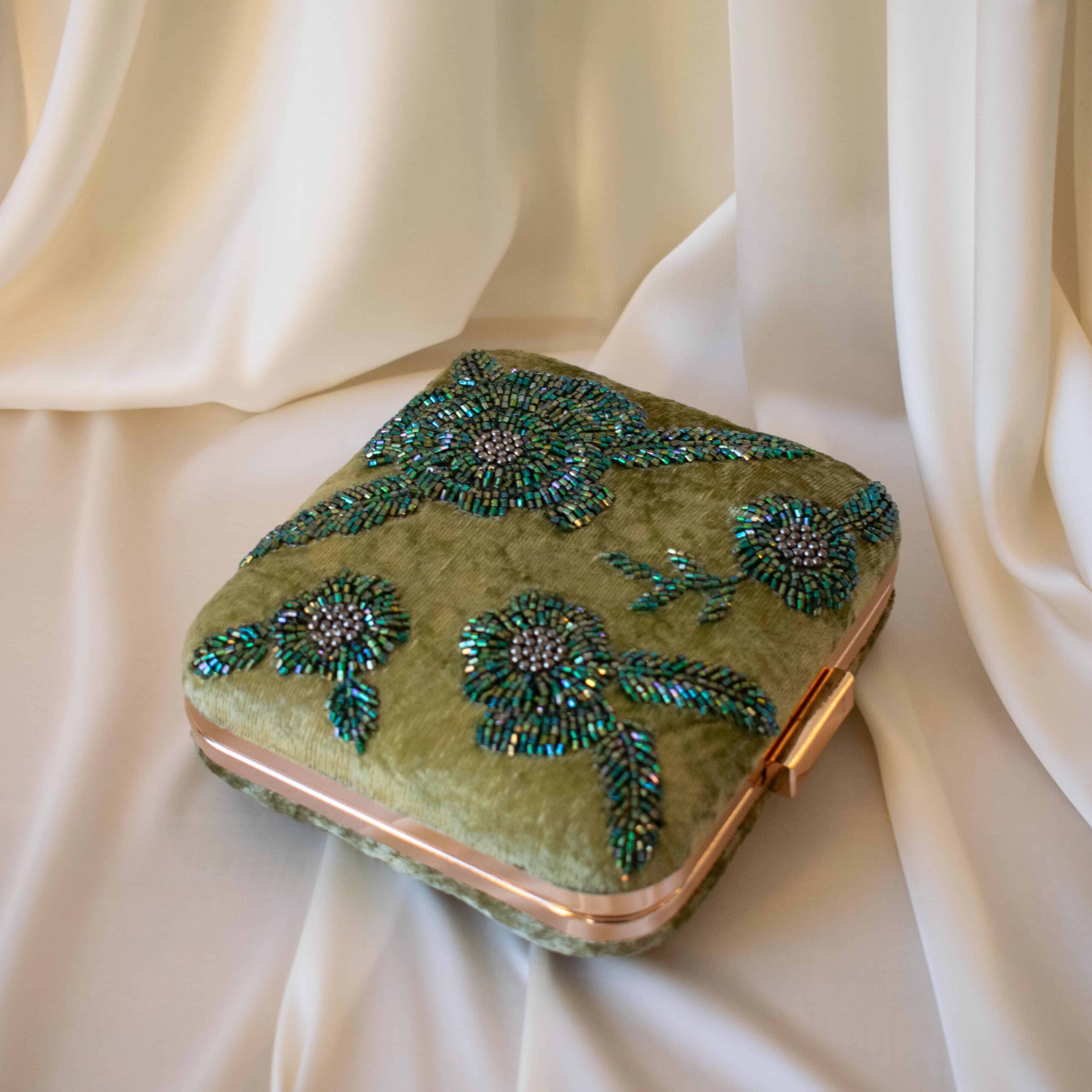Our EVERGREEN clutch is the definition of subtle glam. We’re loving the emerald green glass bead embroidery on a green velvet base. Perfect to add that pop of colour to your look!