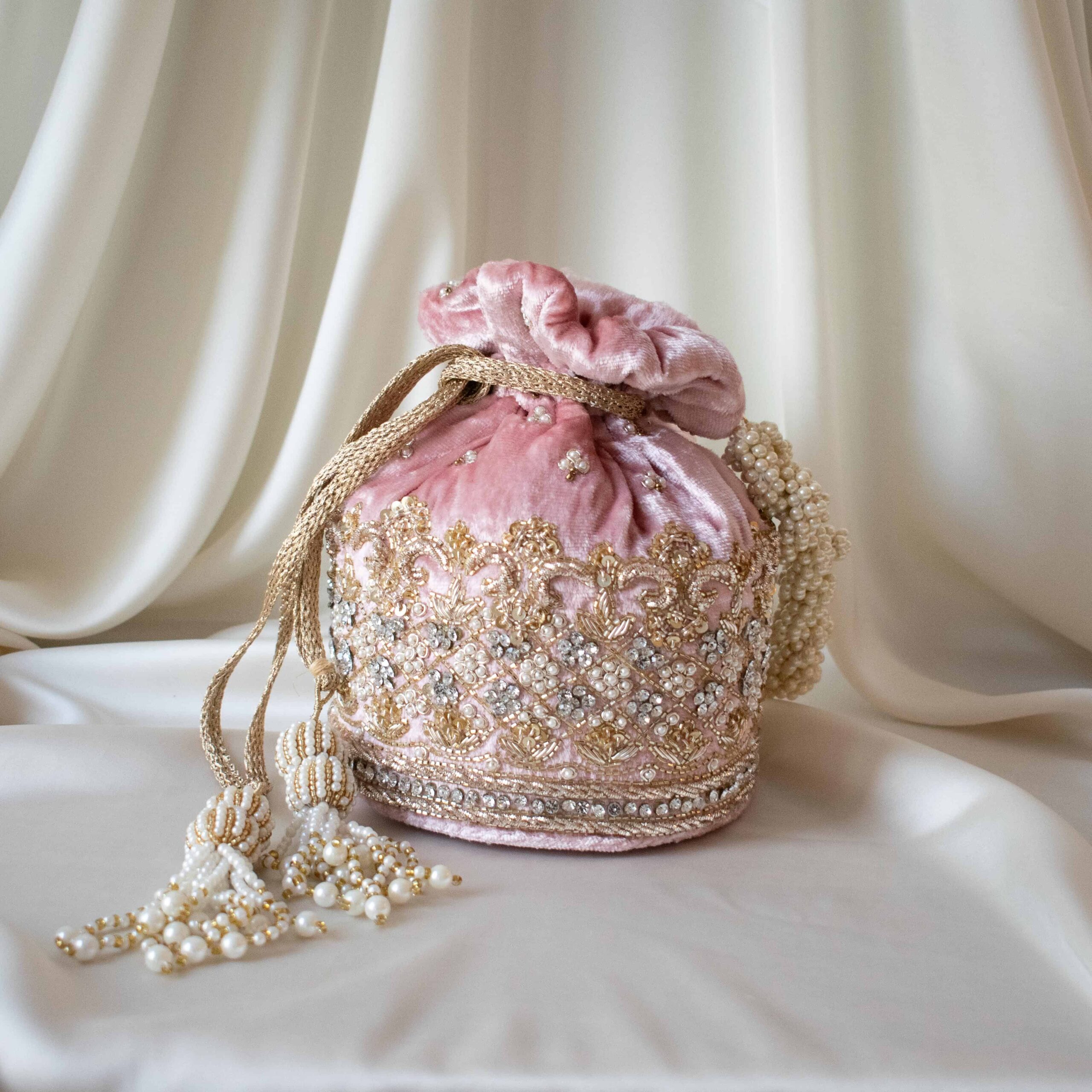 A gorgeous velvet potli bag with intricate beading and hand embroidered details. Completed with pearl drop tassels. A glamorous accessory fit for a queen!