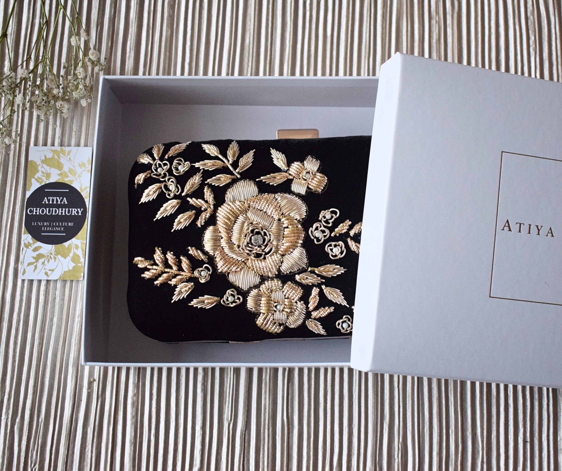 A black velvet clutch featuring intricate gold zardozi floral embroidery — a timeless desi-chic statement piece for festive and evening outfits. Handcrafted and elegant. Includes a shoulder chain. Size: 8x4 inches.