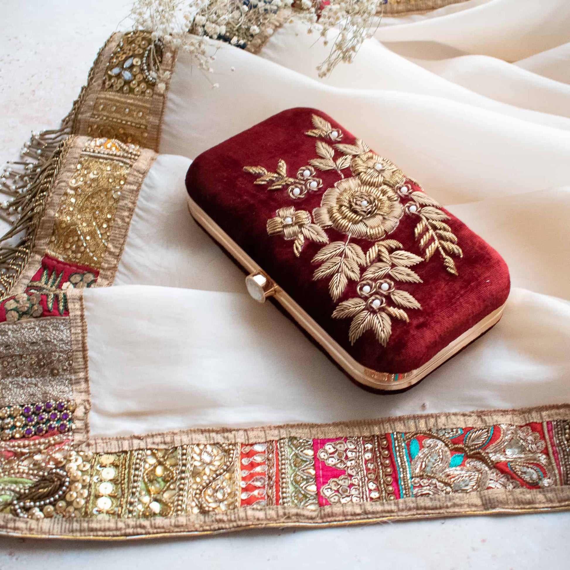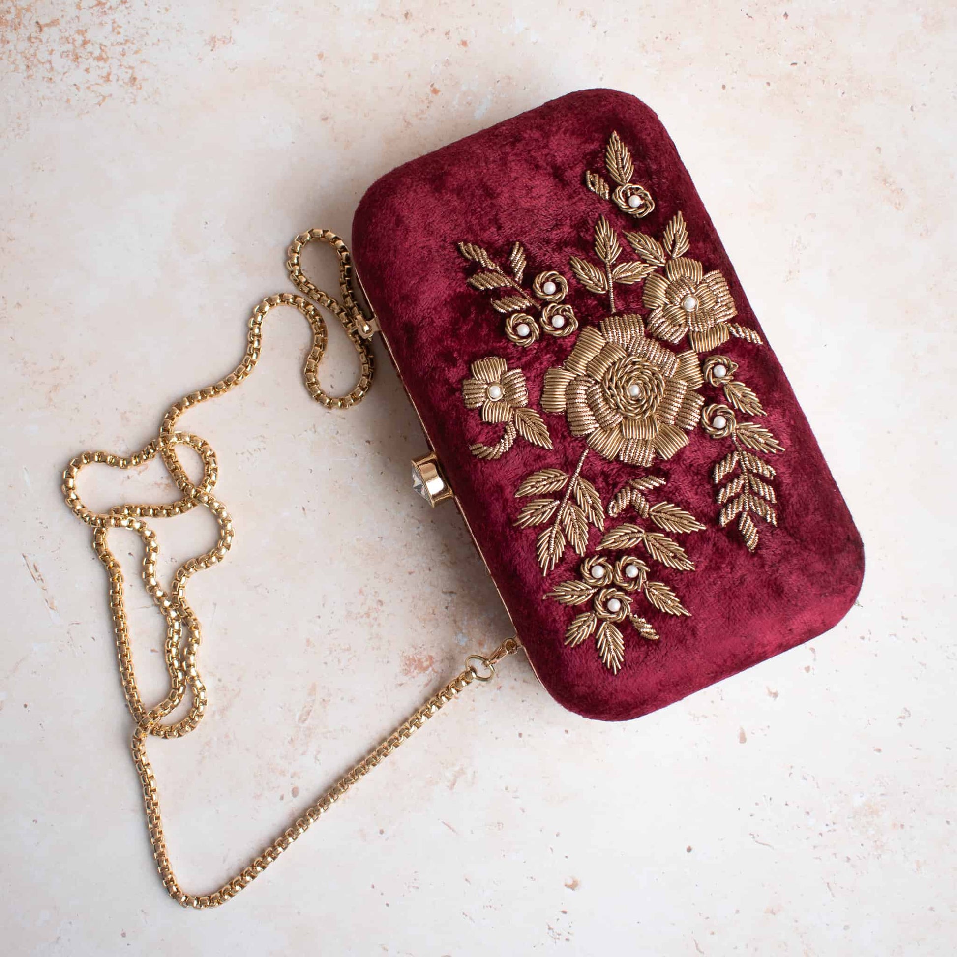 A maroon velvet clutch with gold zardozi floral embroidery, designed as a timeless desi-chic statement piece. Handcrafted, elegant, and perfect for festive or evening looks. Includes a shoulder chain. Size: 8x4 inches.