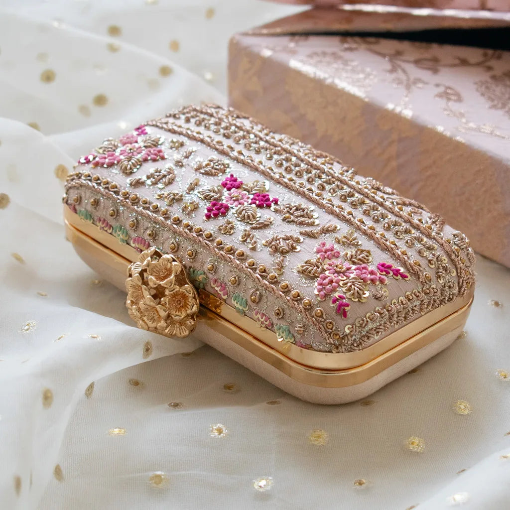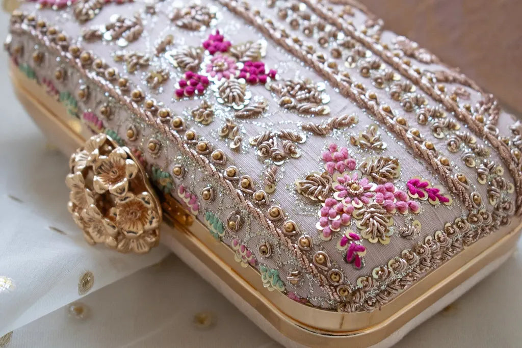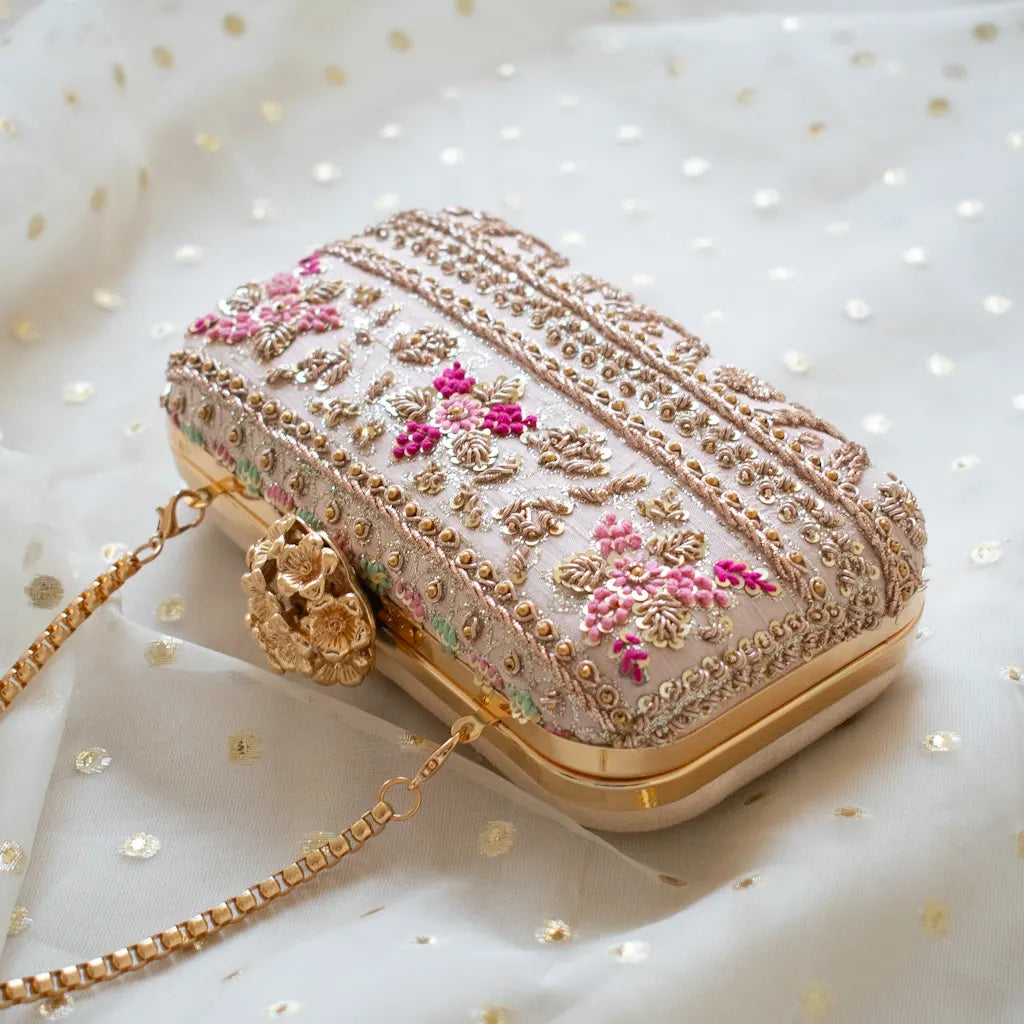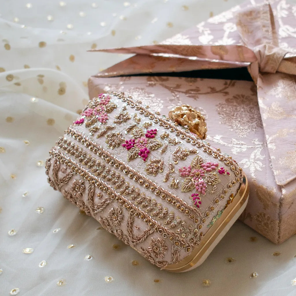 Introducing Amaliah, an heirloom-worthy handcrafted clutch designed for the woman who adores understated luxury and timeless detail. Set on a delicate nude pink silk base, this piece is meticulously adorned with rose-gold zardozi, shimmering sequins, and micro-bead florals, creating a captivating interplay of texture and elegance.