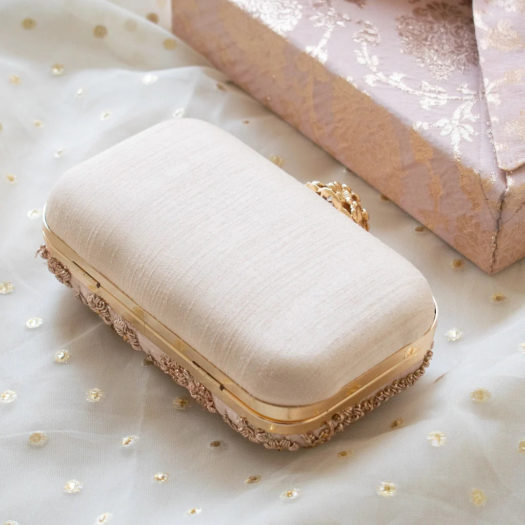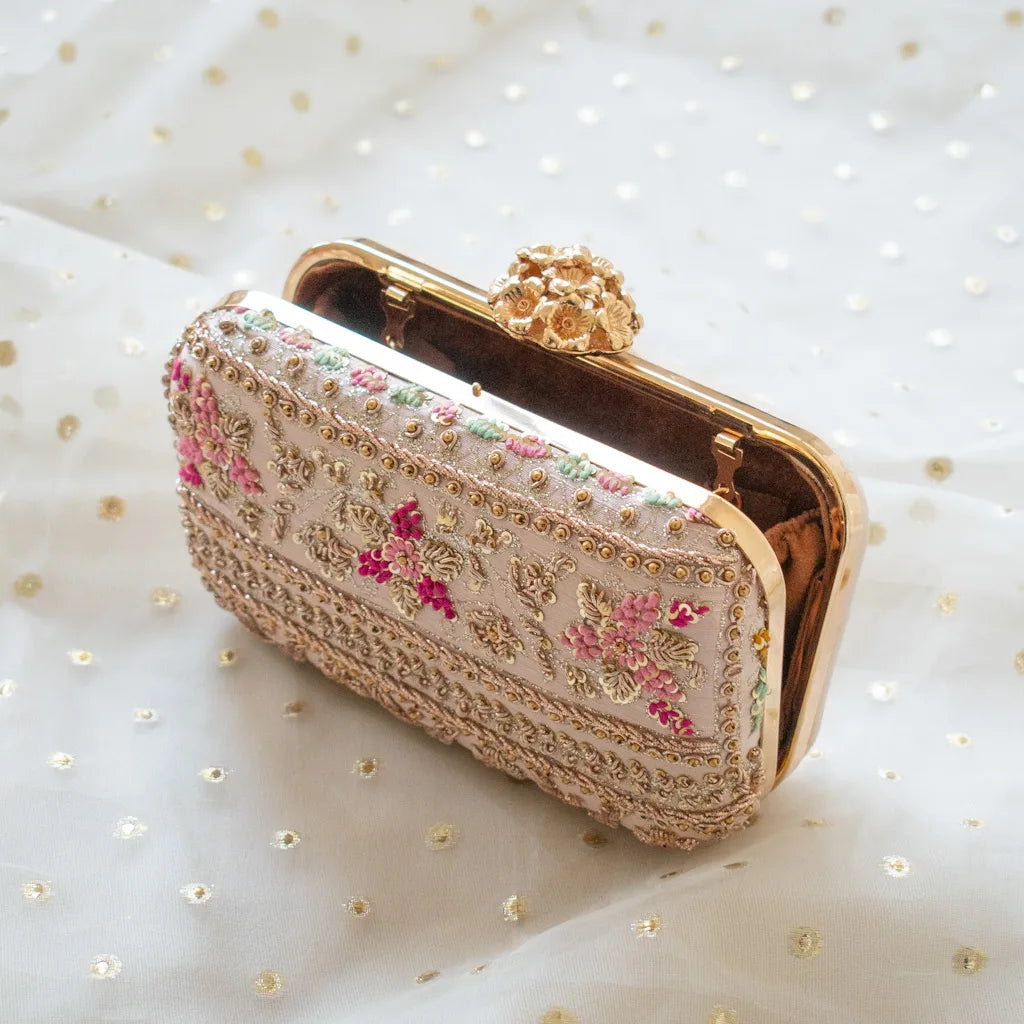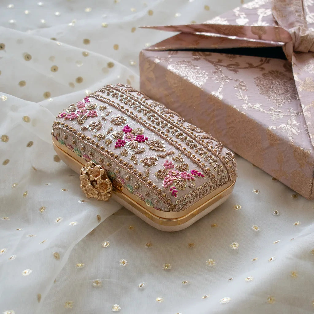 Introducing Amaliah, an heirloom-worthy handcrafted clutch designed for the woman who adores understated luxury and timeless detail. Set on a delicate nude pink silk base, this piece is meticulously adorned with rose-gold zardozi, shimmering sequins, and micro-bead florals, creating a captivating interplay of texture and elegance.