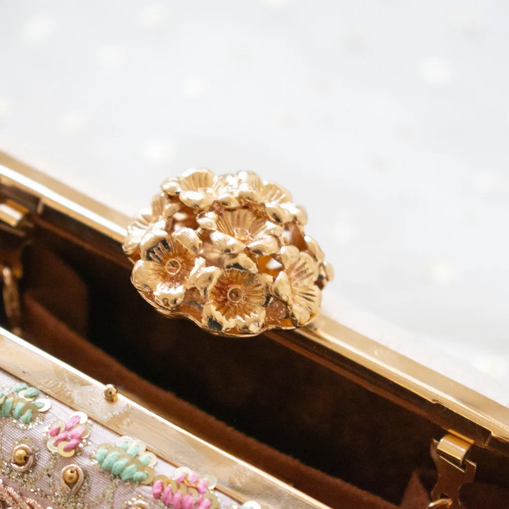 The artistry continues with its statement floral bouquet clasp, sculpted in a radiant gold finish — a detail created to resemble a cluster of delicate blossoms. This couture-inspired clasp sets Amaliah apart as more than an accessory — it is a wearable keepsake.