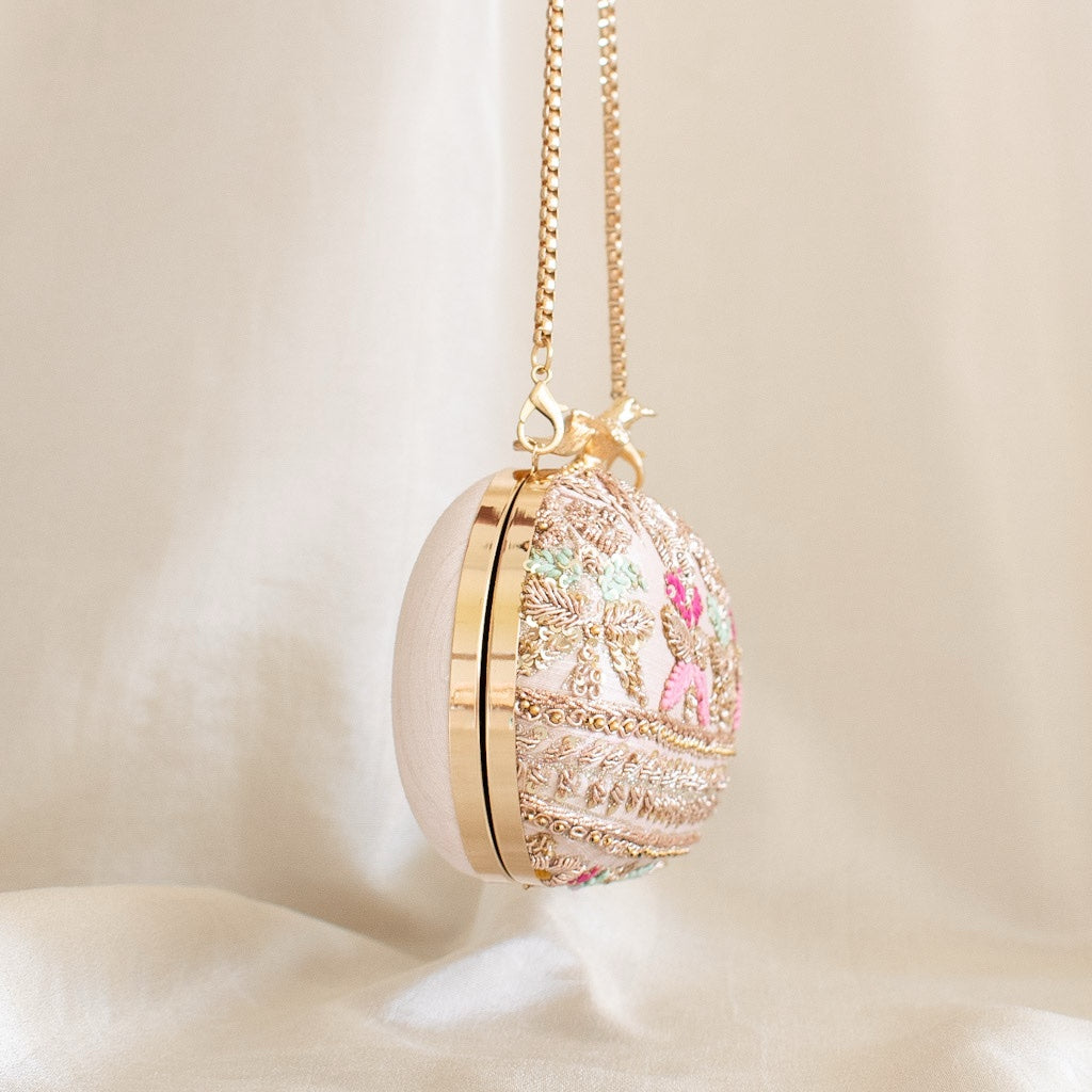 The Amariah Clutch is a true celebration of craftsmanship and elegance. Handcrafted on a soft nude pink silk base, it features intricate zardozi hand embroidery in shimmering gold, delicately accented with pastel hues and floral–bow motifs. Each stitch tells a story of timeless artistry, making it more than just an accessory — it’s a keepsake.