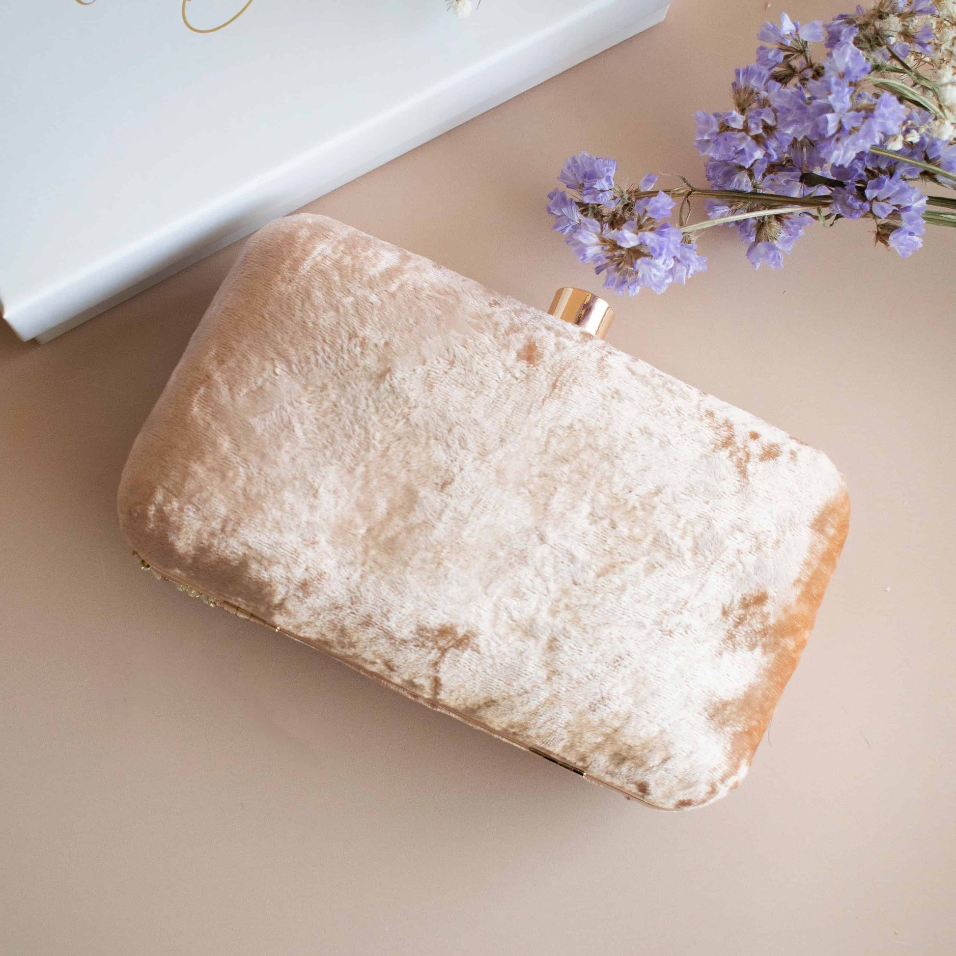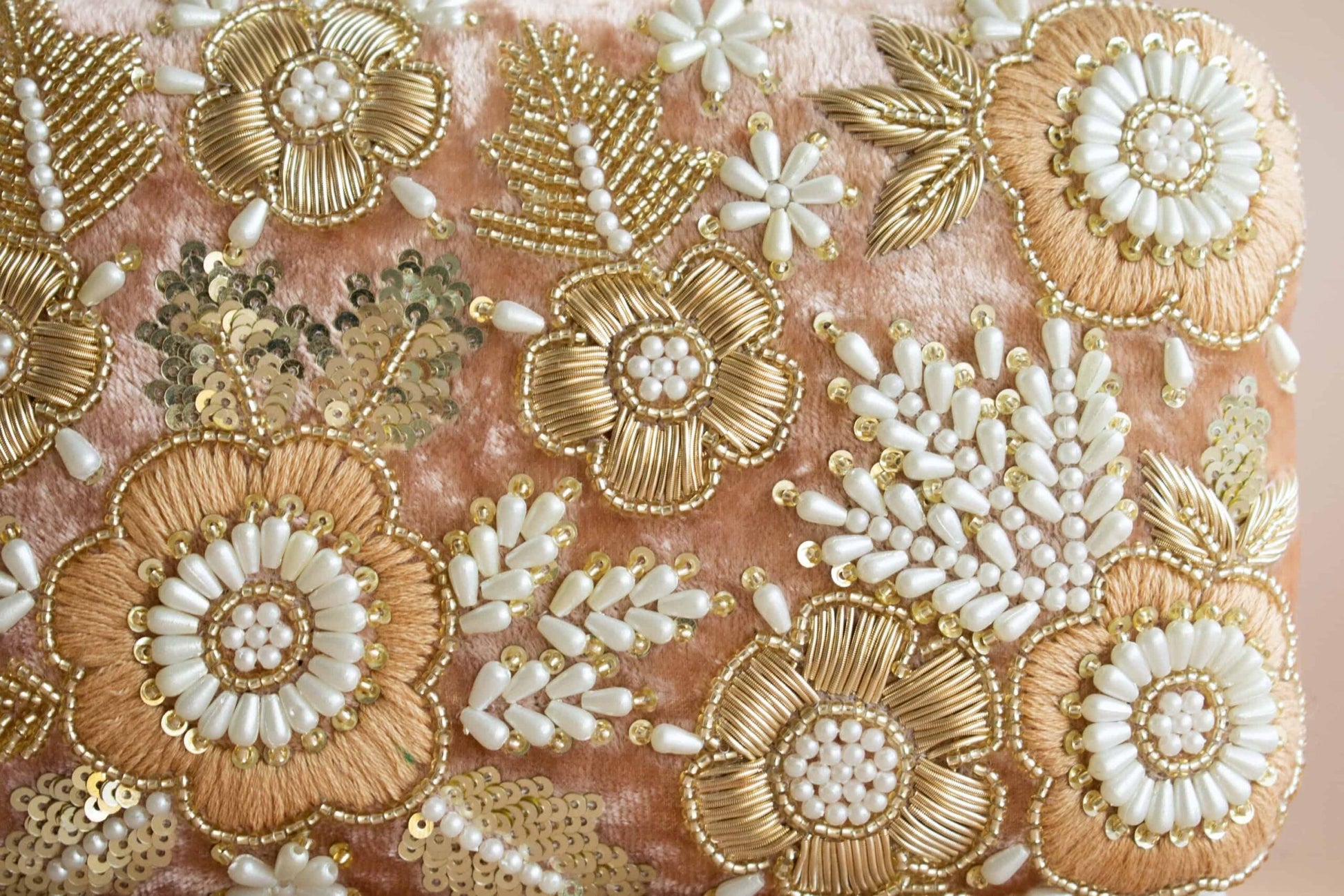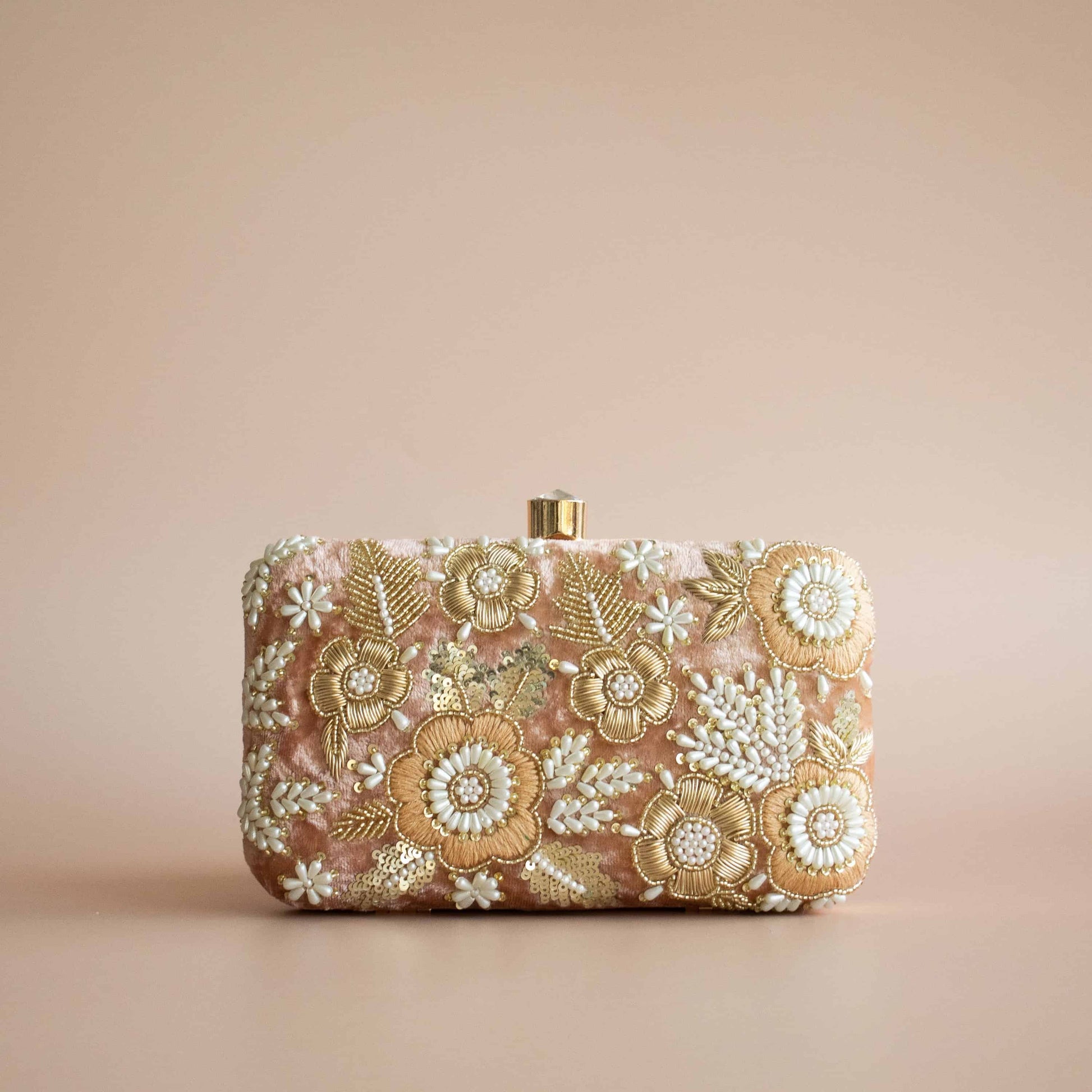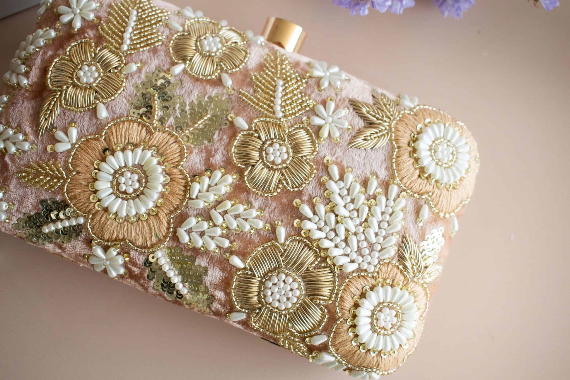 Ariana is a beautifully handcrafted clutch featuring a soft champagne velvet base adorned with intricate floral embroidery. Each flower is delicately created using a mix of pearls, sequins, resham threadwork, and metallic gold zardozi, giving the piece a rich, textured, and luxurious finish. The pastel florals stand out softly against the champagne backdrop, creating a dreamy, feminine aesthetic.