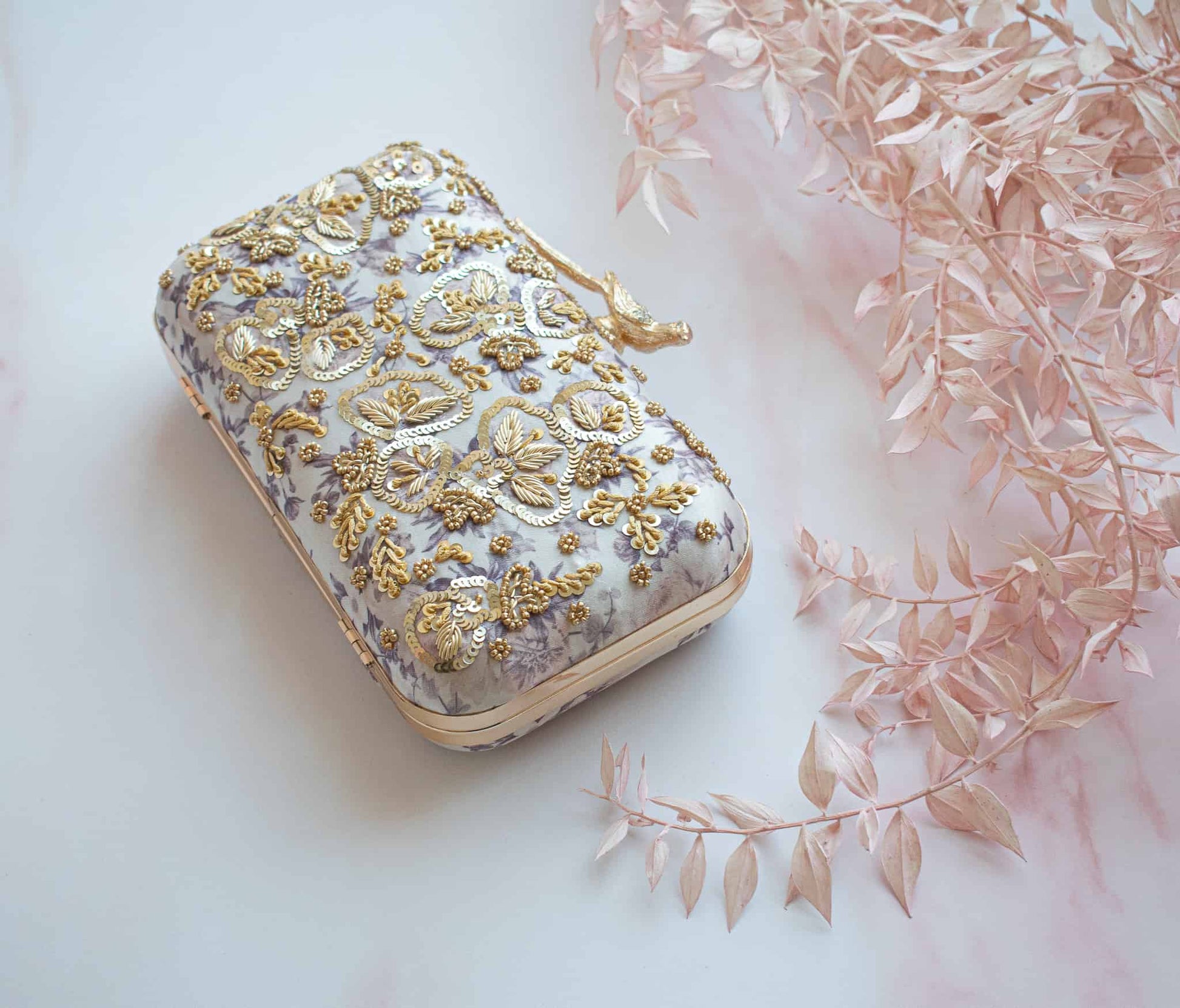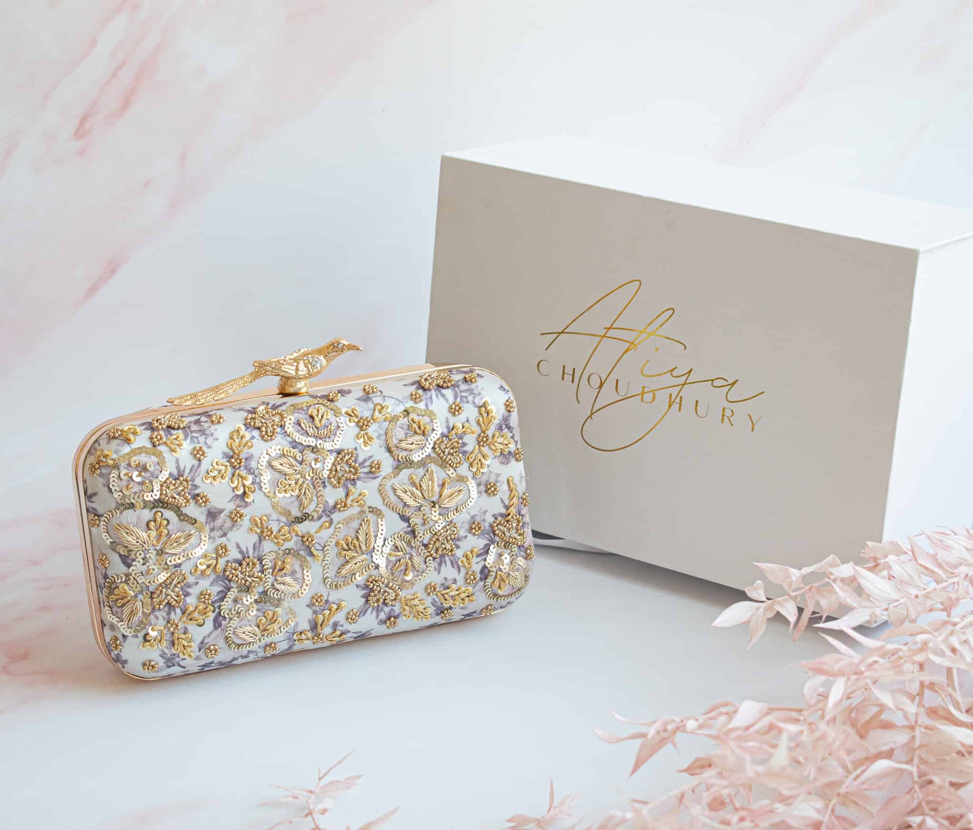 Elegant and unique, the Celine Bird Clasp Clutch features a soothing ivory and lilac digital print beautifully paired with intricate hand embroidery. Its standout gold bird clasp adds a refined, signature touch. Sized at 8 × 4 inches, this structured clutch includes a premium shoulder chain for easy styling. Perfect for weddings, festive occasions, and elegant evenings, Celine blends delicate artistry with everyday functionality.