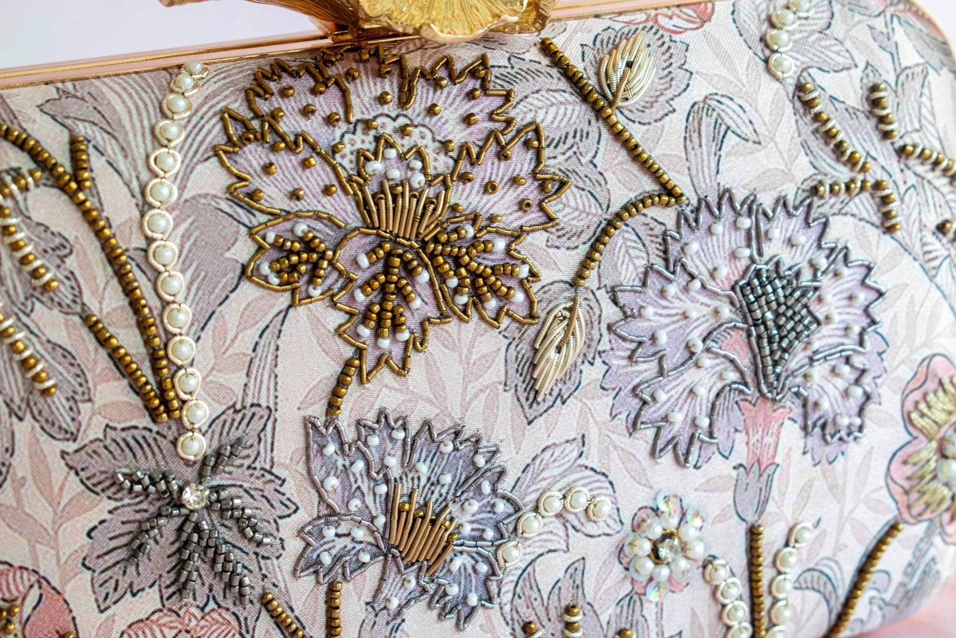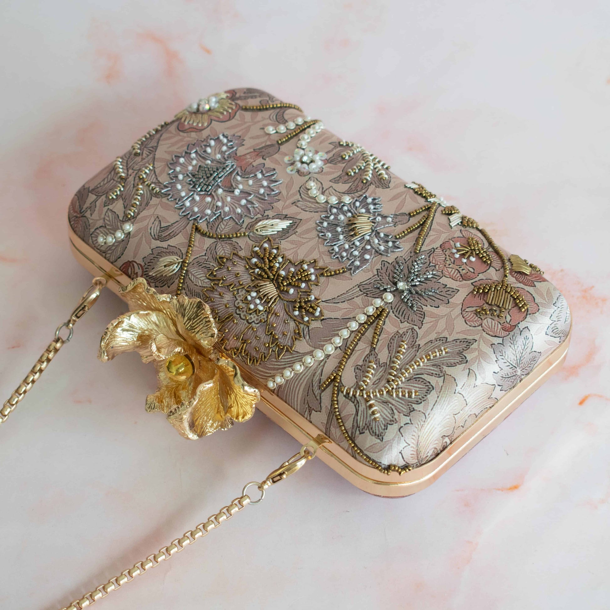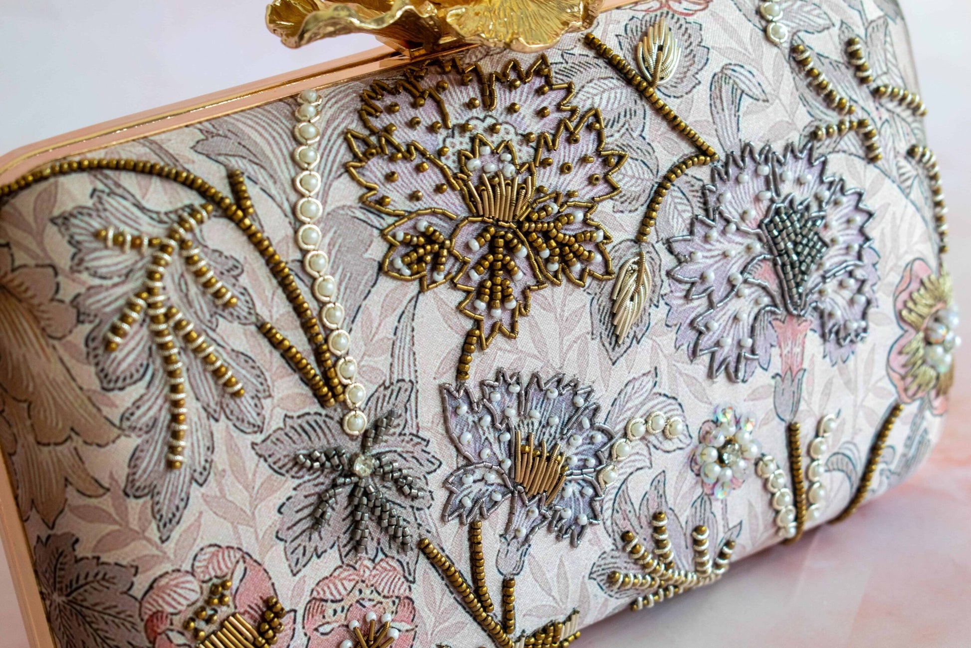 Introducing the Delilah clutch, featuring a charming floral print in soothing neutral tones. Each bag is carefully hand-embroidered with intricate details, making it a truly unique accessory. The floral clasp adds a touch of elegance, and the included shoulder strap offers convenience and versatility. Elevate your style with the timeless beauty of the Delilah clutch.