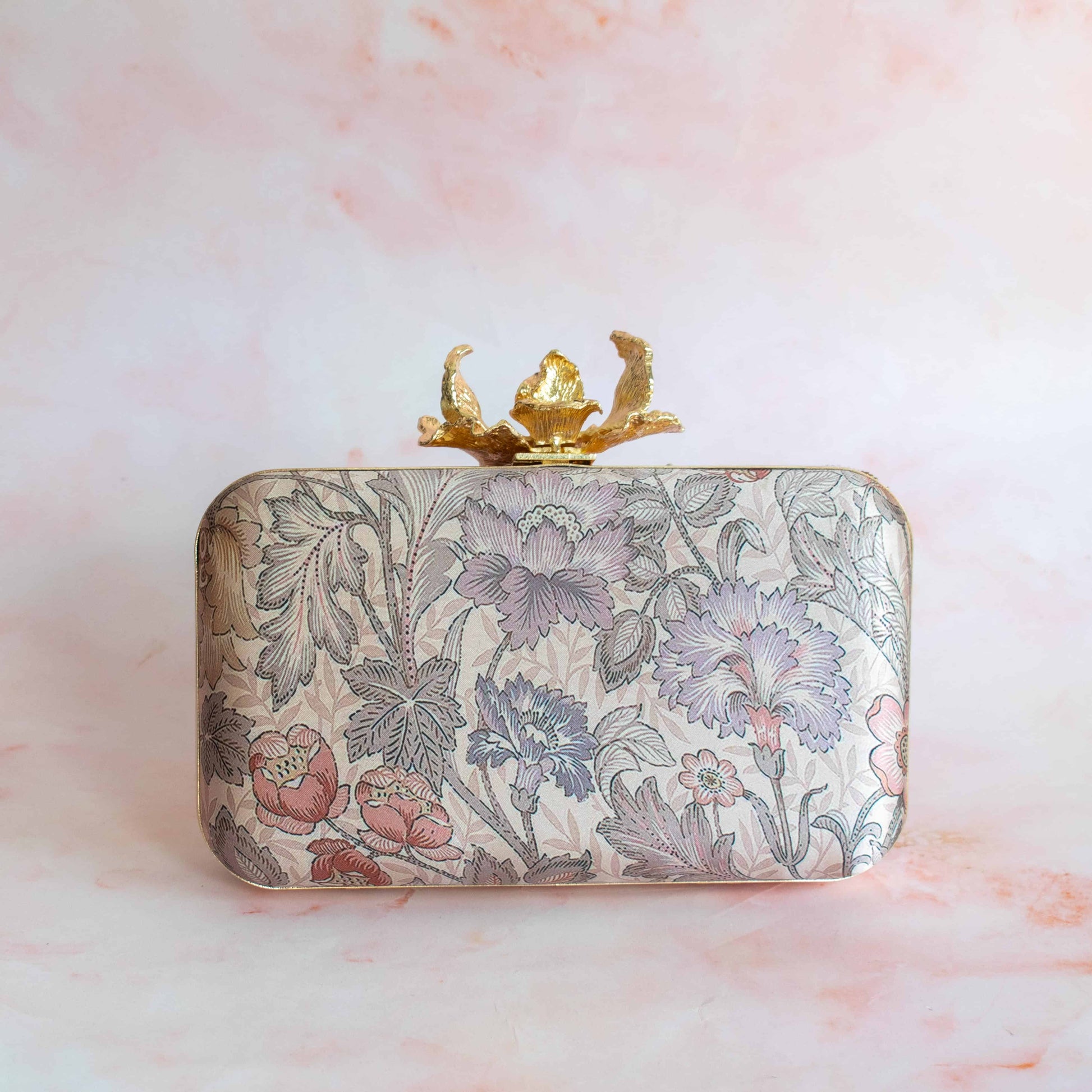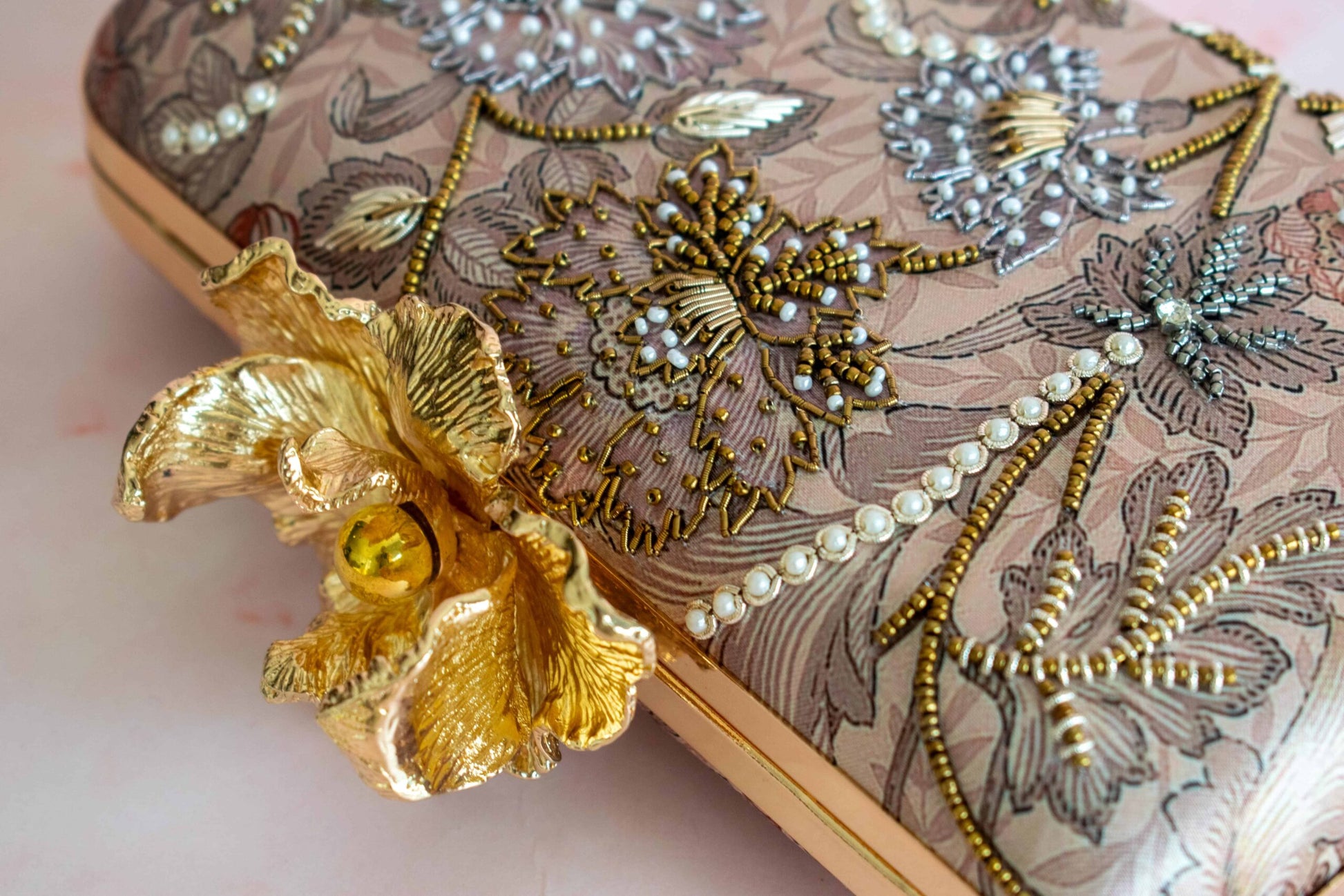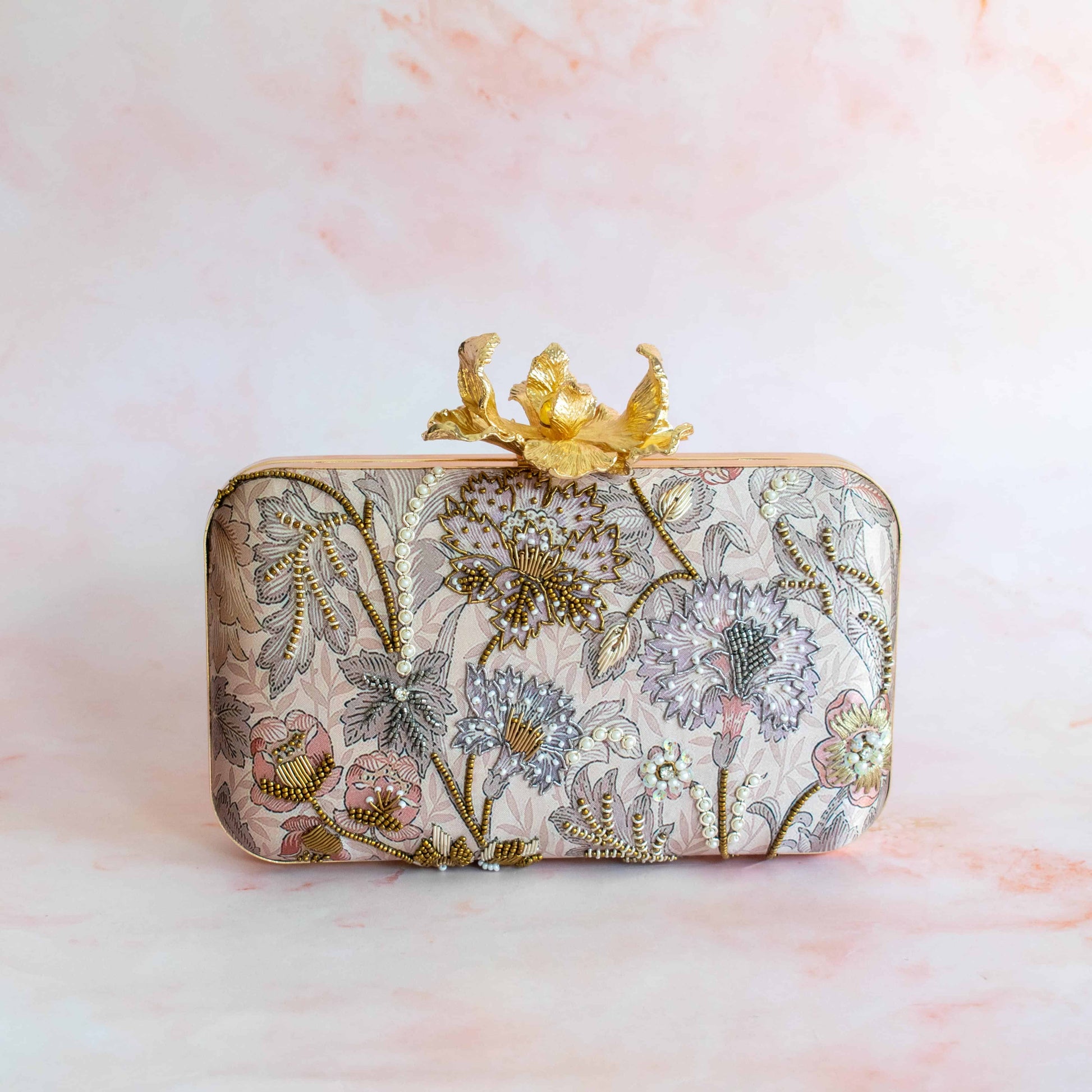 Introducing the Delilah clutch, featuring a charming floral print in soothing neutral tones. Each bag is carefully hand-embroidered with intricate details, making it a truly unique accessory. The floral clasp adds a touch of elegance, and the included shoulder strap offers convenience and versatility. Elevate your style with the timeless beauty of the Delilah clutch.