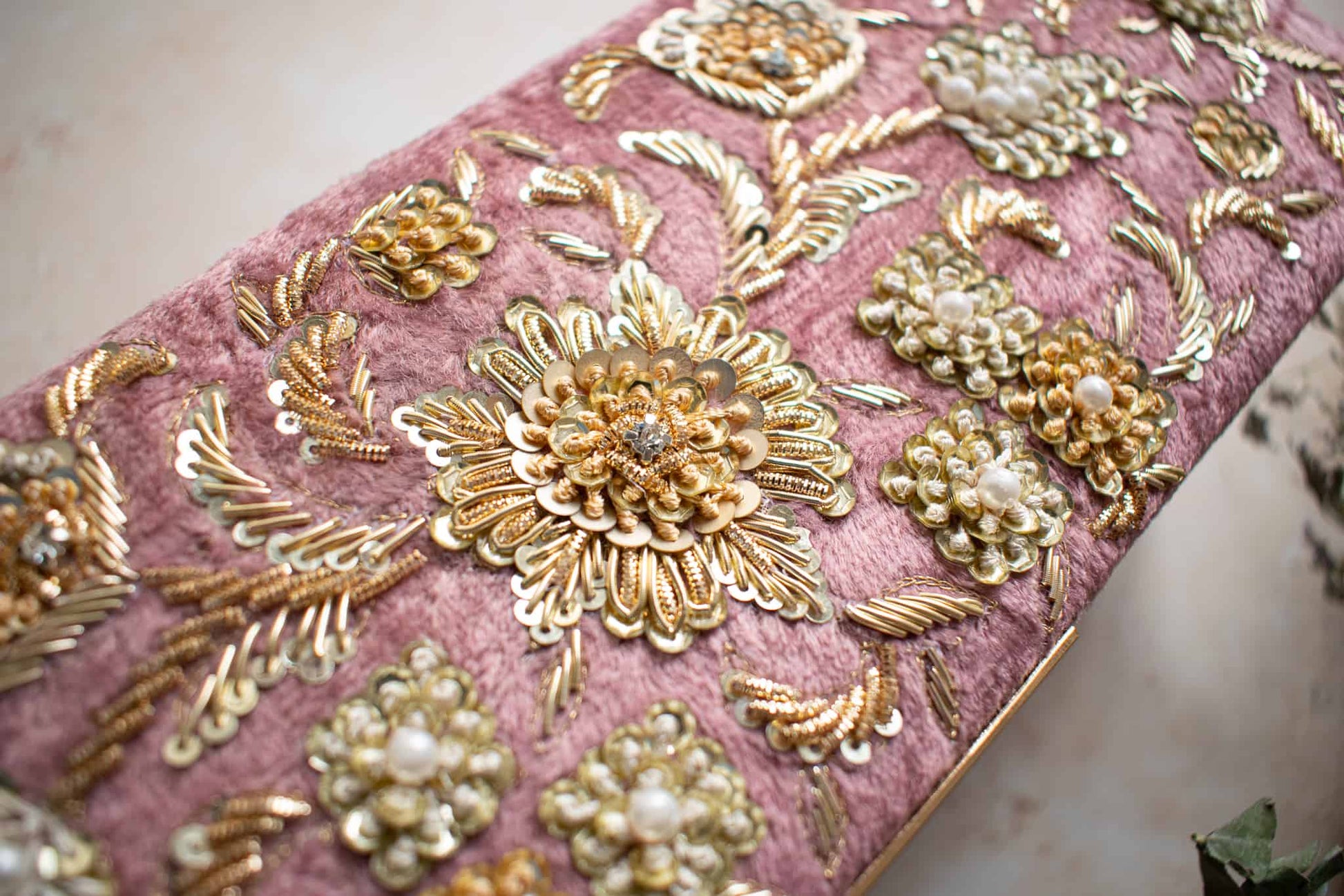 We love it in velvet but it can also be made in raw silk or faux leather with any embroidery of your choice. The box is lined with luxury suede. You can easily store 2 bangle sets inside this spacious box making it very convenient and special for your big day.