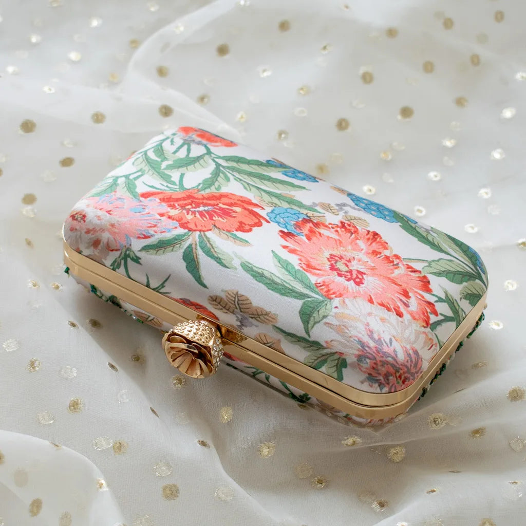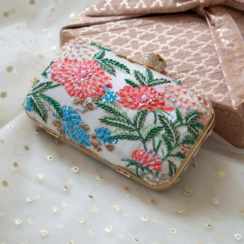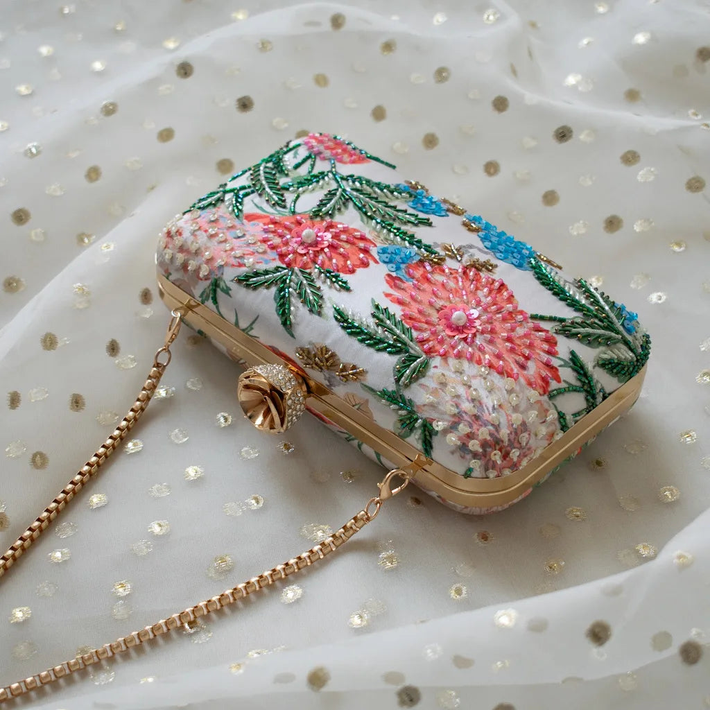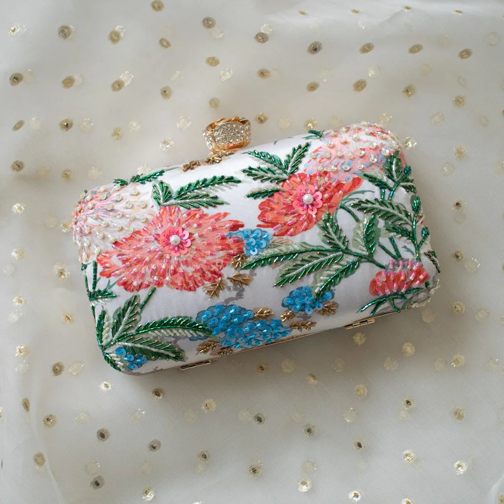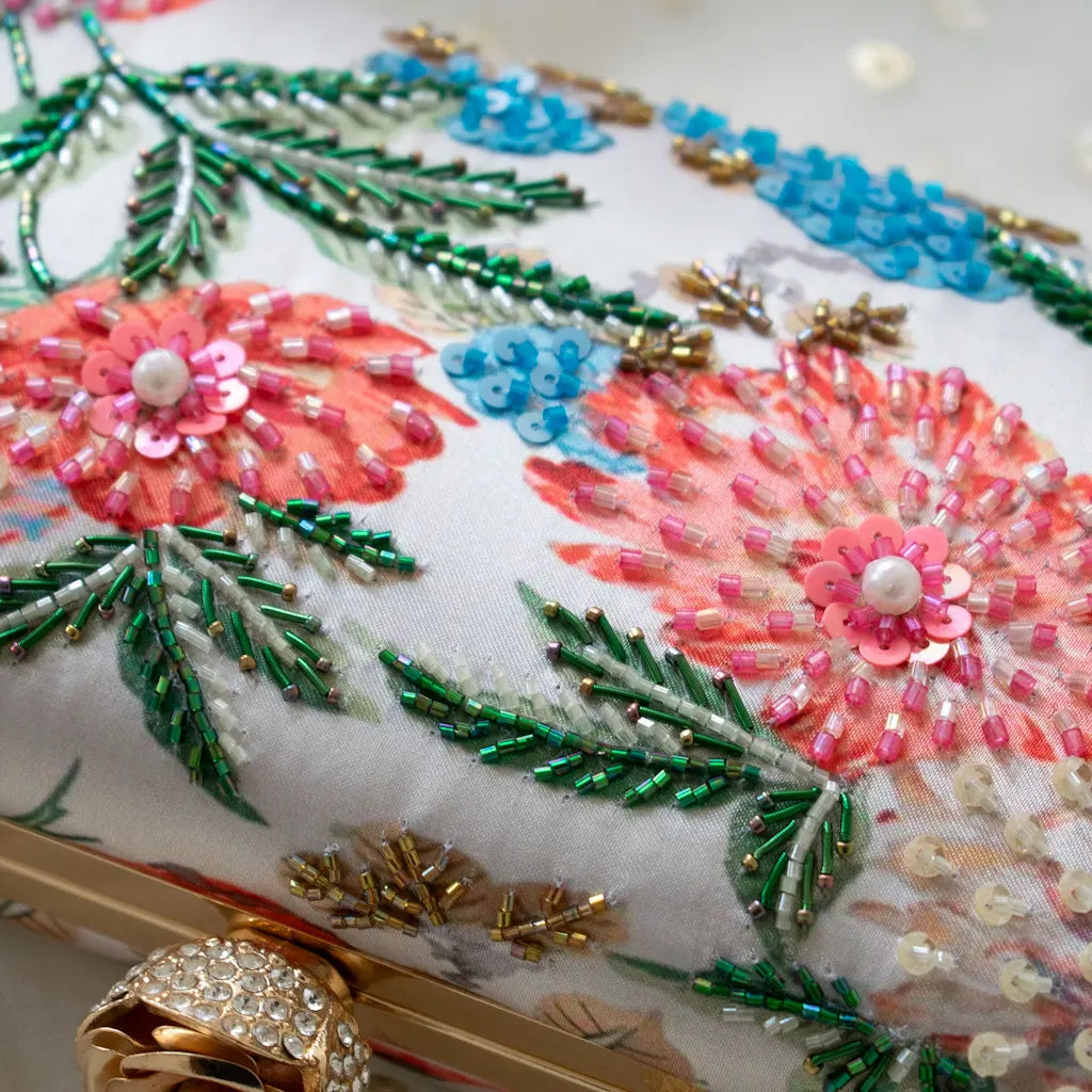 Bold, radiant, and exquisitely handcrafted, Elayna is a statement clutch by Atiya Choudhury that celebrates colour at its most luxurious. Crafted on an ivory satin silk base, this piece is richly adorned with multi-colour hand embroidery, where emerald green foliage, coral red florals, and vibrant blue accents intertwine in a striking composition.