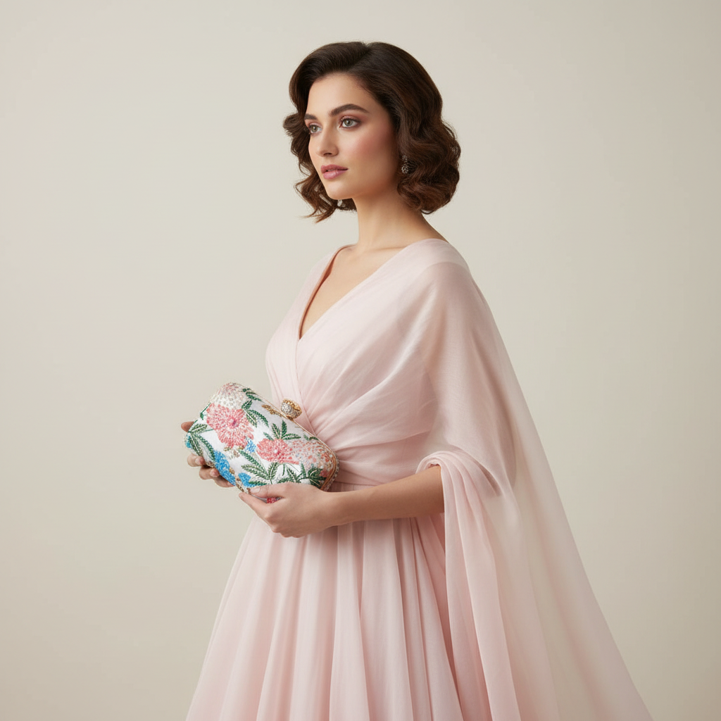 The embroidery is layered and expressive, creating depth, texture, and movement across the structured silhouette. Finished with polished gold hardware and designed to command attention, Elayna is created for evenings where elegance meets artistry.