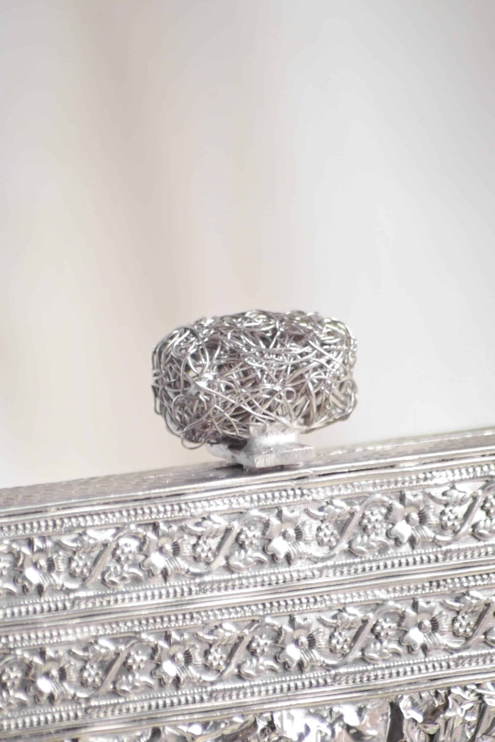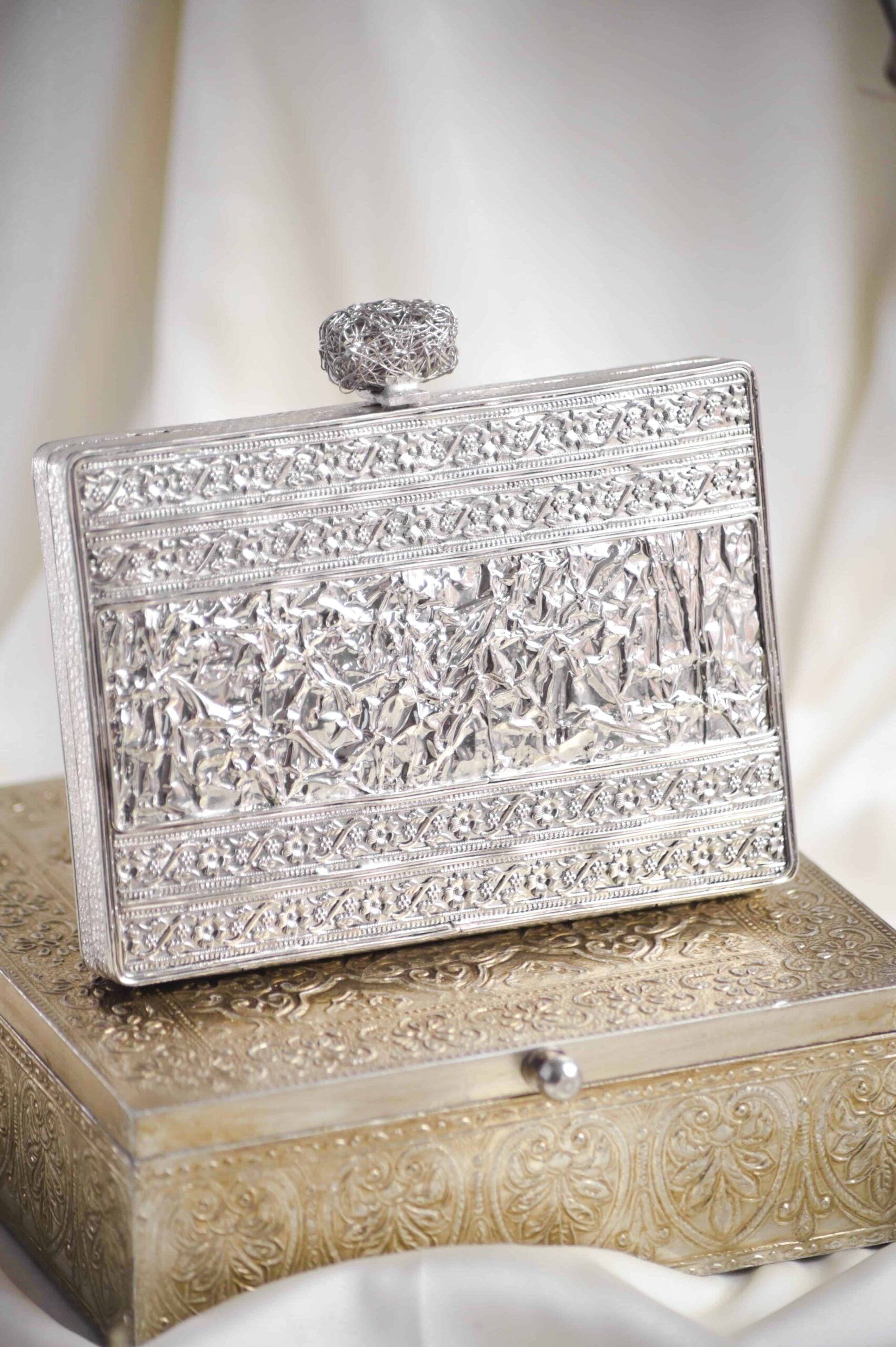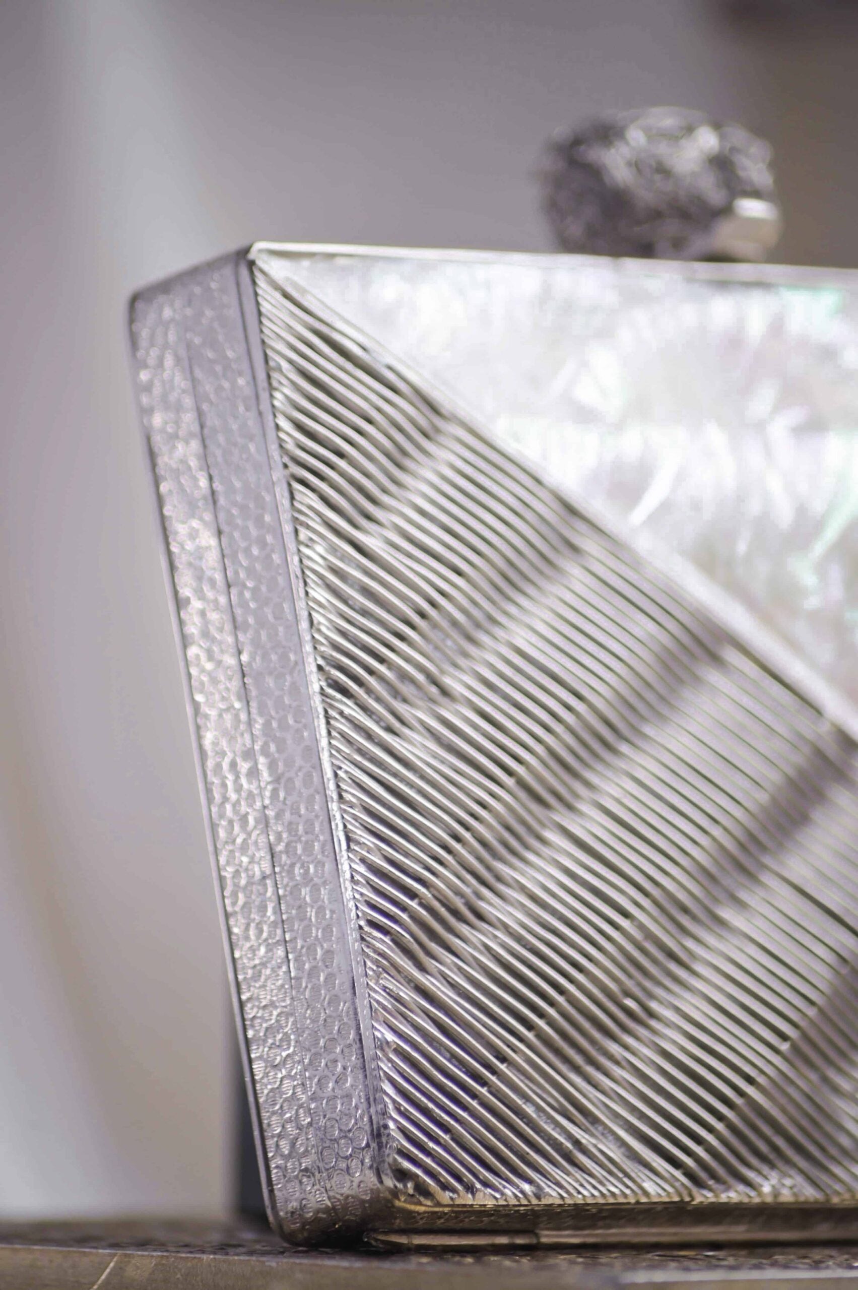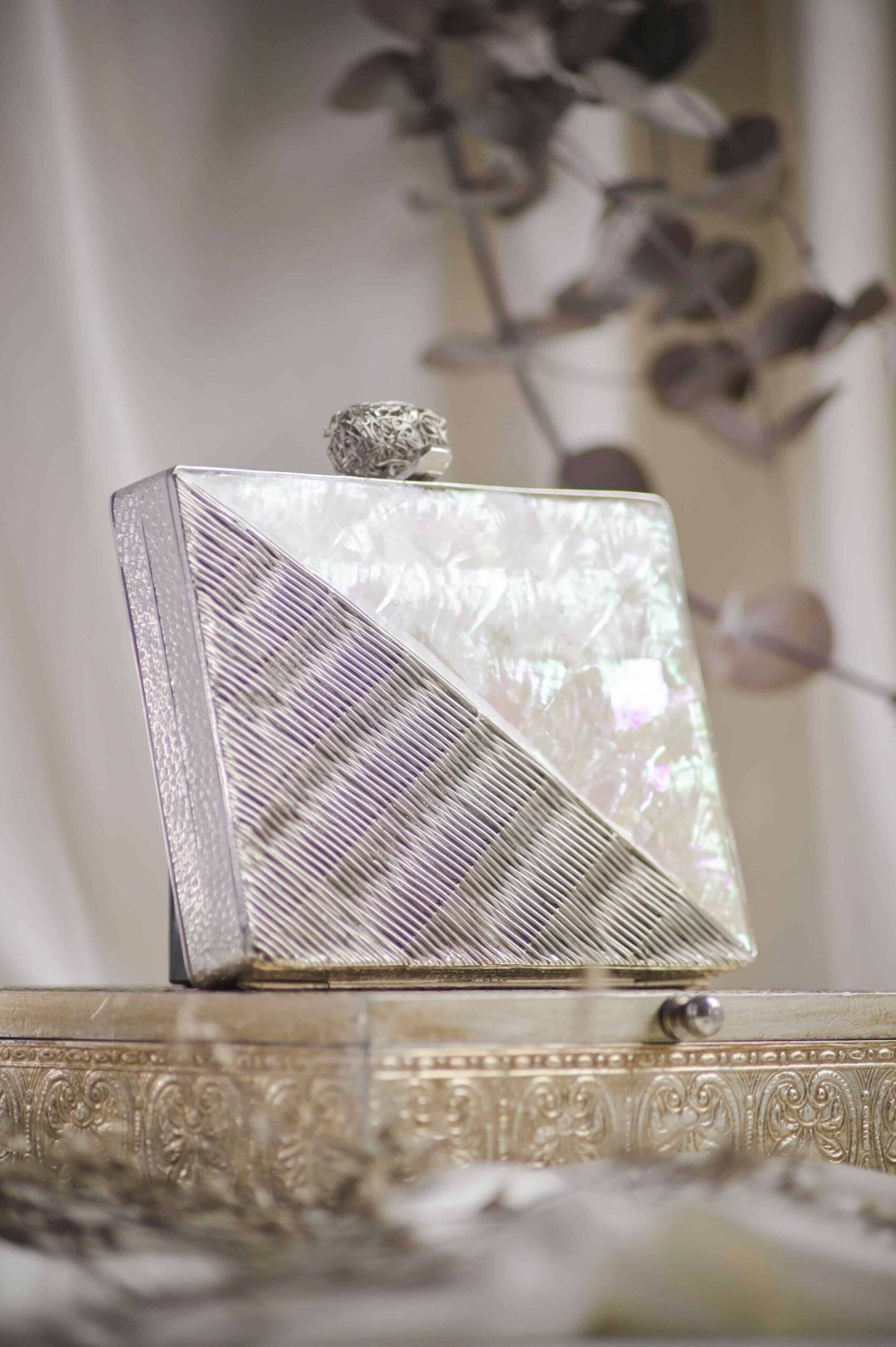 Luxury Mother of Pearl clutch bag. It's elegant, stylish and has a very unique design. Based on a silver, rectangular brass frame, intricately cut and detailed on both sides. The front side consists of a Mother of Pearl shell base and wired brass detailing. The back side is just as beautiful with silver carved work. Finished off with a silver wired bundle clasp.