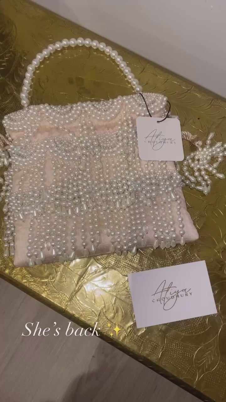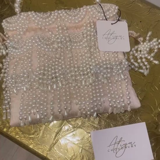 The Emelia Potli Bag is an elegant minaudière handbag crafted from luxurious nude pink silk. Designed with layers of pearls, it offers a blend of sophistication and charm. Embellished with delicate tassels, pearl latkans, and a stunning pearl handle, this potli bag is a must-have accessory for any special occasion, perfect to elevate your evening ensemble. Size: 7.5 x 5 inches