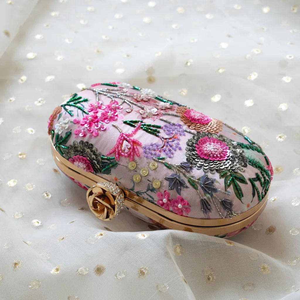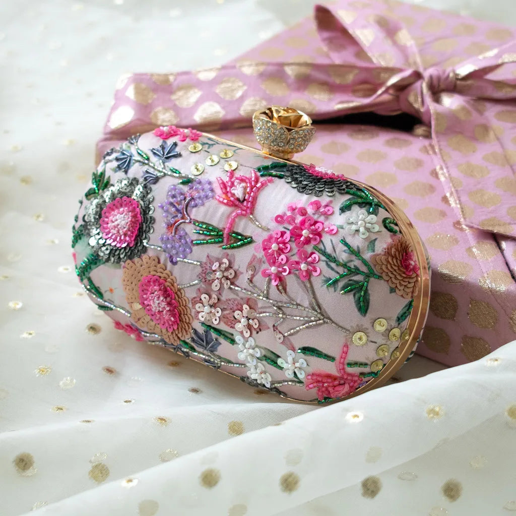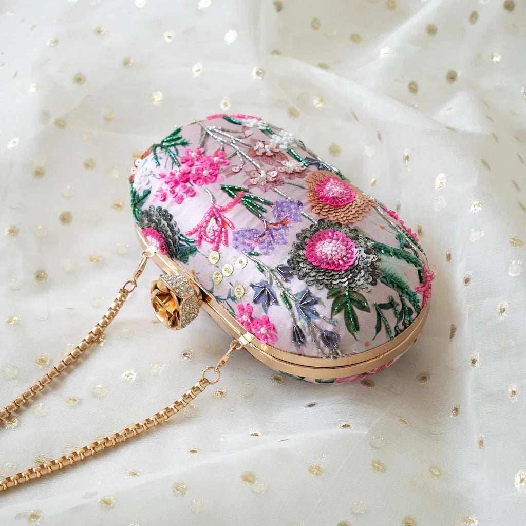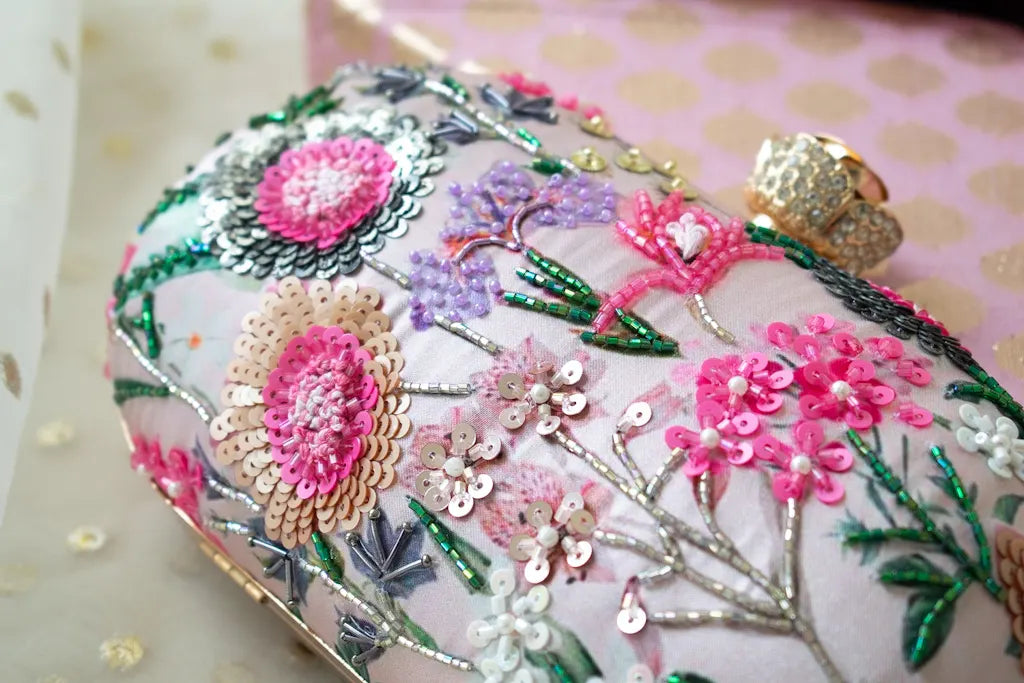 Romantic yet striking, Leila is a couture-inspired clutch by Atiya Choudhury, designed to captivate through detail and craftsmanship. Set on a soft pink satin silk base, this piece is brought to life with intricate multi-colour hand embroidery, where florals unfold in layered textures of sequins, beads, and fine thread-work.