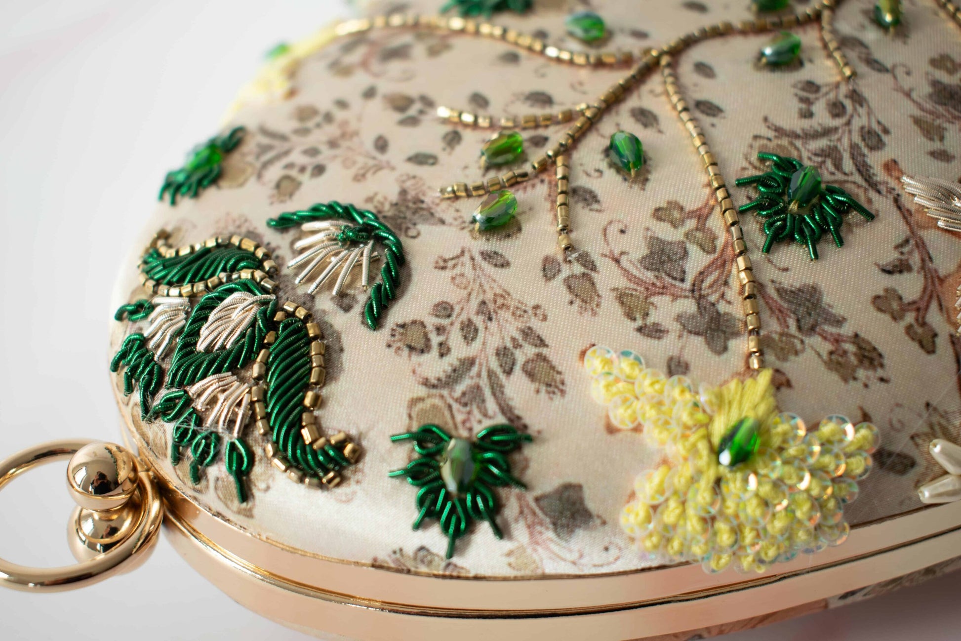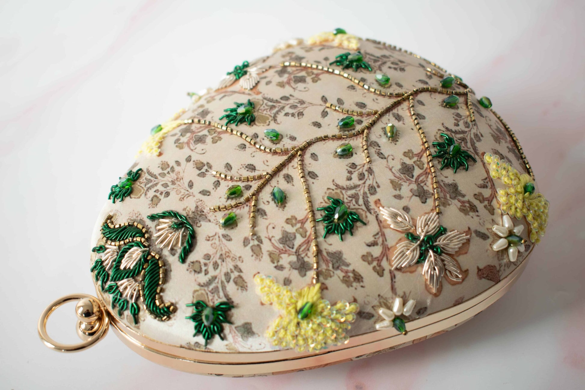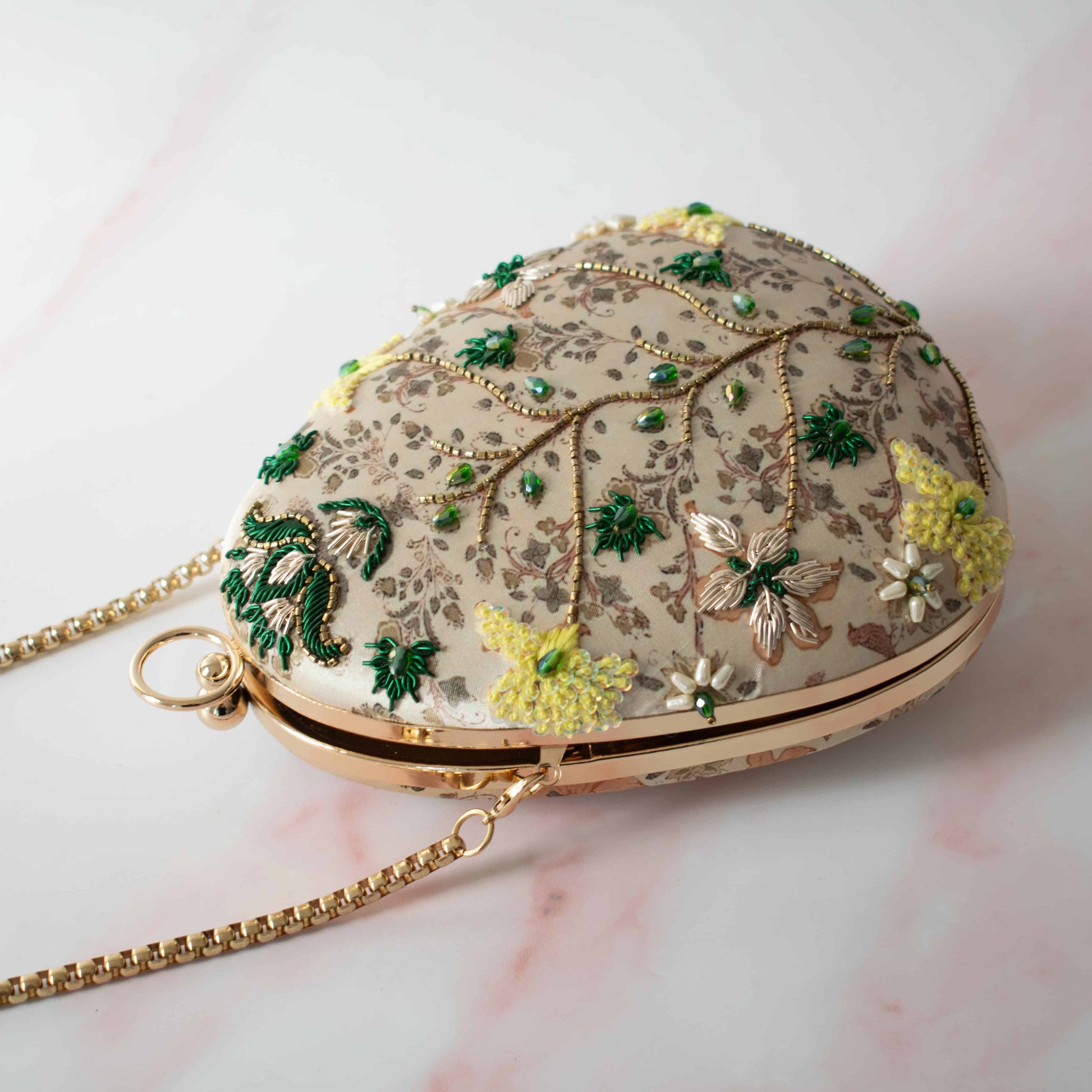 Introducing the exquisite Lyla clutch, designed to add a touch of elegance to your ensemble. This oval-shaped clutch features a stunning sage green Indian traditional print, hand-embroidered with intricate details. The shoulder chain is included for added convenience. Elevate your style with this timeless and sophisticated accessory.