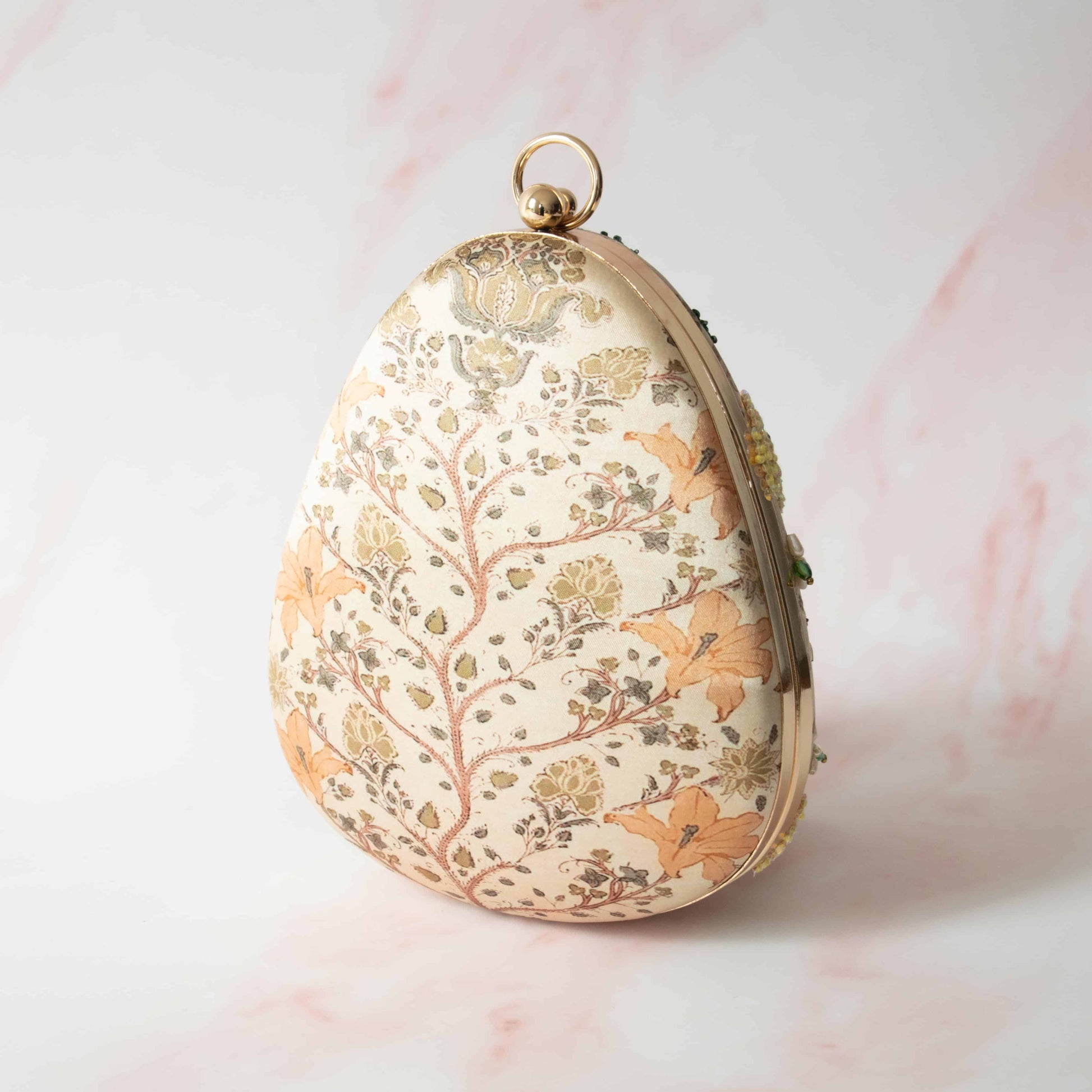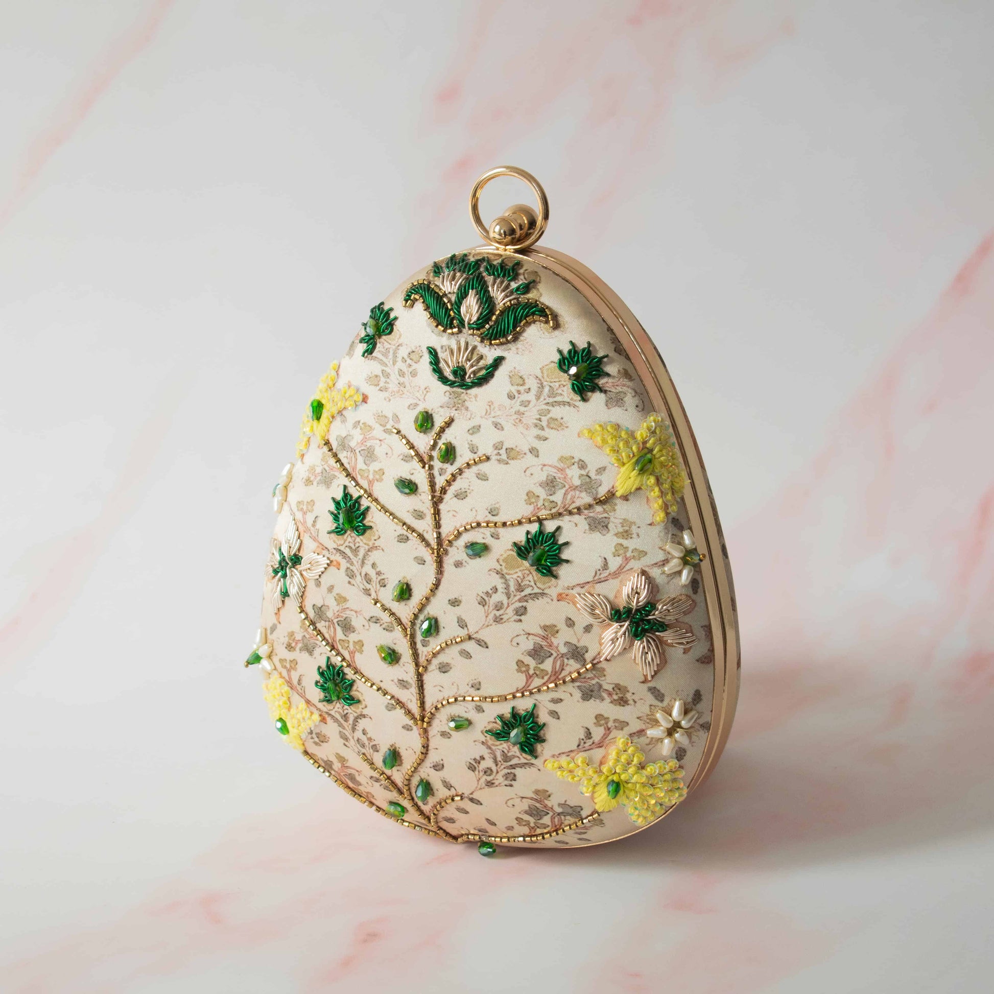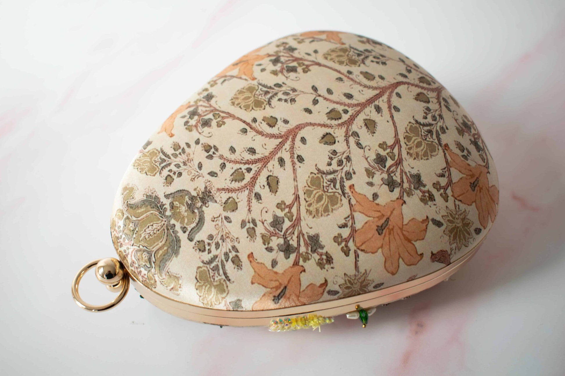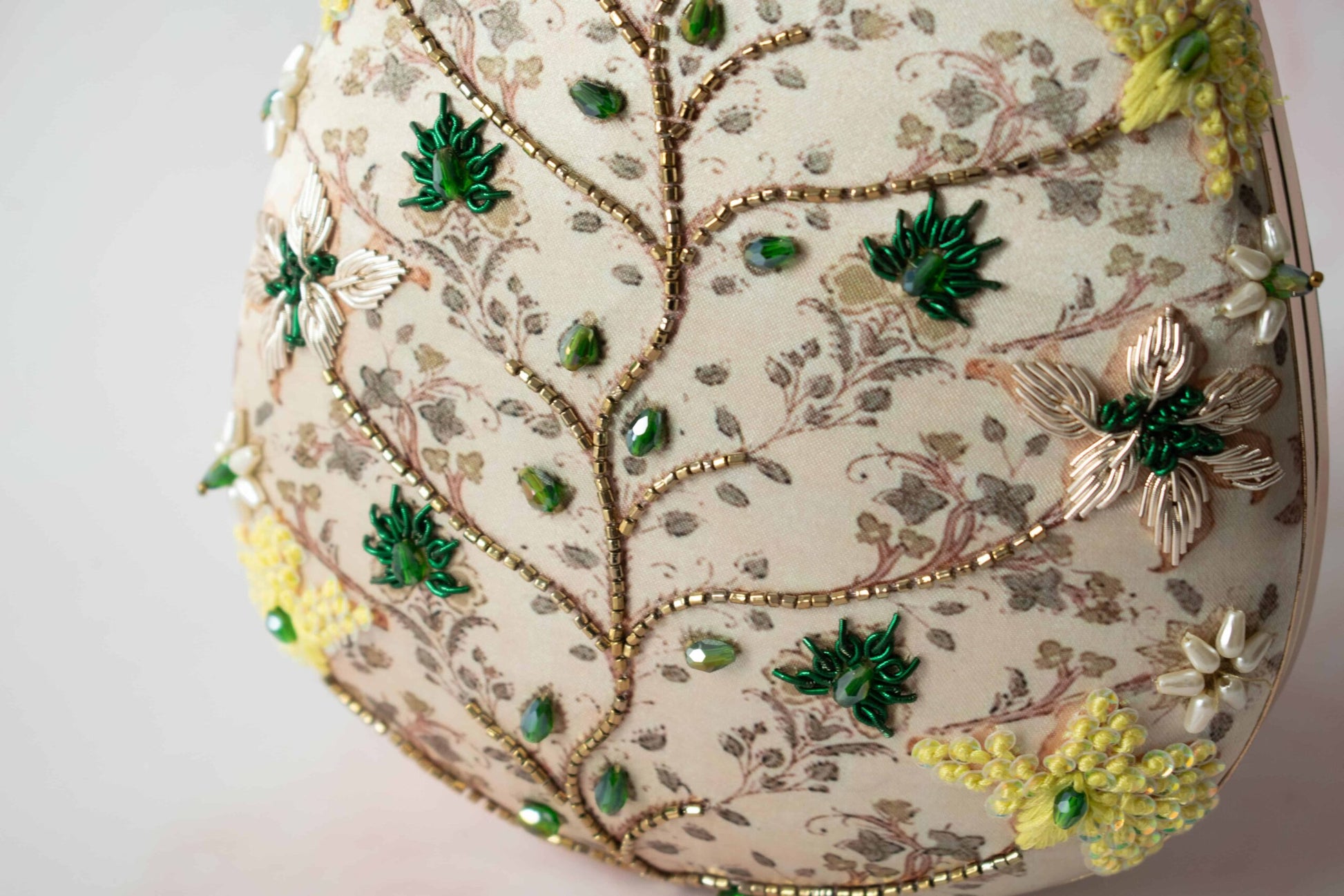 Introducing the exquisite Lyla clutch, designed to add a touch of elegance to your ensemble. This oval-shaped clutch features a stunning sage green Indian traditional print, hand-embroidered with intricate details. The shoulder chain is included for added convenience. Elevate your style with this timeless and sophisticated accessory.