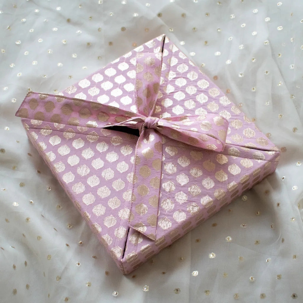 Introducing our Maharani Gift Boxes — an ode to timeless elegance and Indian craftsmanship. Each box is lovingly handcrafted using luxurious Chanderi brocade fabric, celebrated for its rich sheen, intricate weave, and royal heritage. The metallic motifs glimmer delicately against soft pastel hues, exuding a regal charm that’s perfect for the modern desi aesthetic.
