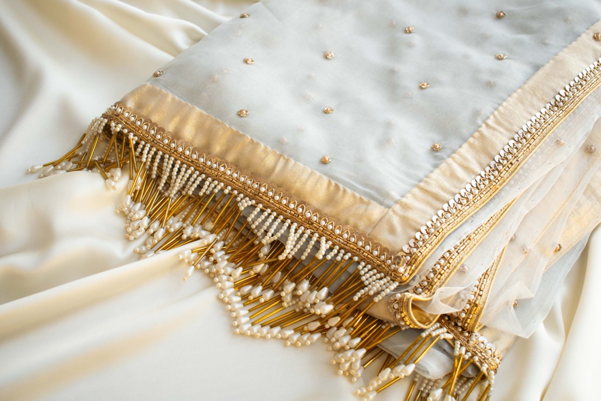 Introducing the Amelia Organza Saree in Powder Blue, a luxury piece crafted from premium organza fabric. This exquisite saree features intricate gold and pearl hand embroidery with elegant tassels on the pallu. Paired with a matching velvet blouse fabric, it's perfect for special events.