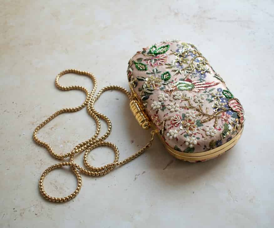 The Mumbai Dreams (Nude Pink) clutch embodies luxury with its vibrant satin silk base and intricate hand embroidery. Adorned with zardozi, sequins, and scattered pearls, it's a fashion-forward accessory perfect for summer outfits. The included shoulder chain adds versatility, making it an elegant choice for both day and evening occasions. Measuring 7.5 by 4 inches, it's compact yet eye-catching.