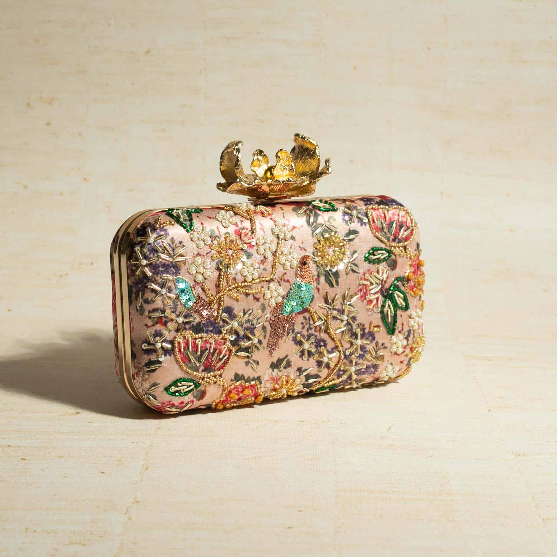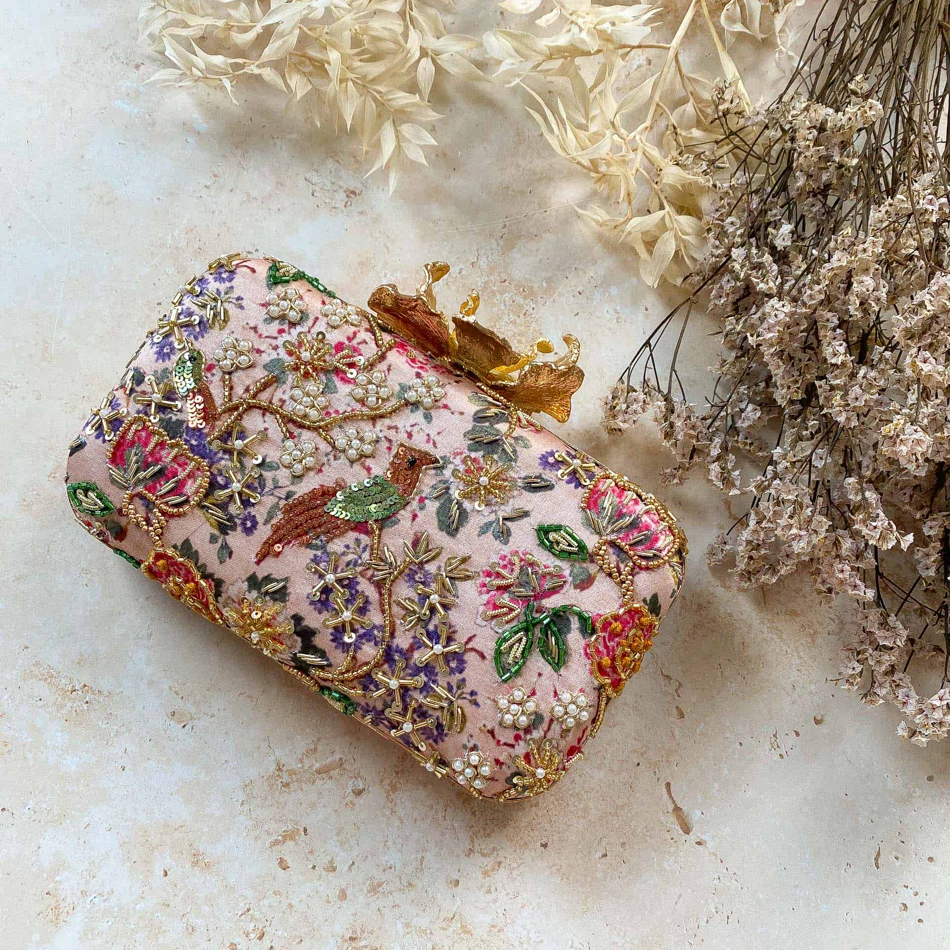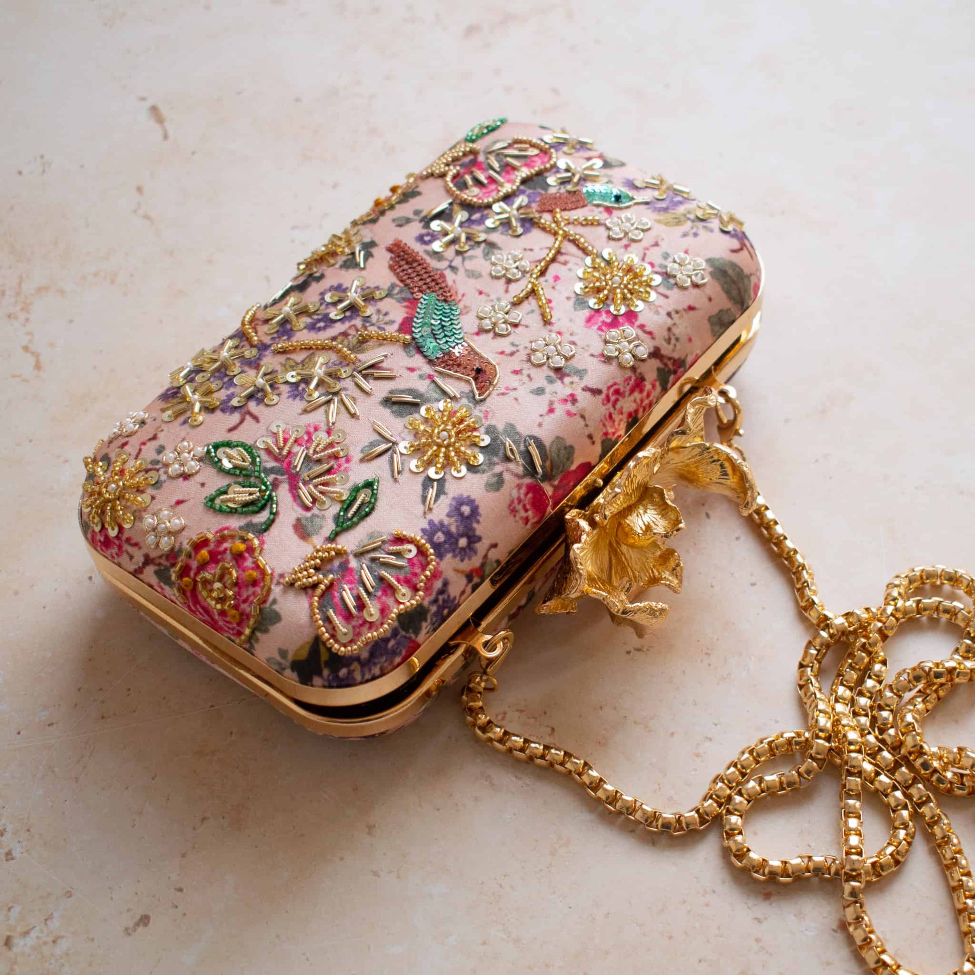 An exquisite accessory for summer, showcasing vibrant satin silk, hand-embroidered zardozi, and scattered pearls. The delicate floral clasp adds elegance, while the included shoulder chain enhances versatility. Compact yet chic, this 8x4-inch handbag elevates your look with its sophisticated, fashionable finish, embodying timeless elegance and modern style.