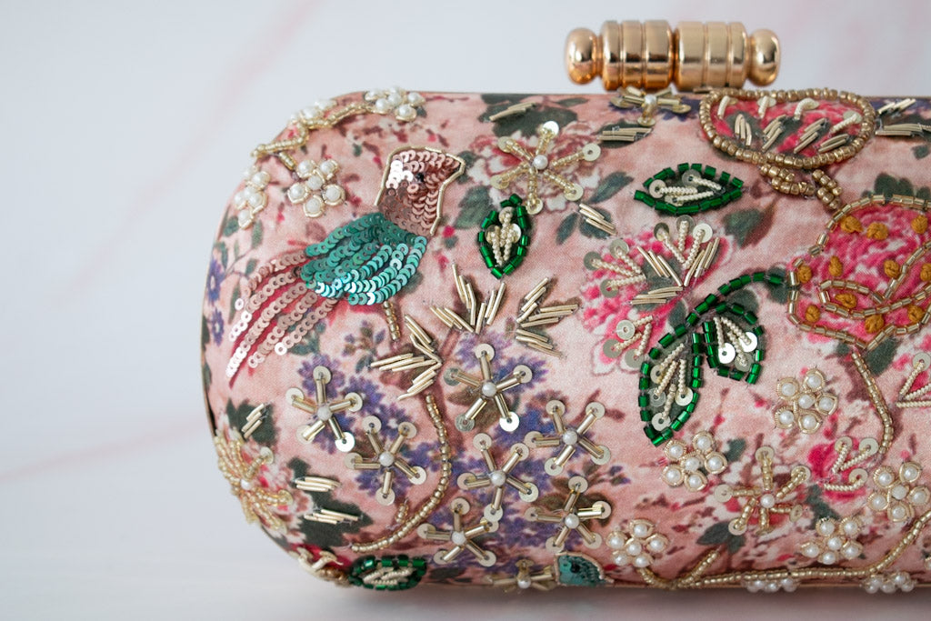 The Mumbai Dreams (Nude Pink) clutch embodies luxury with its vibrant satin silk base and intricate hand embroidery. Adorned with zardozi, sequins, and scattered pearls, it's a fashion-forward accessory perfect for summer outfits. The included shoulder chain adds versatility, making it an elegant choice for both day and evening occasions. Measuring 7.5 by 4 inches, it's compact yet eye-catching.