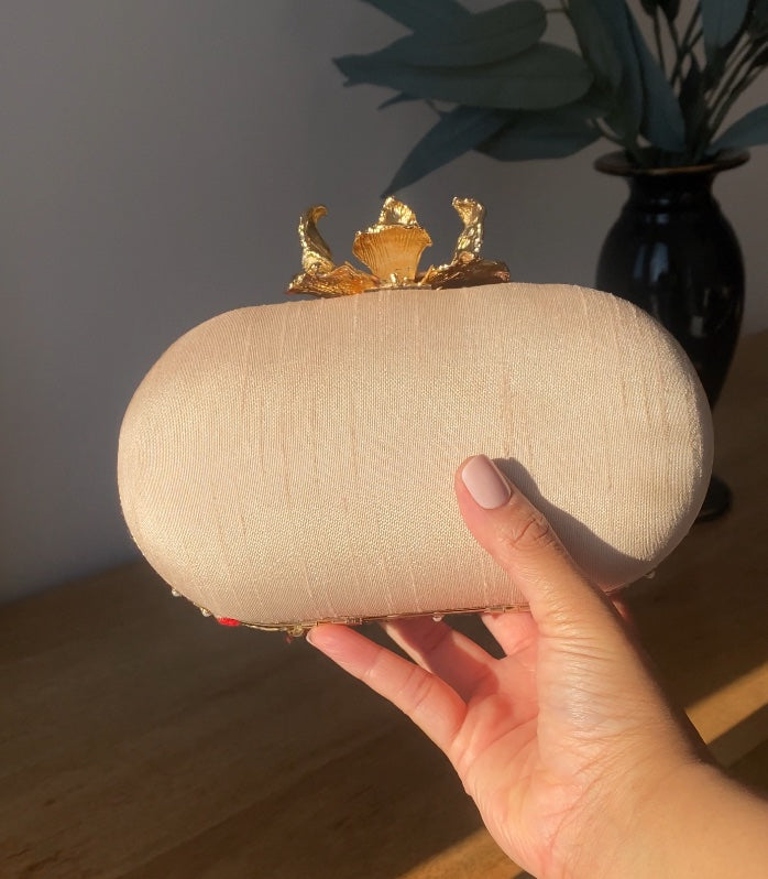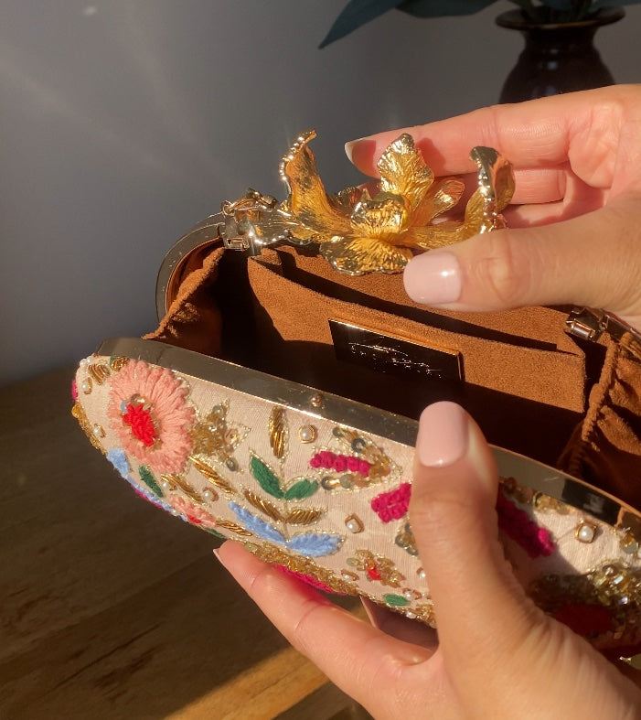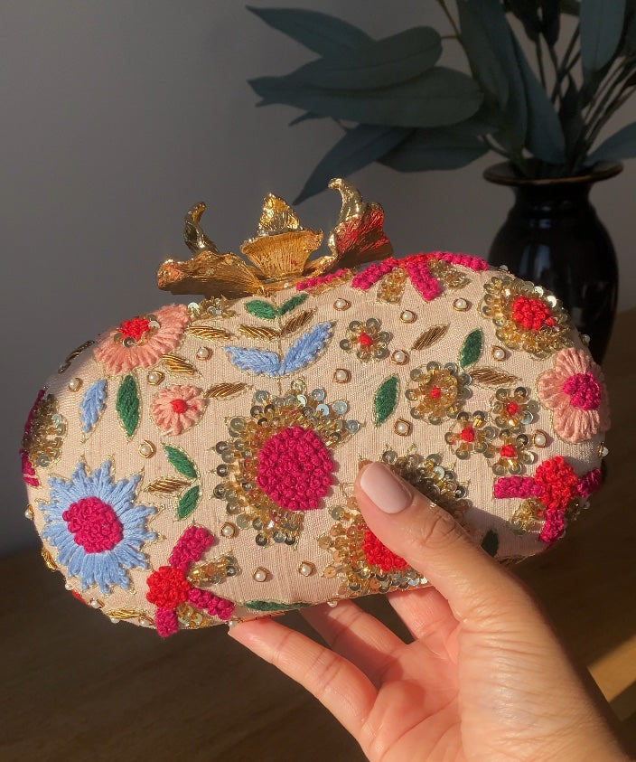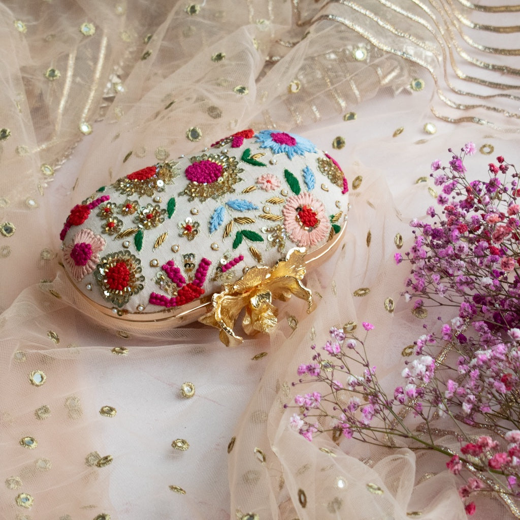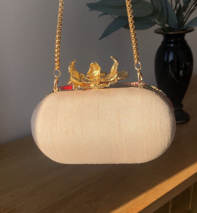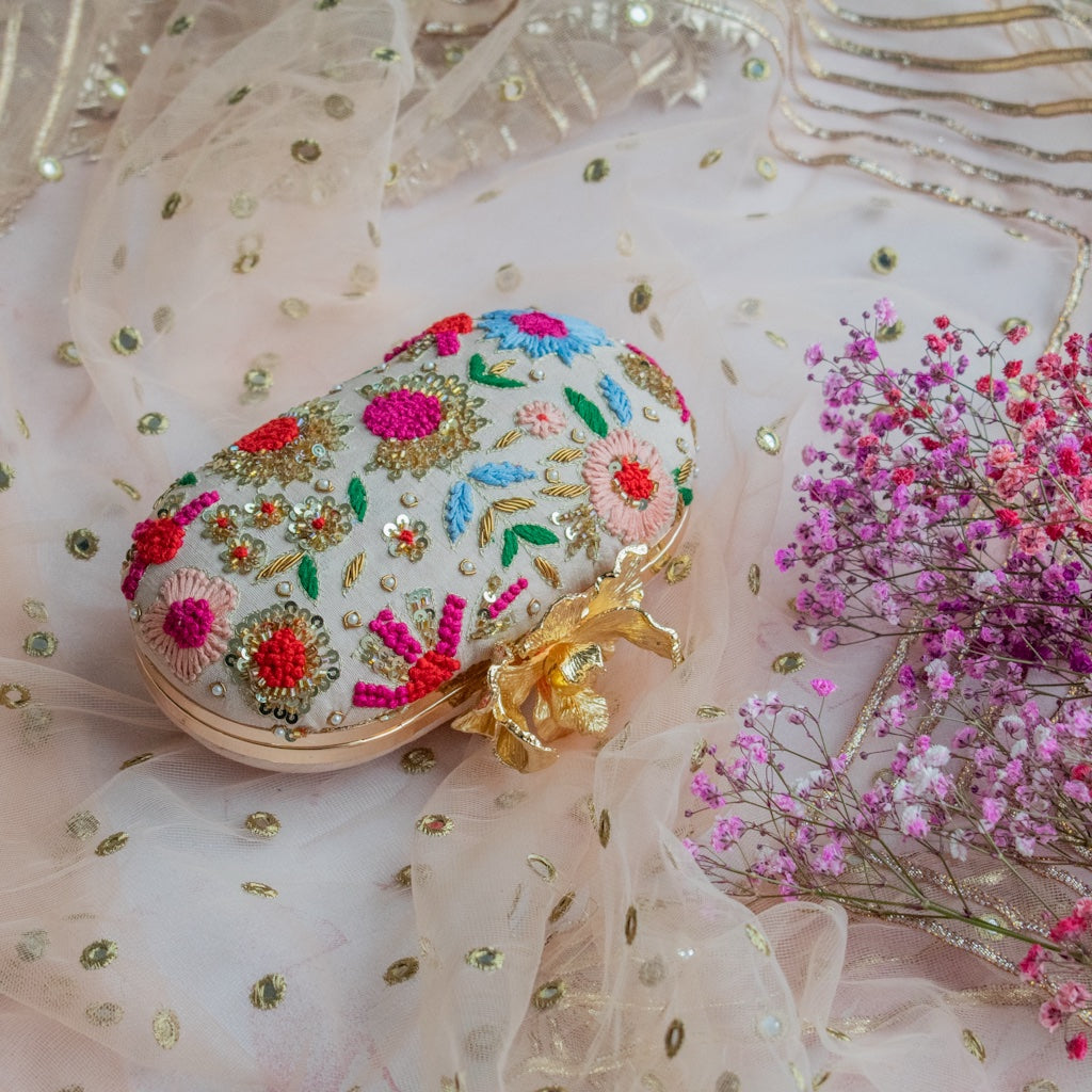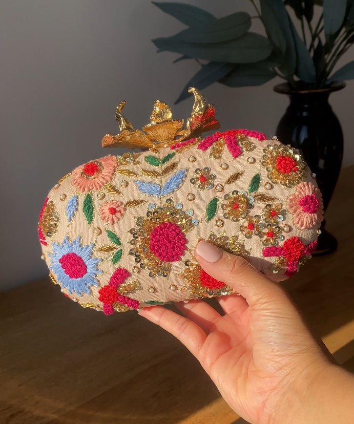 Introducing the Nude Pink Bloom, an exquisite silk accessory that effortlessly enhances any outfit. This oval-shaped clutch, adorned with vibrant multi-color floral embroidery, radiates elegance and charm. Whether you wear it as a clutch or with the included shoulder chain, this beautiful handbag is perfect for those seeking a chic, sophisticated, and eye-catching addition to their collection.