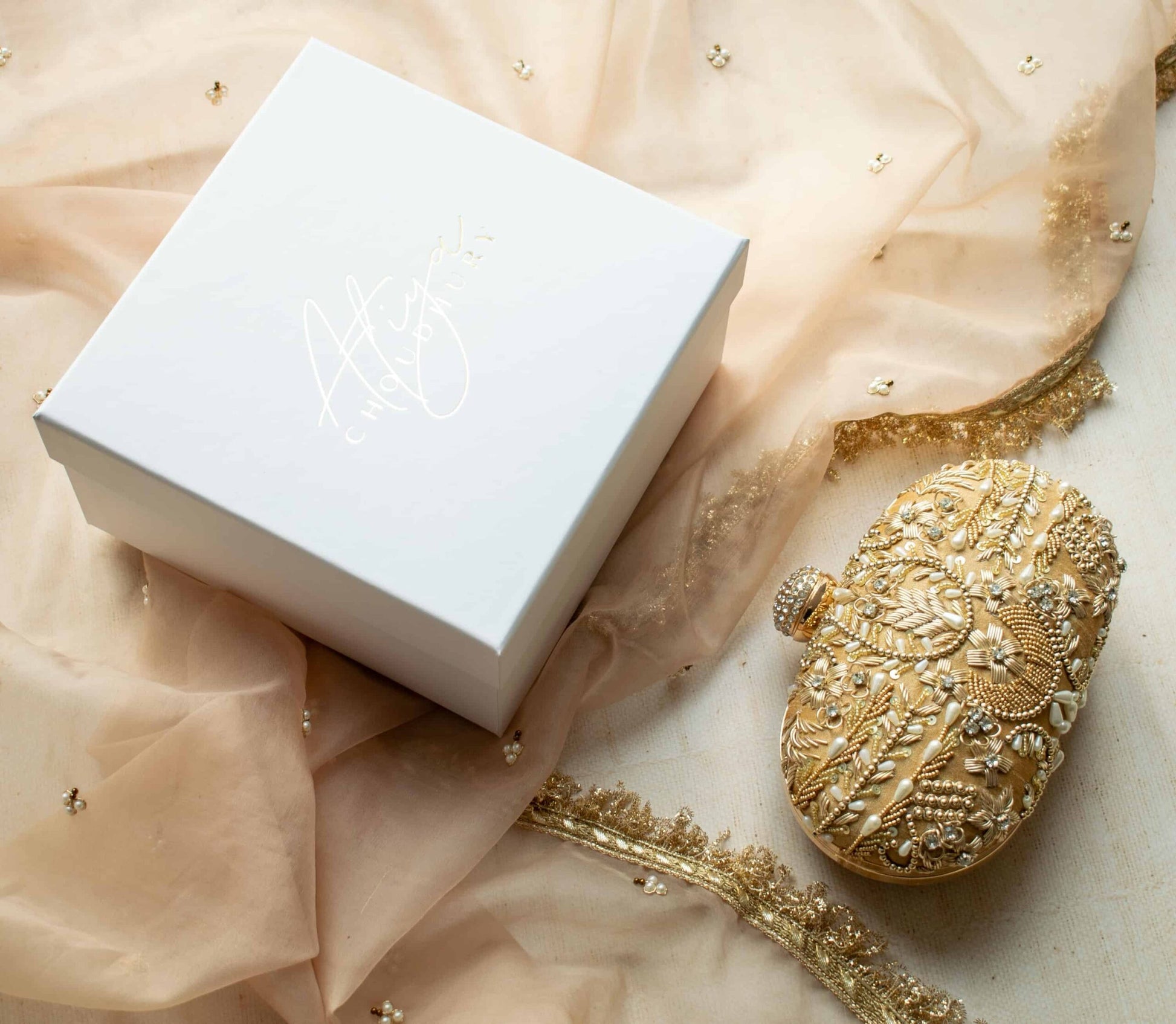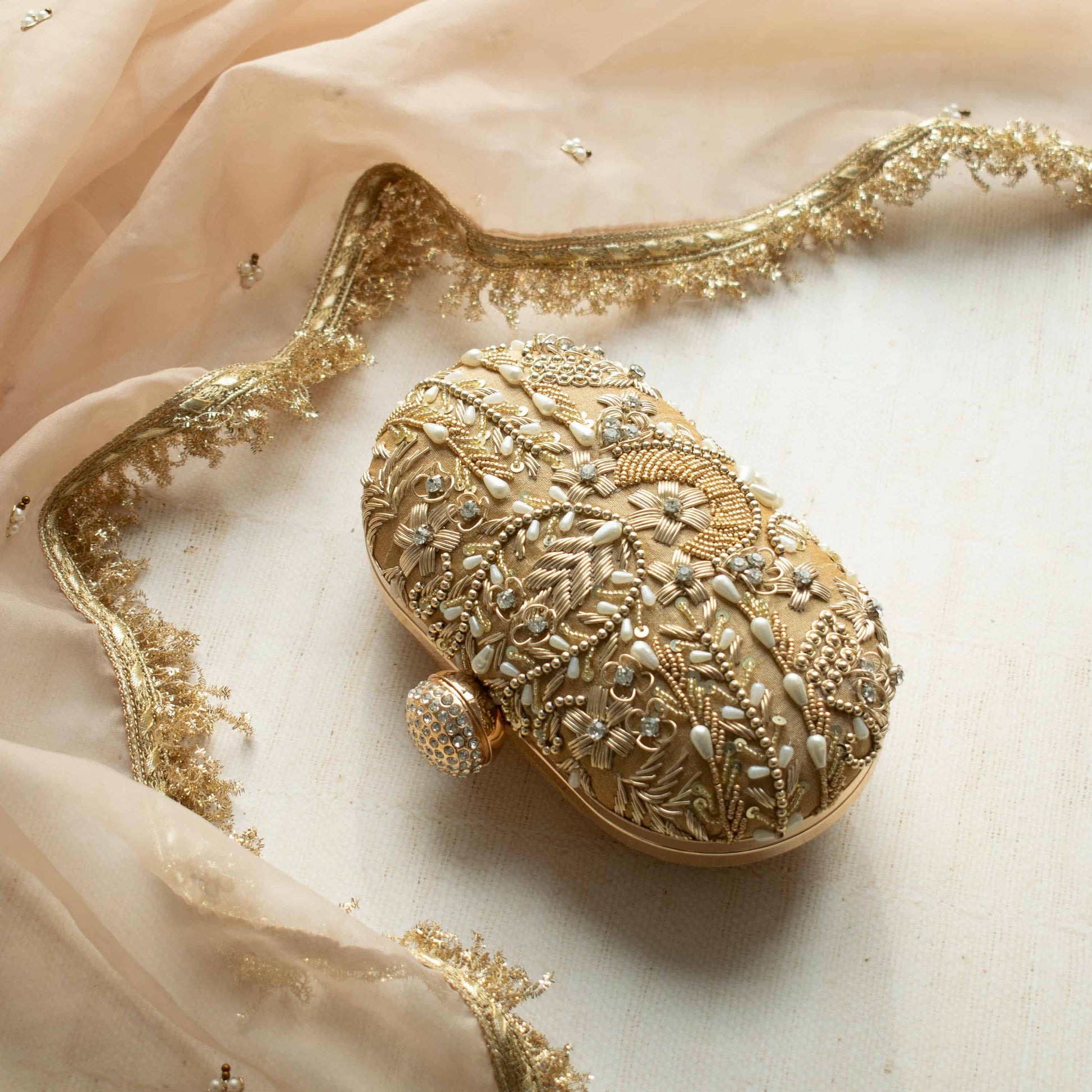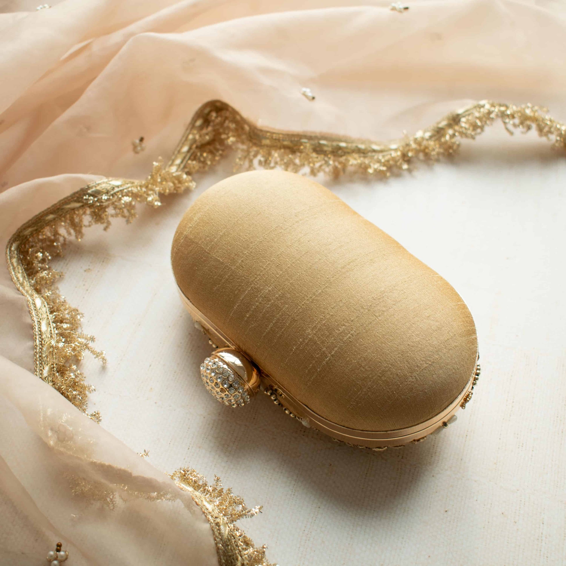 Introducing the Aashna (Deep Gold) clutch, a stunning minaudière crafted from luxurious deep gold silk. This elegant piece, with its oval shape, is intricately adorned with zardozi embroidery, shimmering pearls, and dazzling sequins. At 7 x 4 inches, it’s the perfect statement accessory for any special occasion. Elevate your style with this exquisite, premium-quality piece.