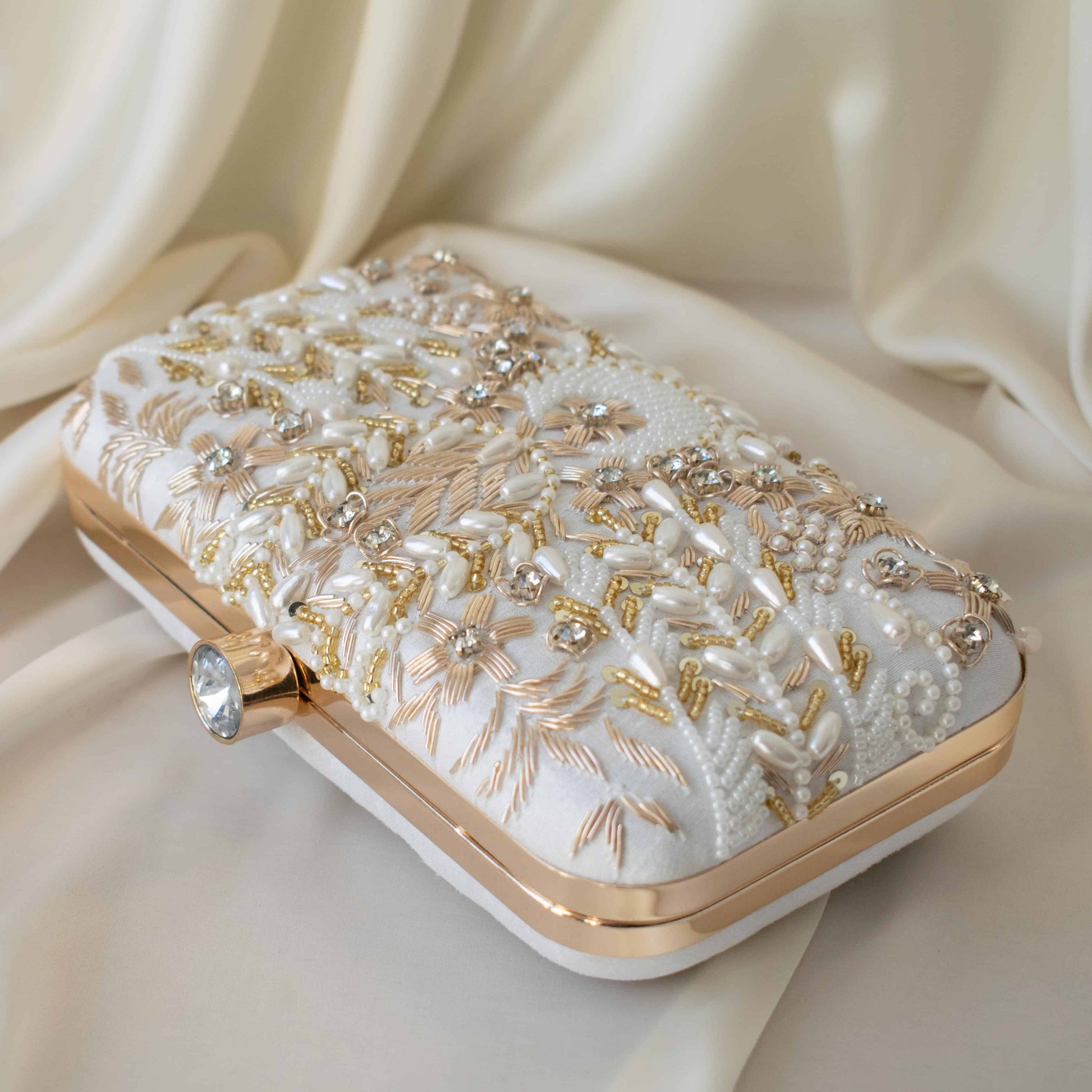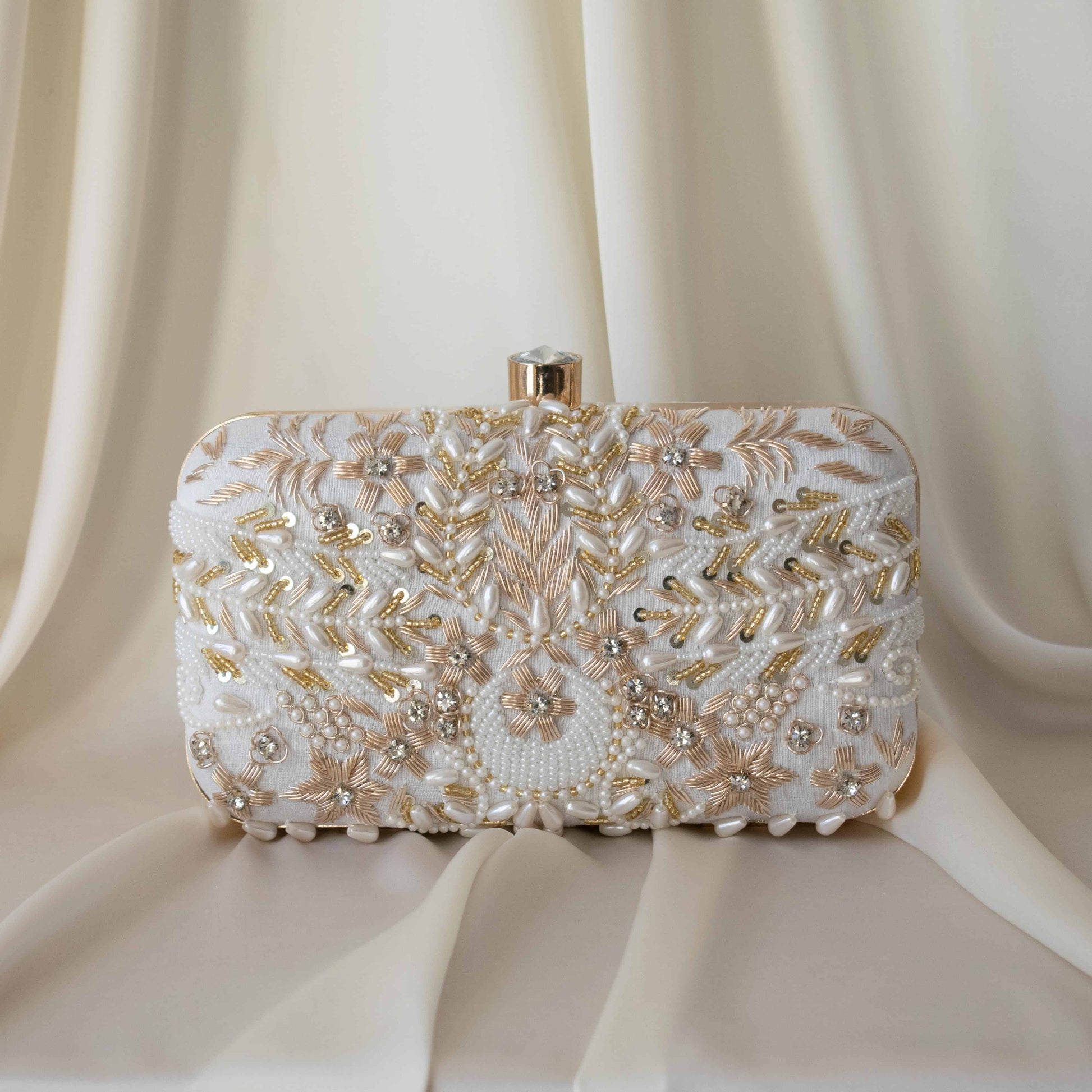 A very beautiful ivory silk, rectangular shaped clutch heavily embellished with zardozi, pearls and sequins.