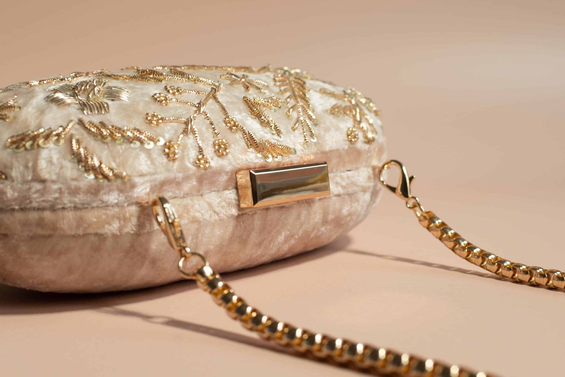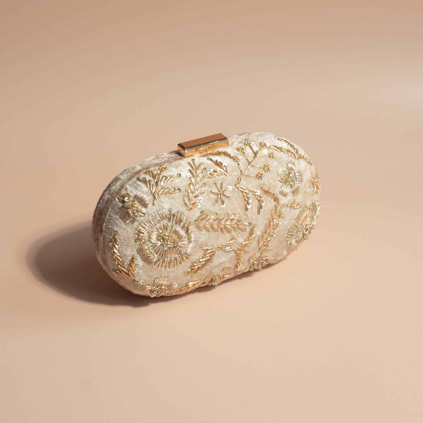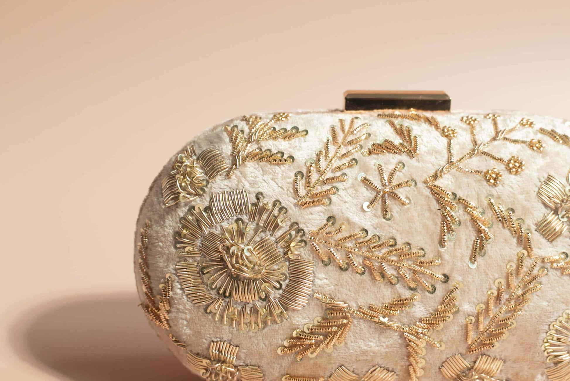 The clutch is based on rich velvet and embroidered with zardozi work. The frame is covered giving the clutch a more luxe feel.