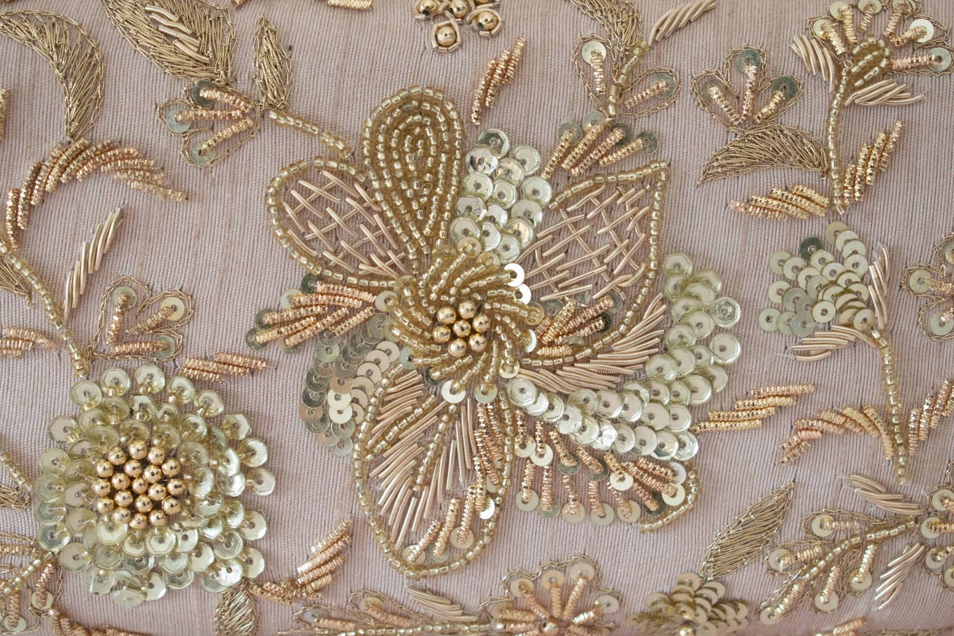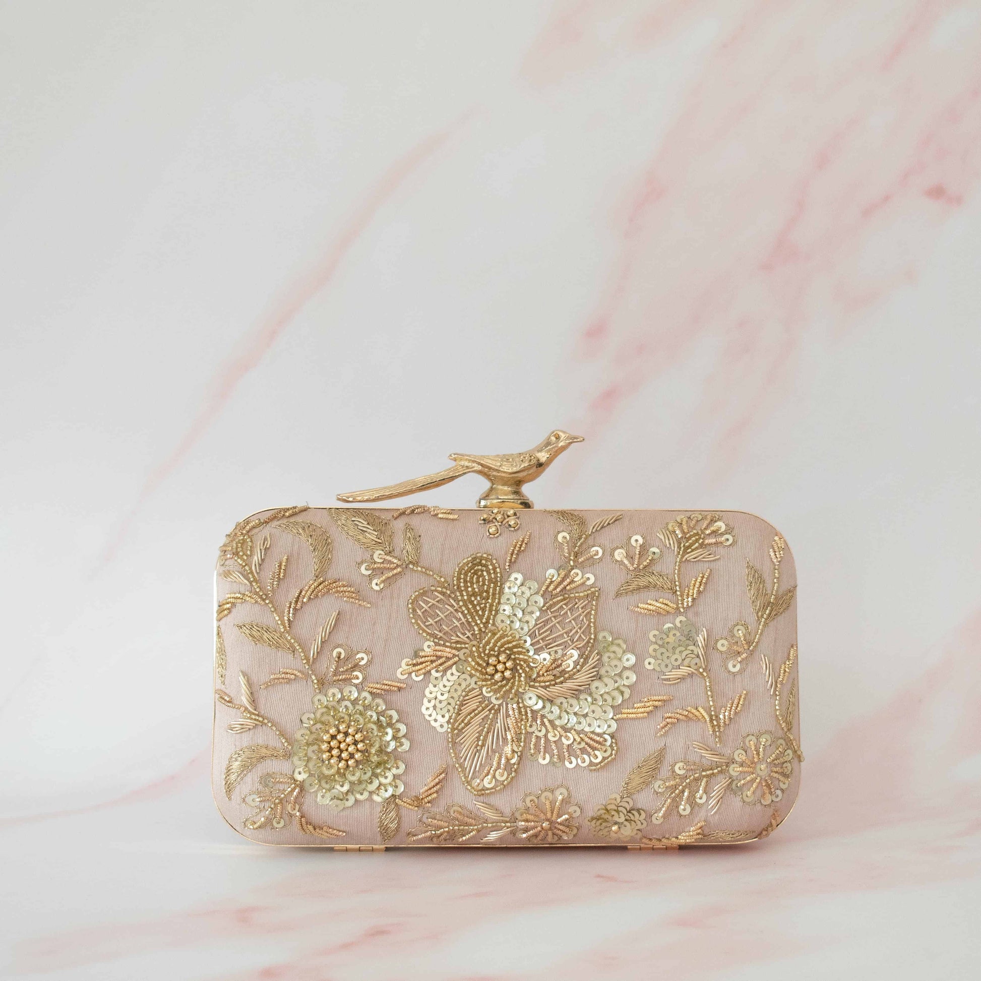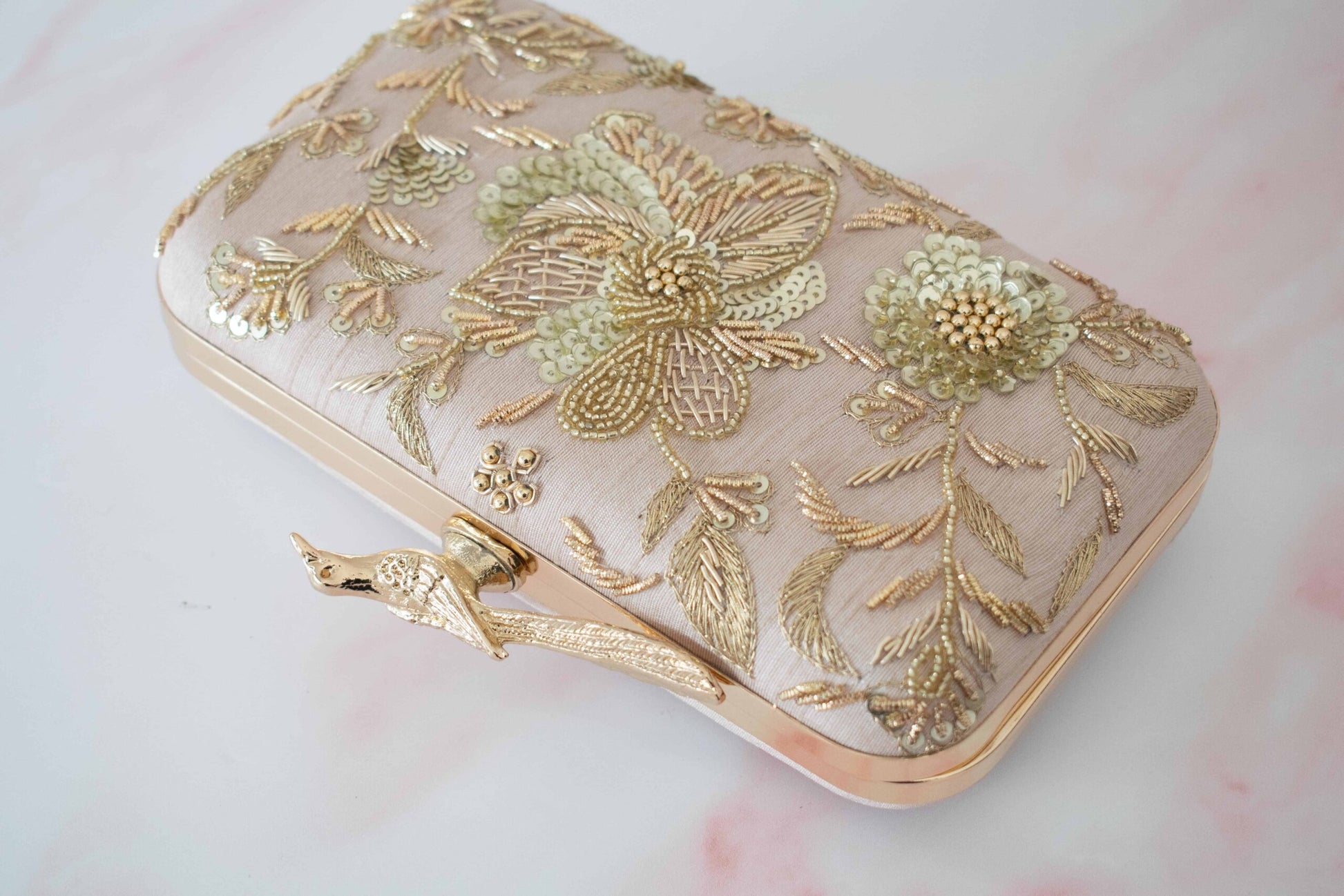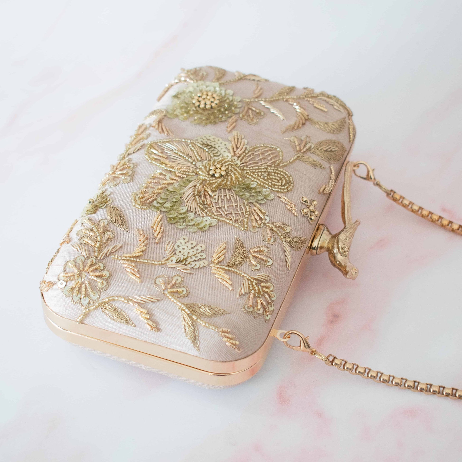 Introducing Arisha (Nude) – a stylish silk clutch perfect for unique tastes. Adorned with luxurious gold floral embroidery and a chic bird clasp, this clutch is both elegant and eye-catching. Sized at 8 x 4 inches and includes a shoulder chain for versatile wear. Perfect for adding a touch of sophistication to any outfit.
