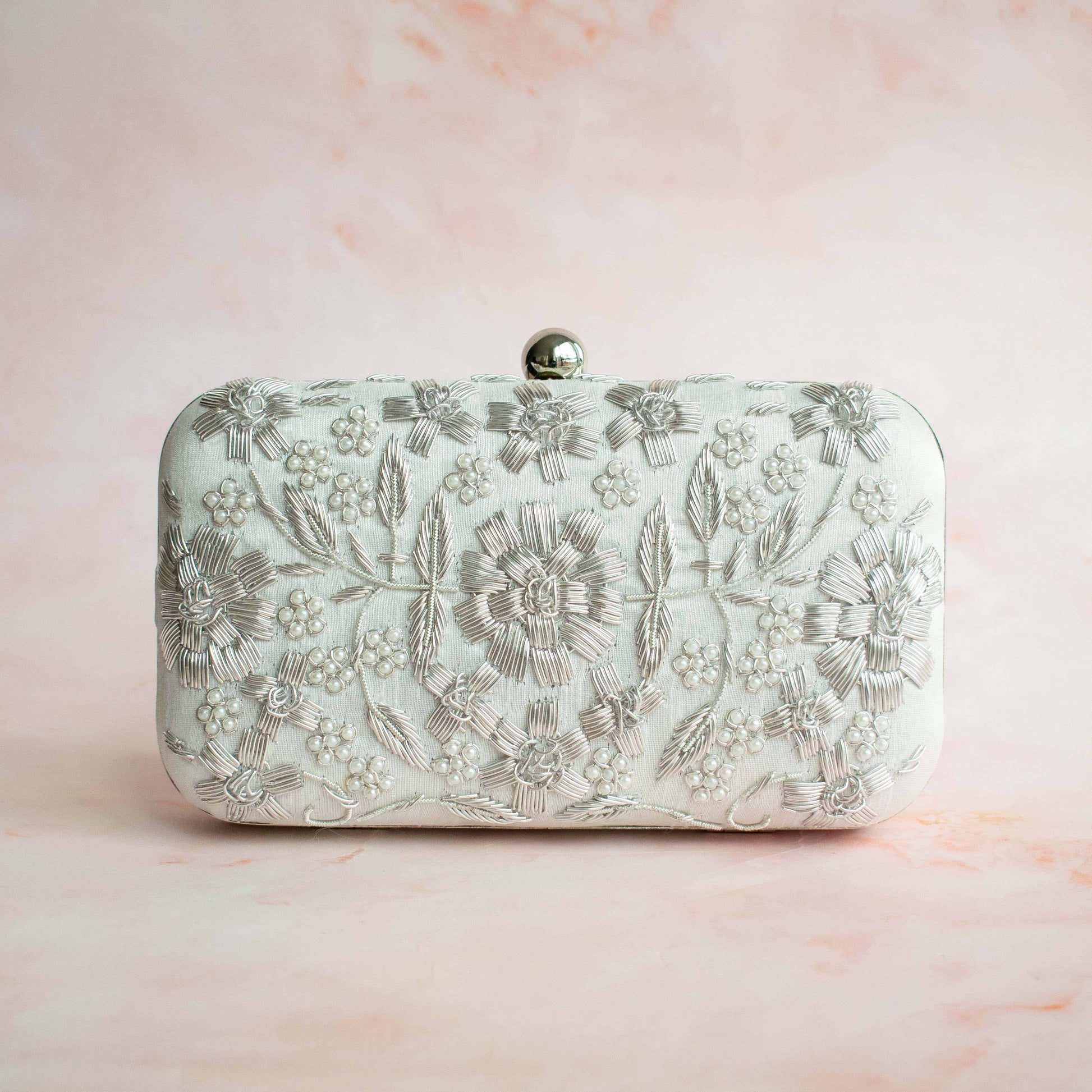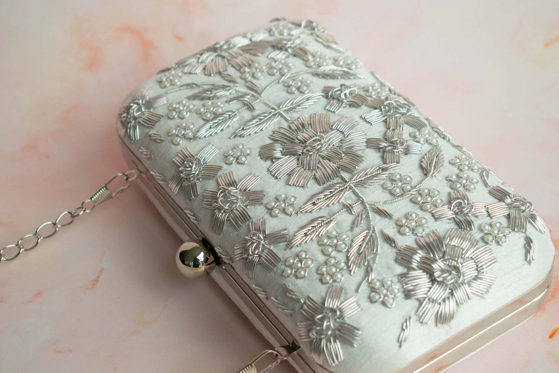 A very classy and elegant ivory silk clutch embellished with silver zardozi and pearls. Super chic!