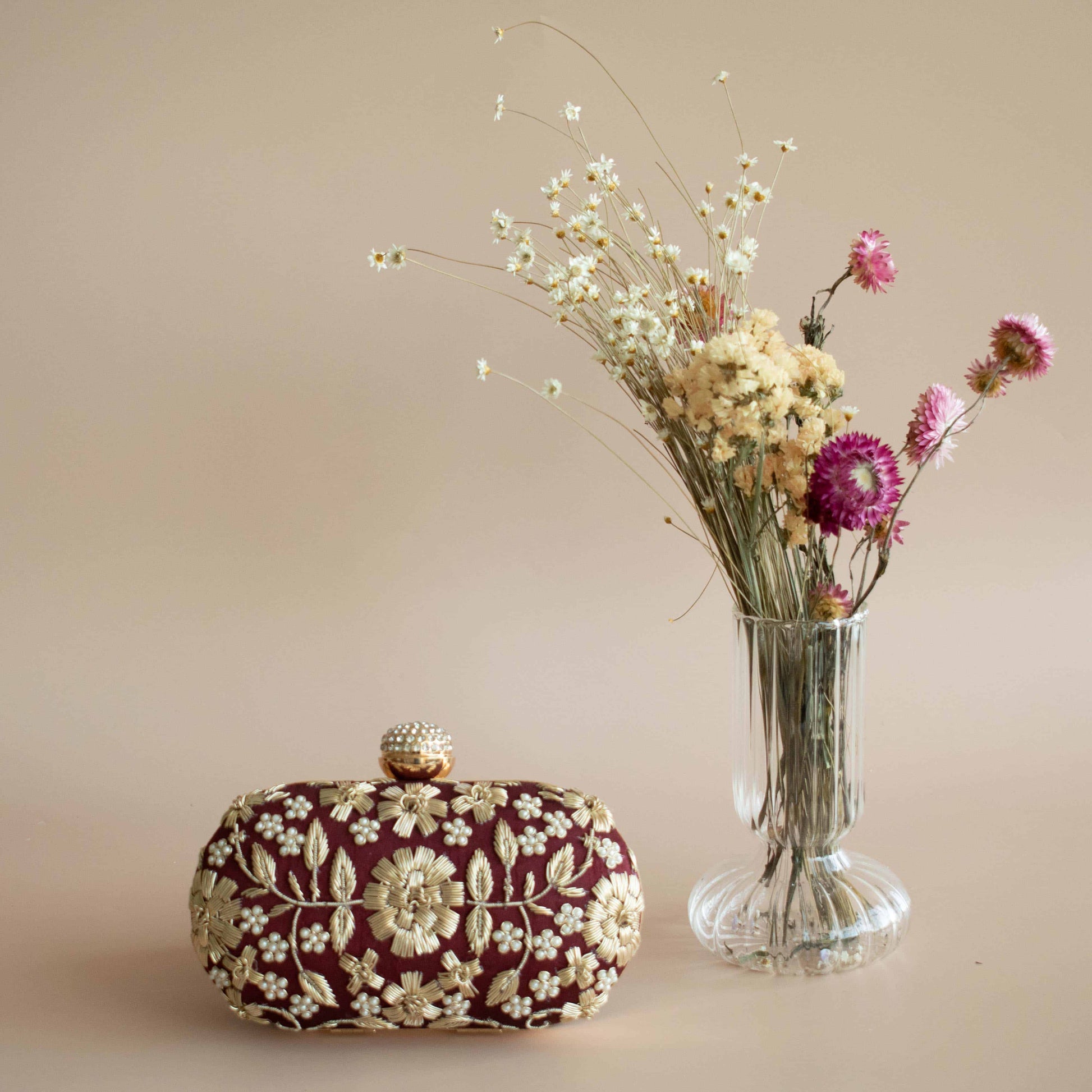 A very beautiful oval shaped minaudière clutch embellished with zardozi and pearls.