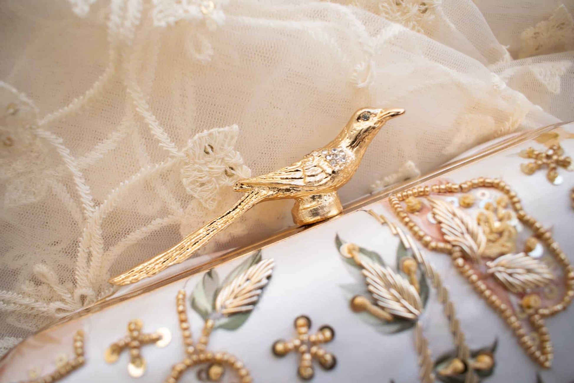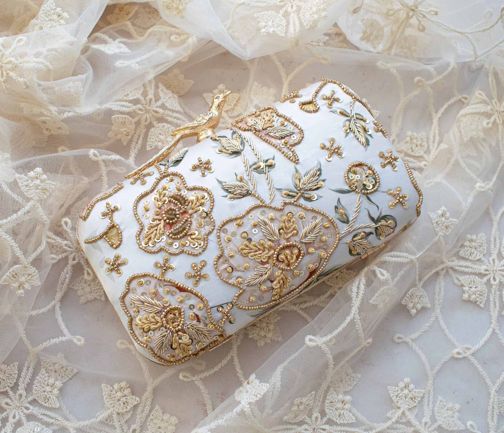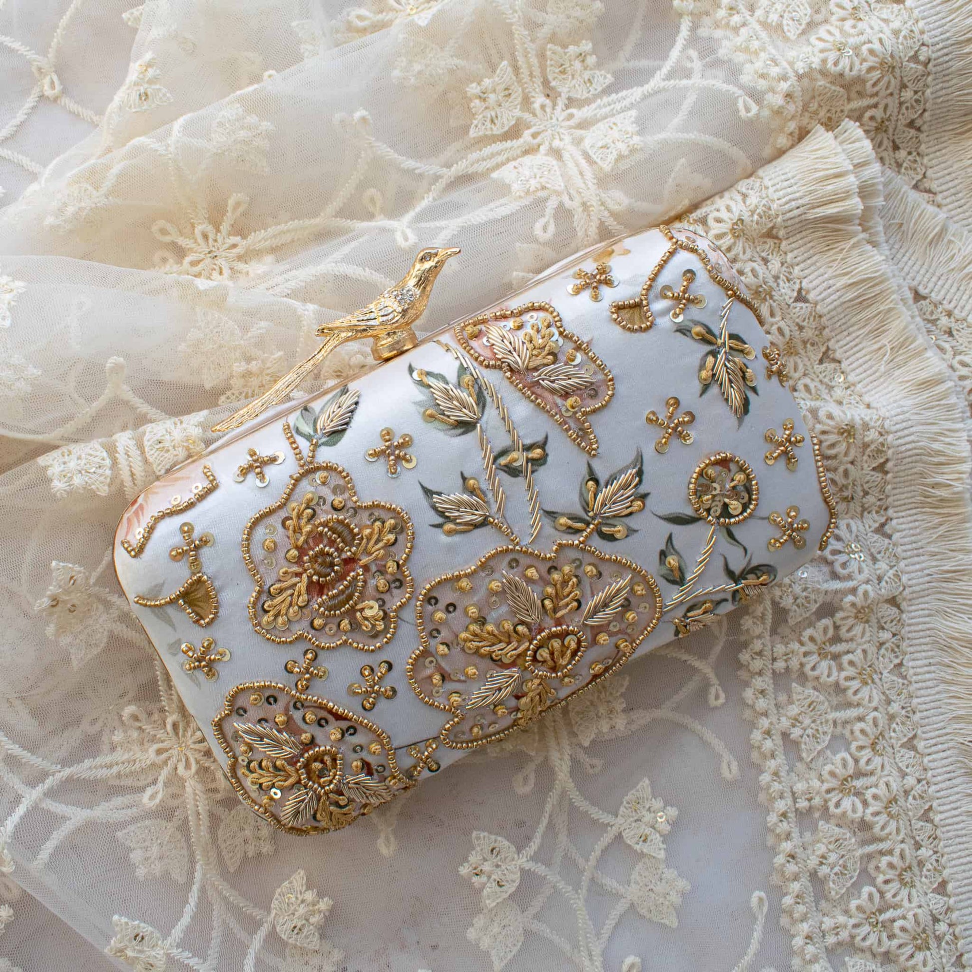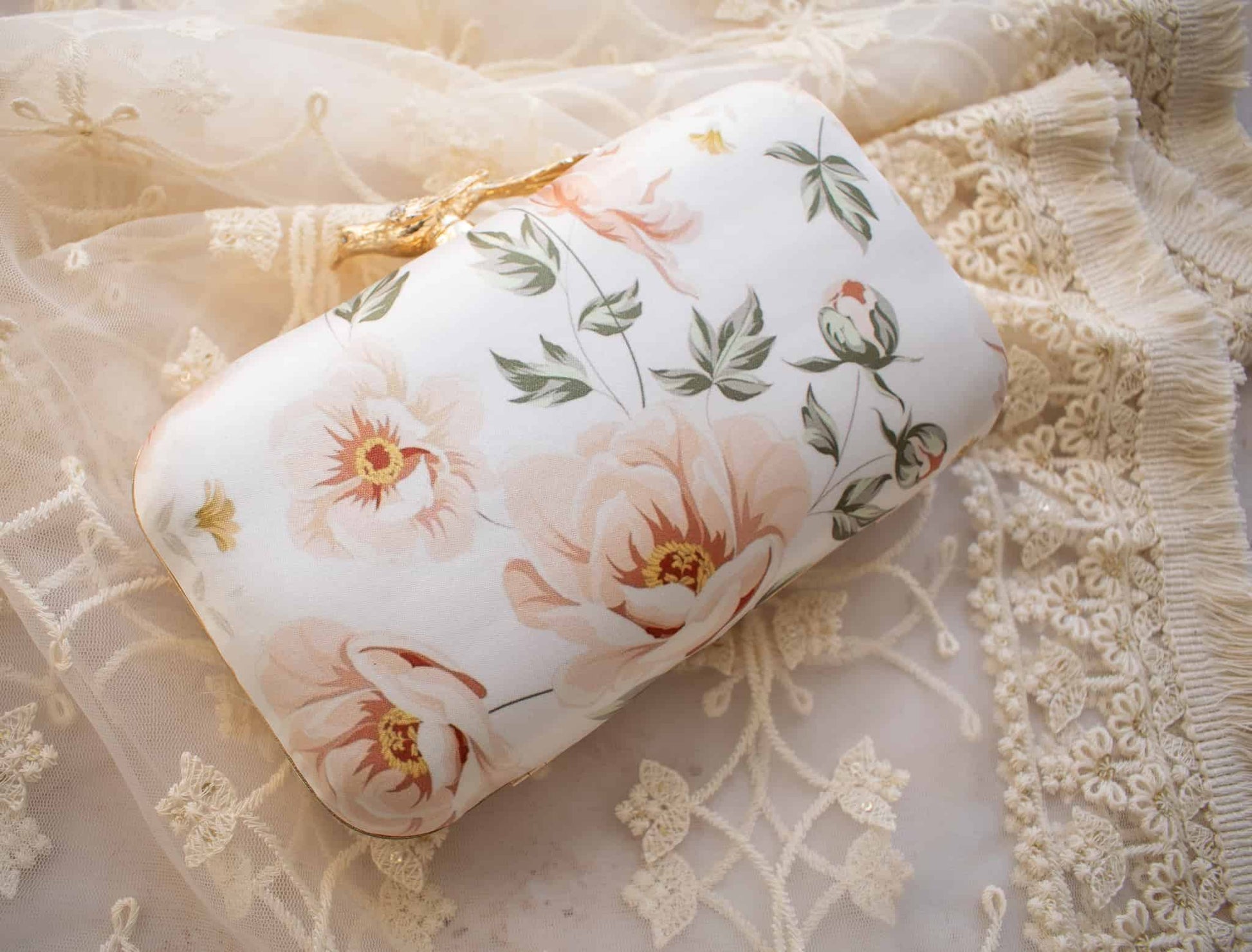 Our beautiful new collection of digital prints embellished with hand embroidery on one side and a stunning print on the other. Lined with suede and includes a high quality curbed chain.