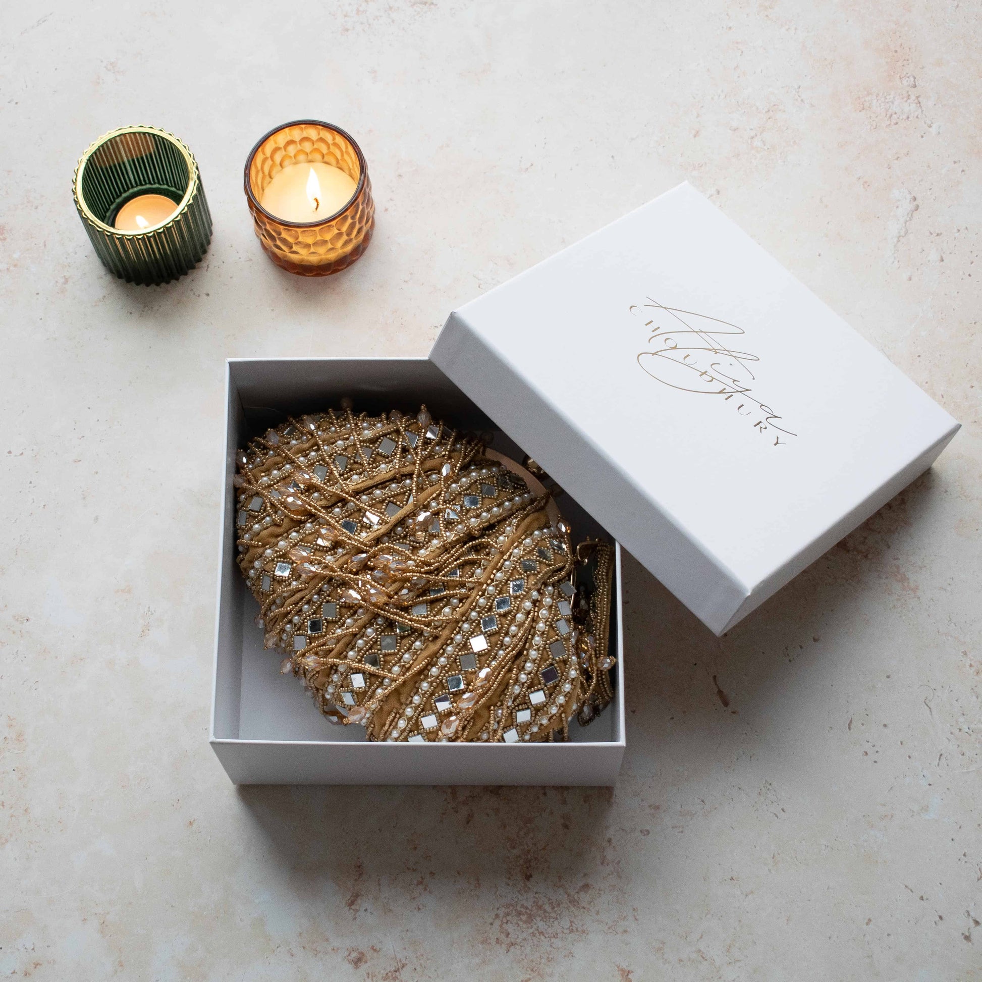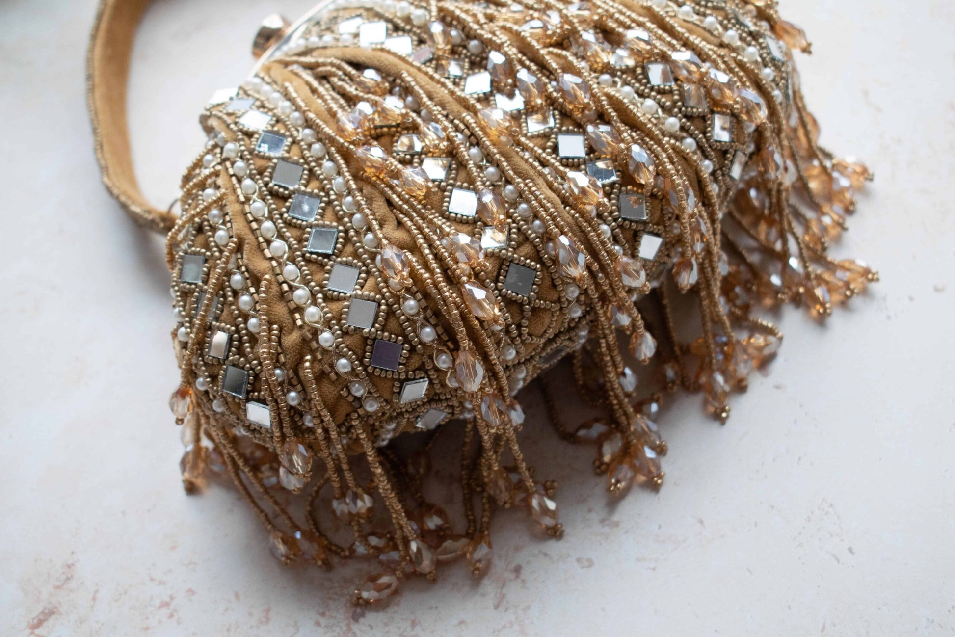 The Eliana Clip Purse in bronze velvet is an opulent accessory that sparkles with sequins, pearls, mirrors, and zardozi embellishments. Its intricate design and elegant tassels make it a striking statement piece for special occasions. The beautifully embroidered handle adds sophistication, seamlessly elevating any outfit with its timeless charm and luxurious appeal.