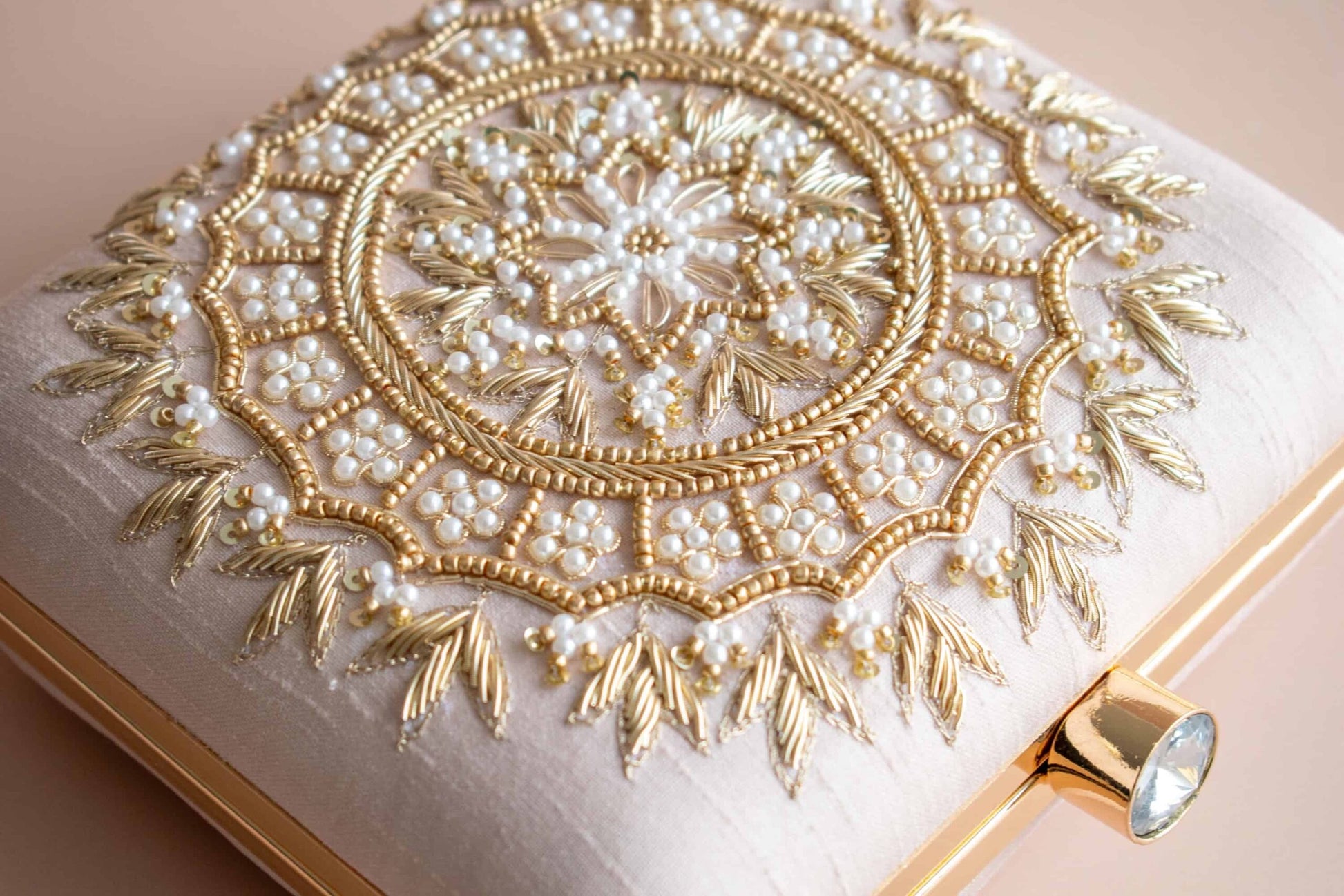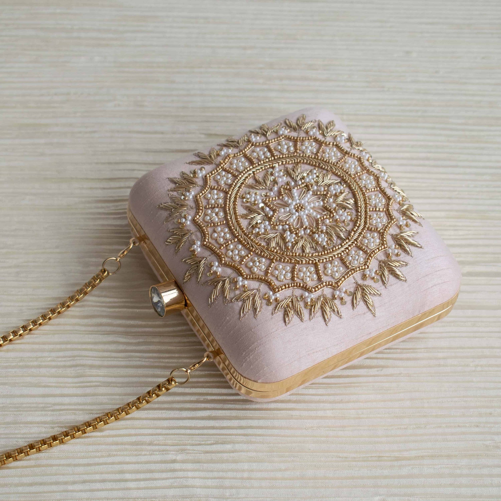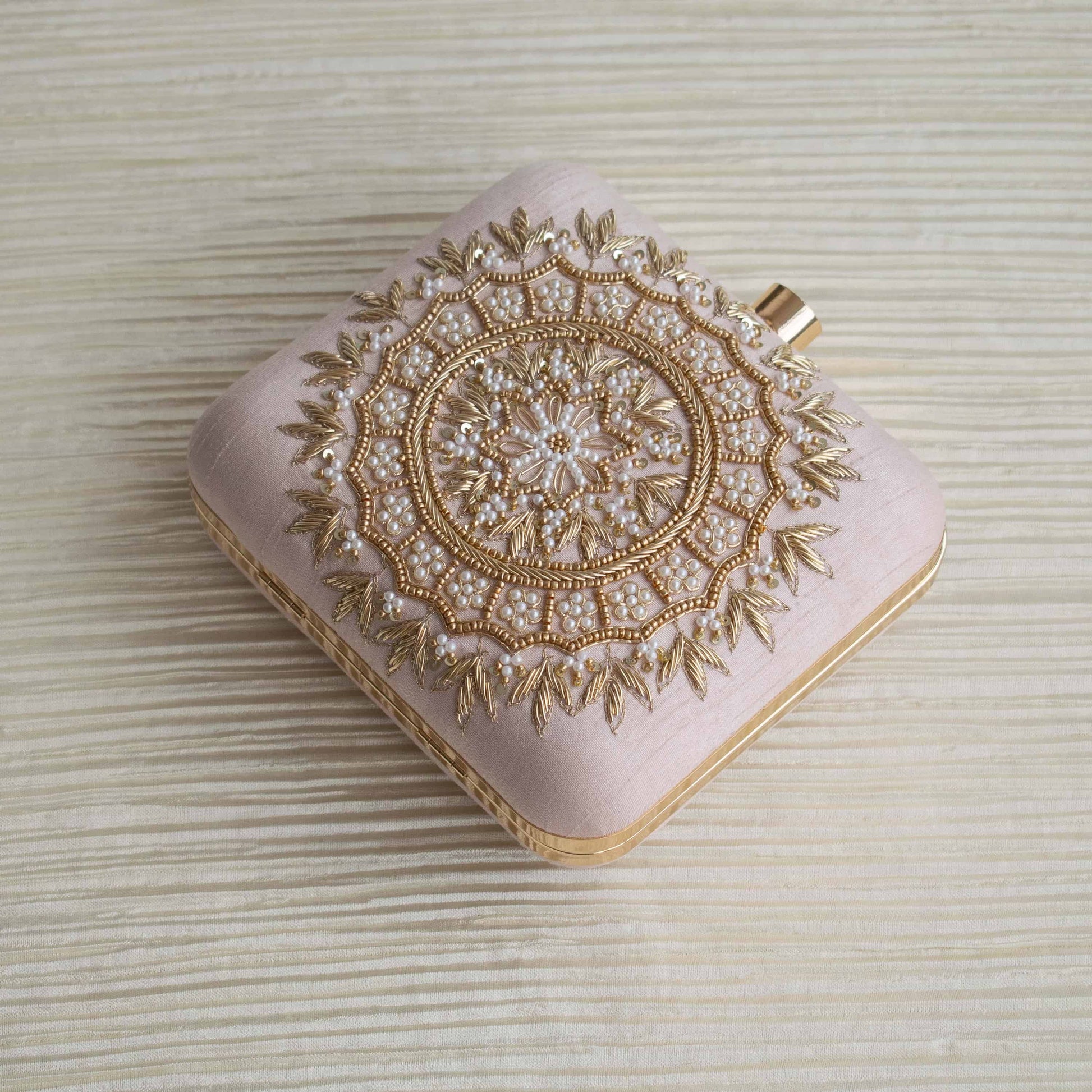 Introducing the MAHIYA clutch, a traditional and regal masterpiece. Made with a nude pink silk base, this classy item showcases intricate mandala embroidery. Its delicate design and timeless elegance make it perfect for any occasion.