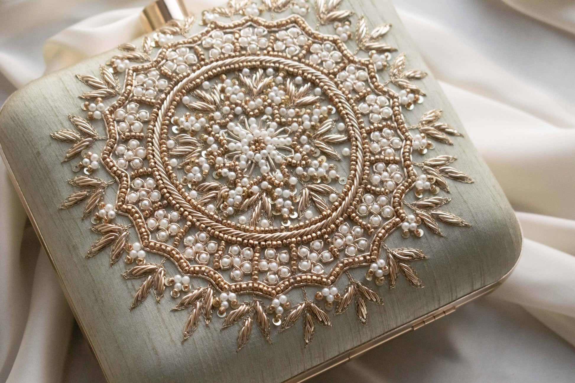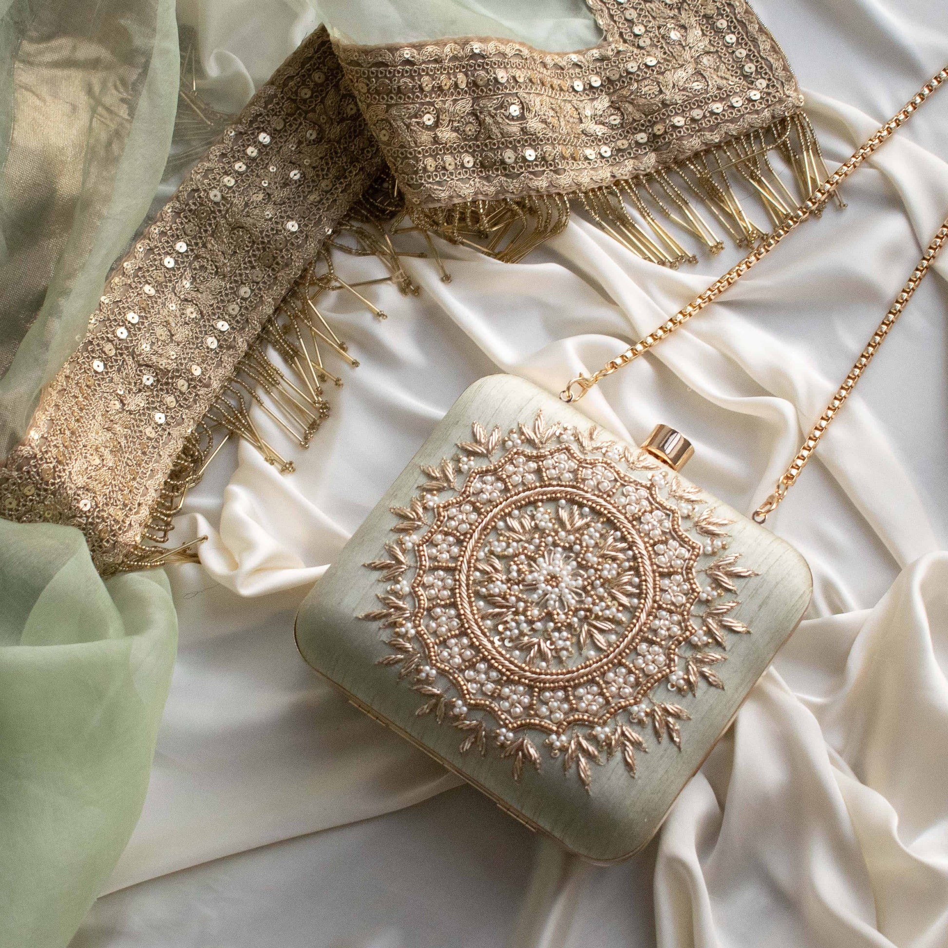 Introducing the MAHIYA (Sage Green) Clutch, crafted from exquisite sage green silk and adorned with traditional mandala design and intricate gold embroidery. This classic and regal piece is handmade with meticulous attention to detail, making it a timeless and luxurious addition to any wardrobe. Elevate your style with this elegant and intricately designed clutch.