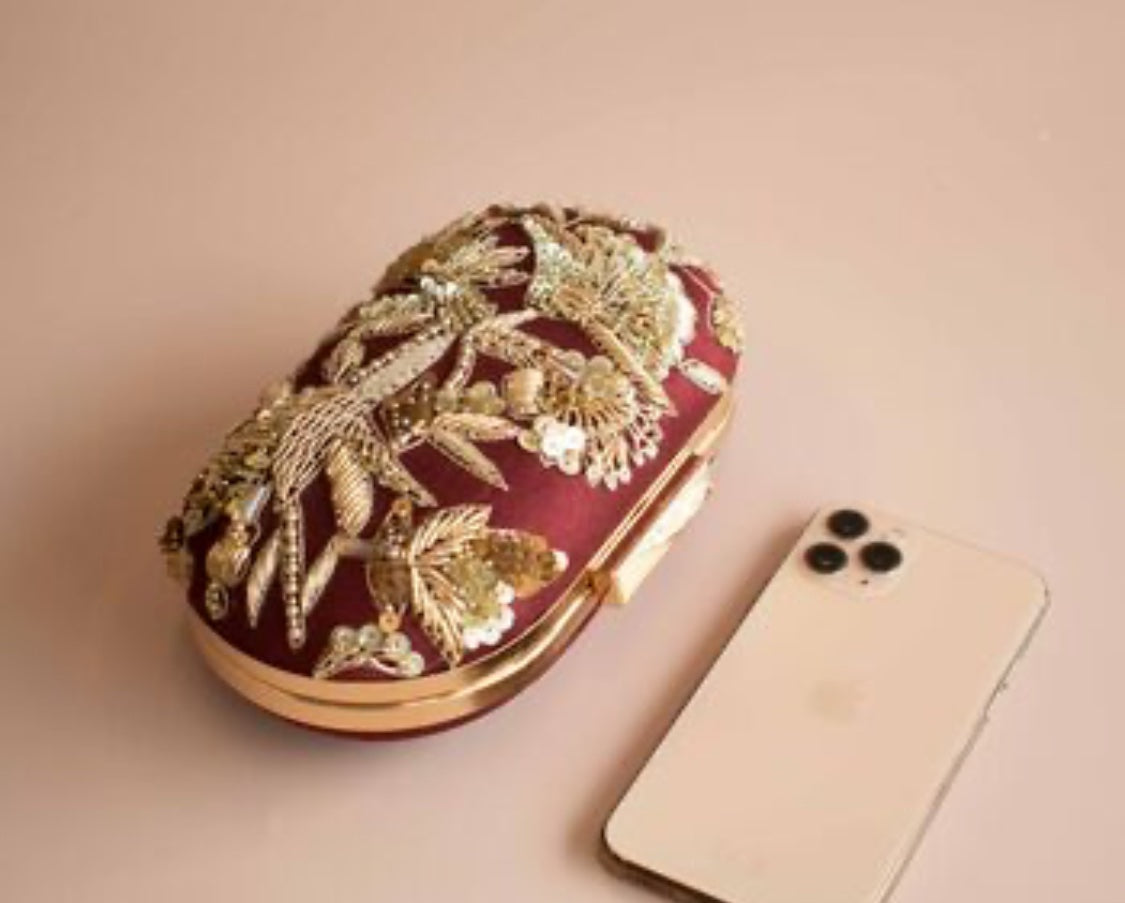 A very classy and regal oval shaped minaudière clutch embellished with gold zardozi, sequins and beads on a maroon silk base. It's the perfect size for a bride or even bridesmaids. Compact, subtle yet glam!