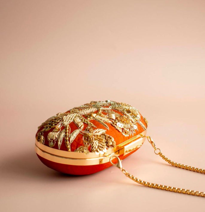 A very classy and regal oval shaped minaudière clutch embellished with gold zardozi, sequins and beads on a rust orange silk base. It's the perfect size for a bride or even bridesmaids. Compact, subtle yet glam!