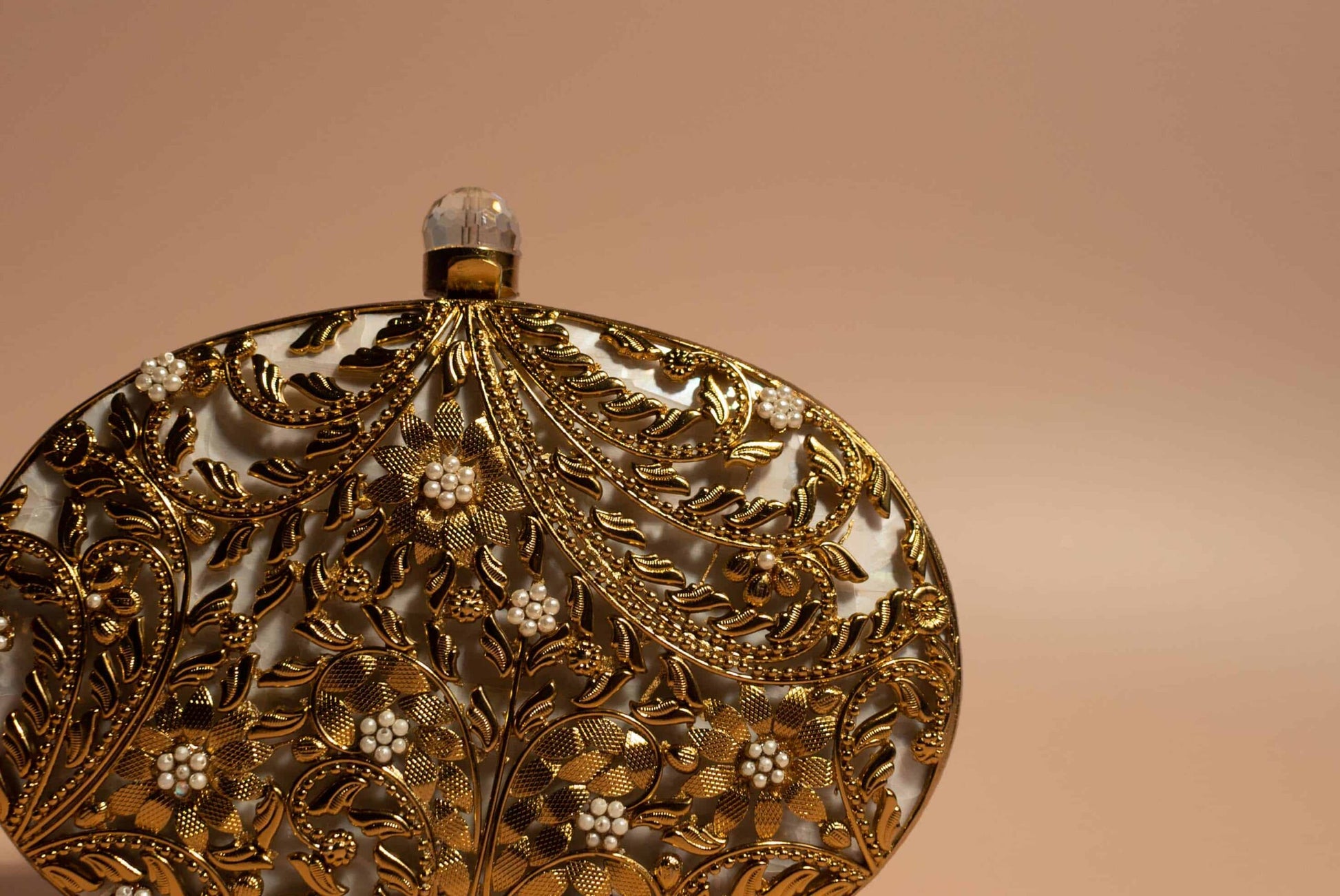 Luxury Mother of Pearl clutch bag with hand crafted and embossed detailing. Elegant, stylish and a very unique shape. Based on an antique gold brass frame, intricately cut and detailed on both sides. The front side consists of a Mother of Pearl shell base with a layer of floral and pearl cut pattern. The back side is just as beautiful with antique gold carved work.