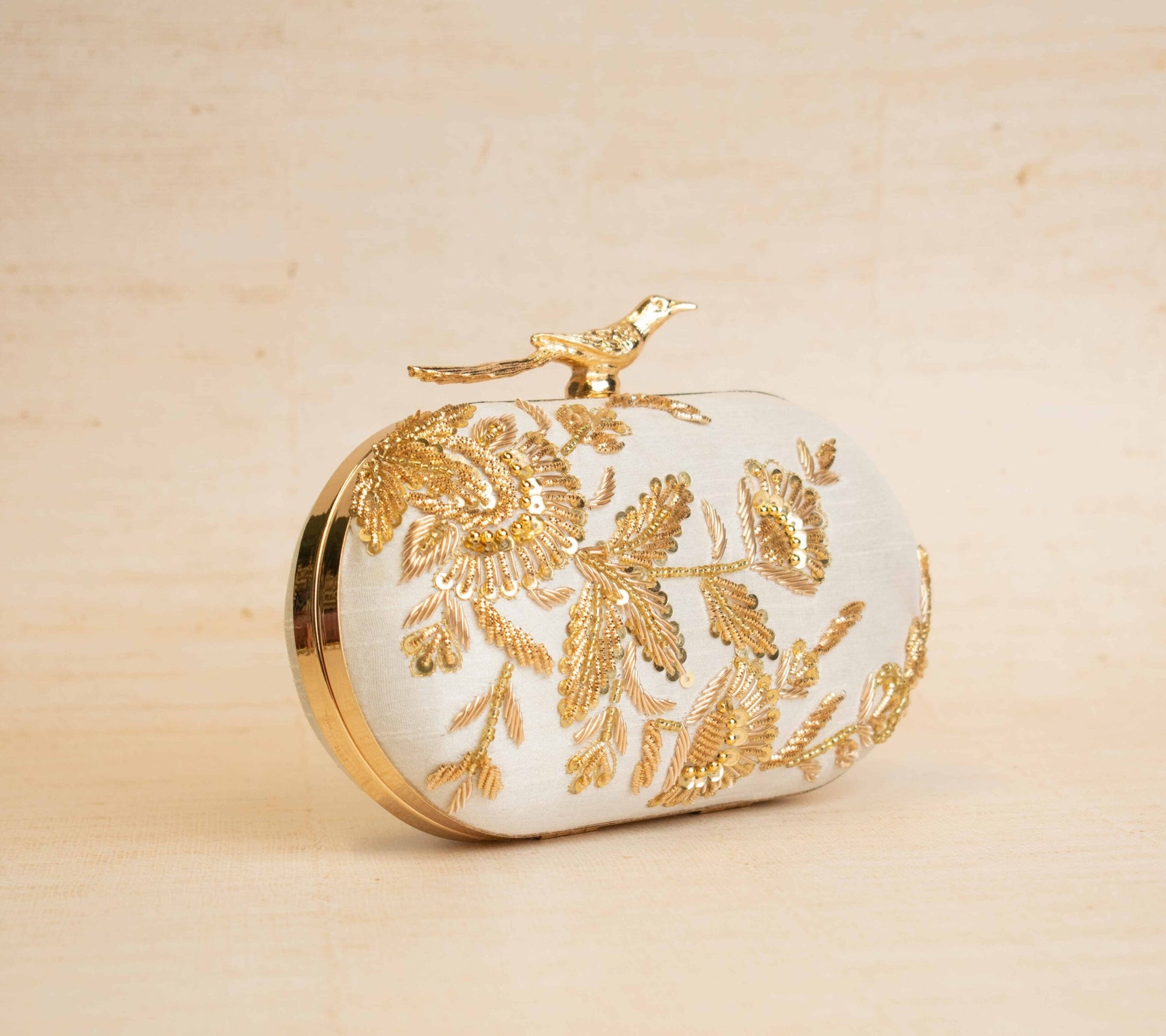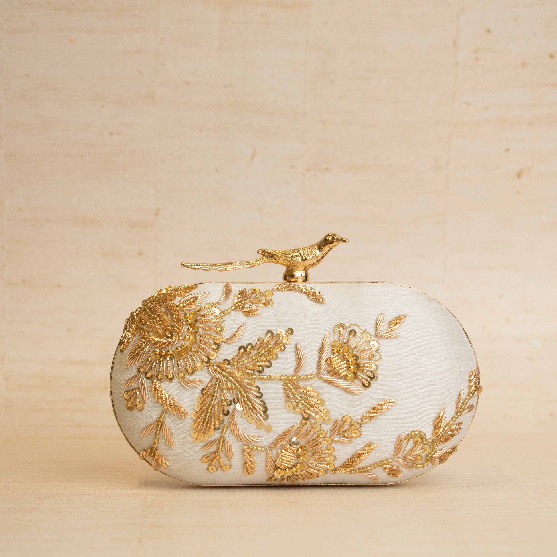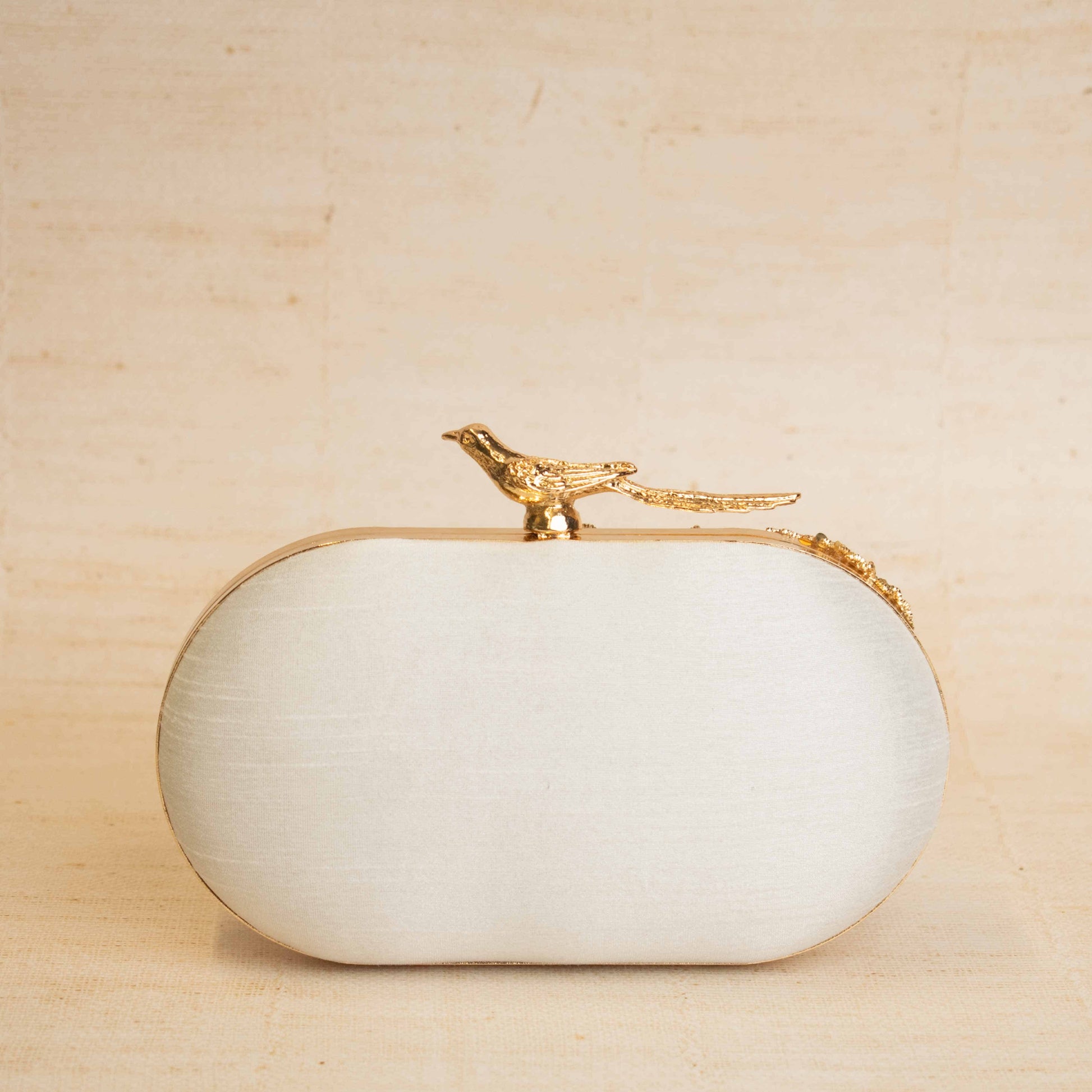 If you love quirky pieces then this one is for you! An elegant oval, ivory silk clutch with subtle yet intricate gold details. Finished off with a quirky bird clasp.