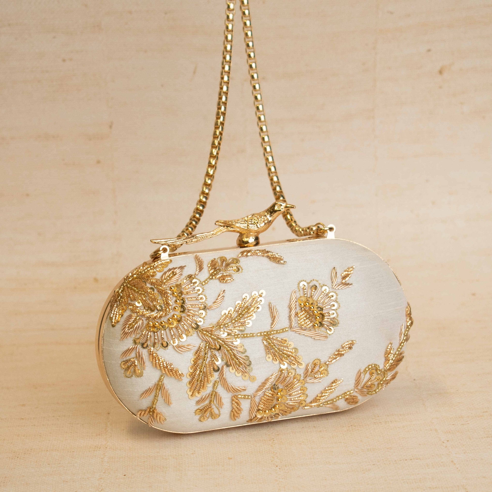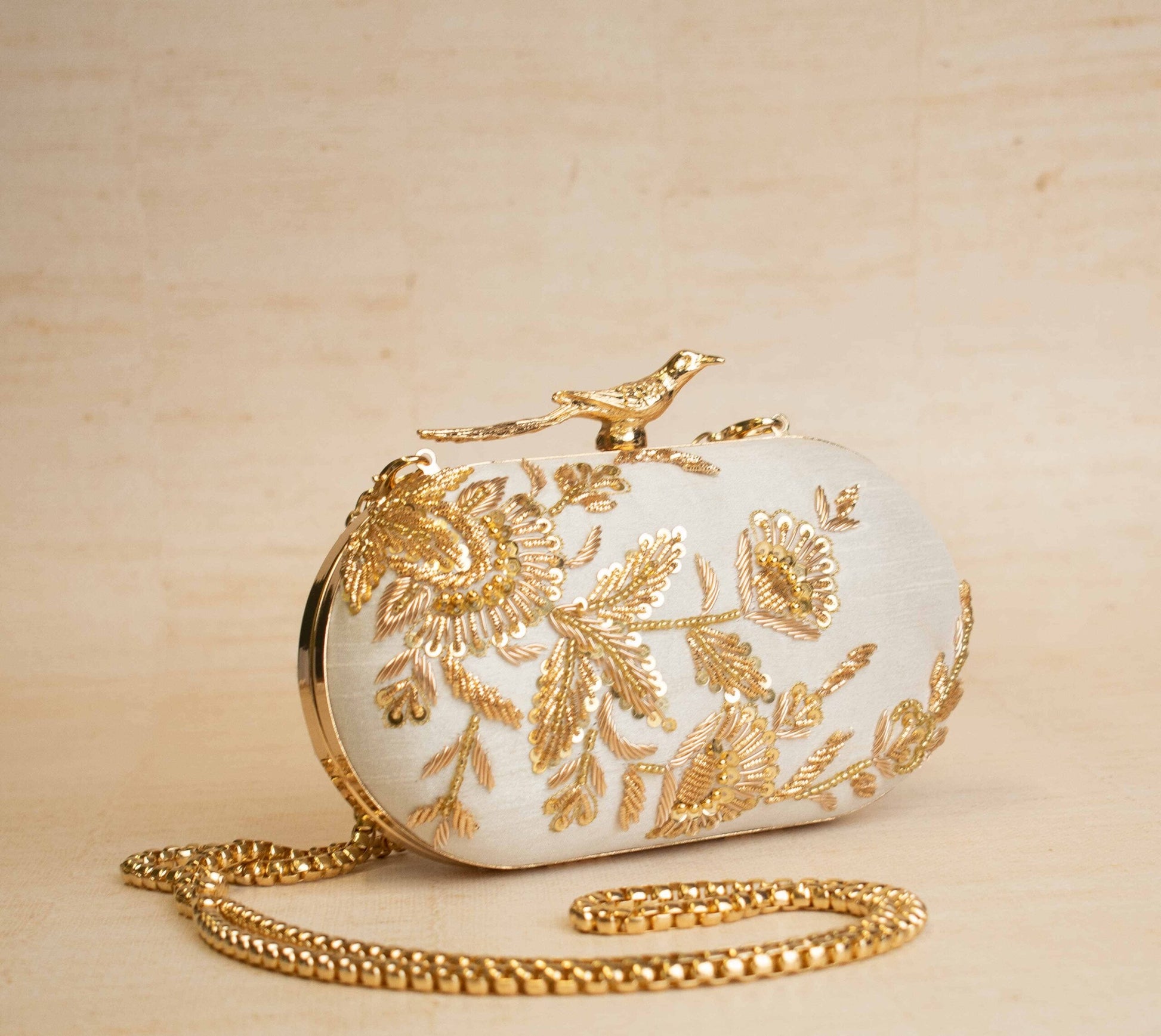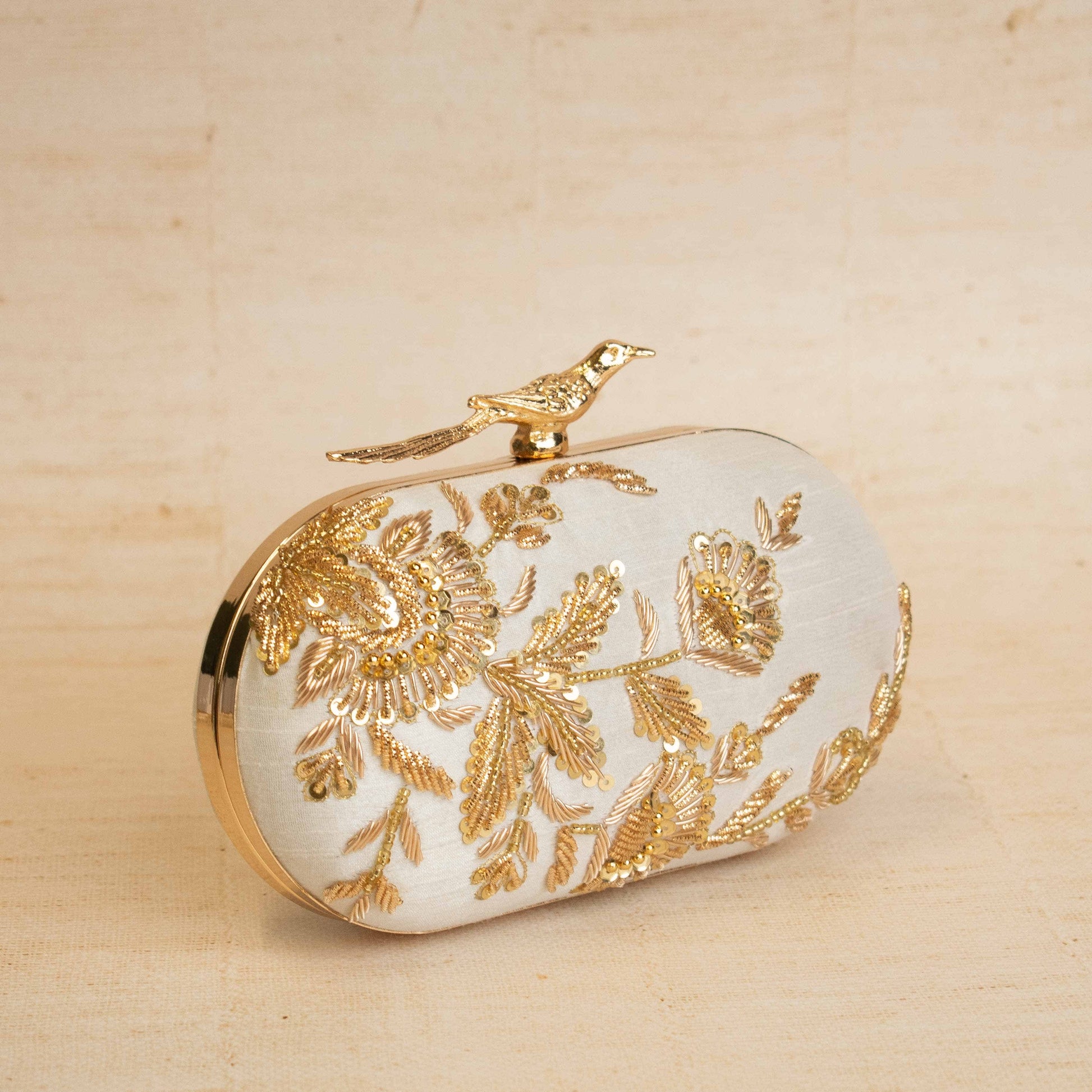 If you love quirky pieces then this one is for you! An elegant oval, ivory silk clutch with subtle yet intricate gold details. Finished off with a quirky bird clasp.