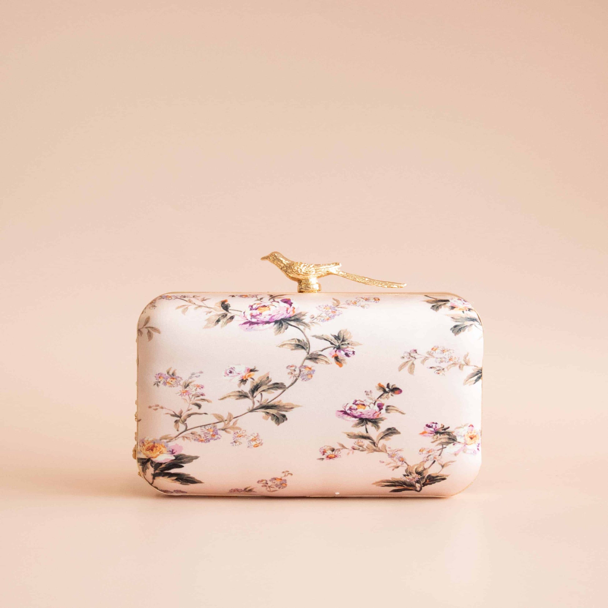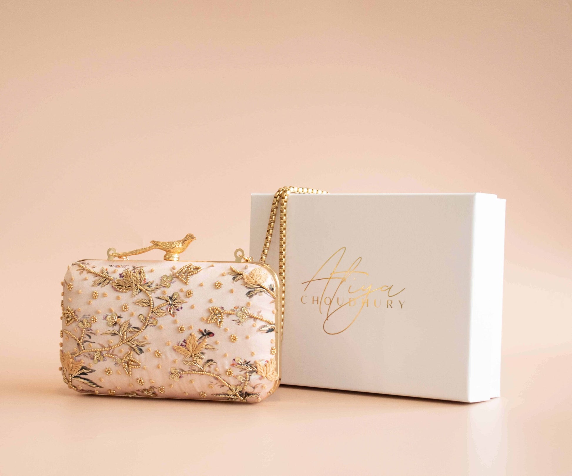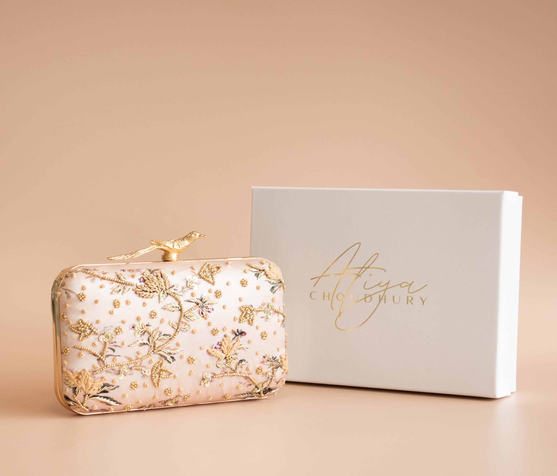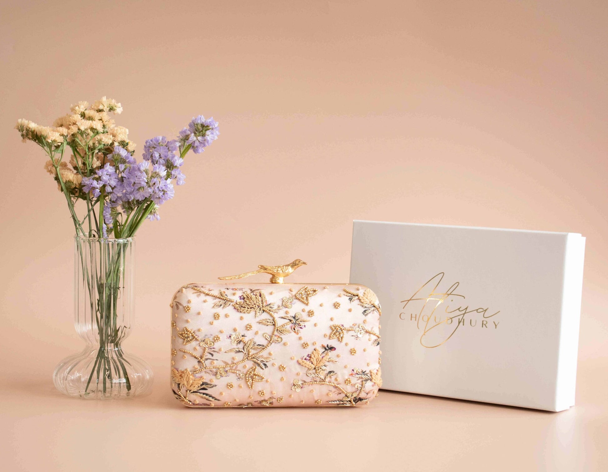 A pretty floral rectangular shaped clutch. This clutch has a printed nude pink satin silk base embellished with gold zardozi, sequins and beads.
