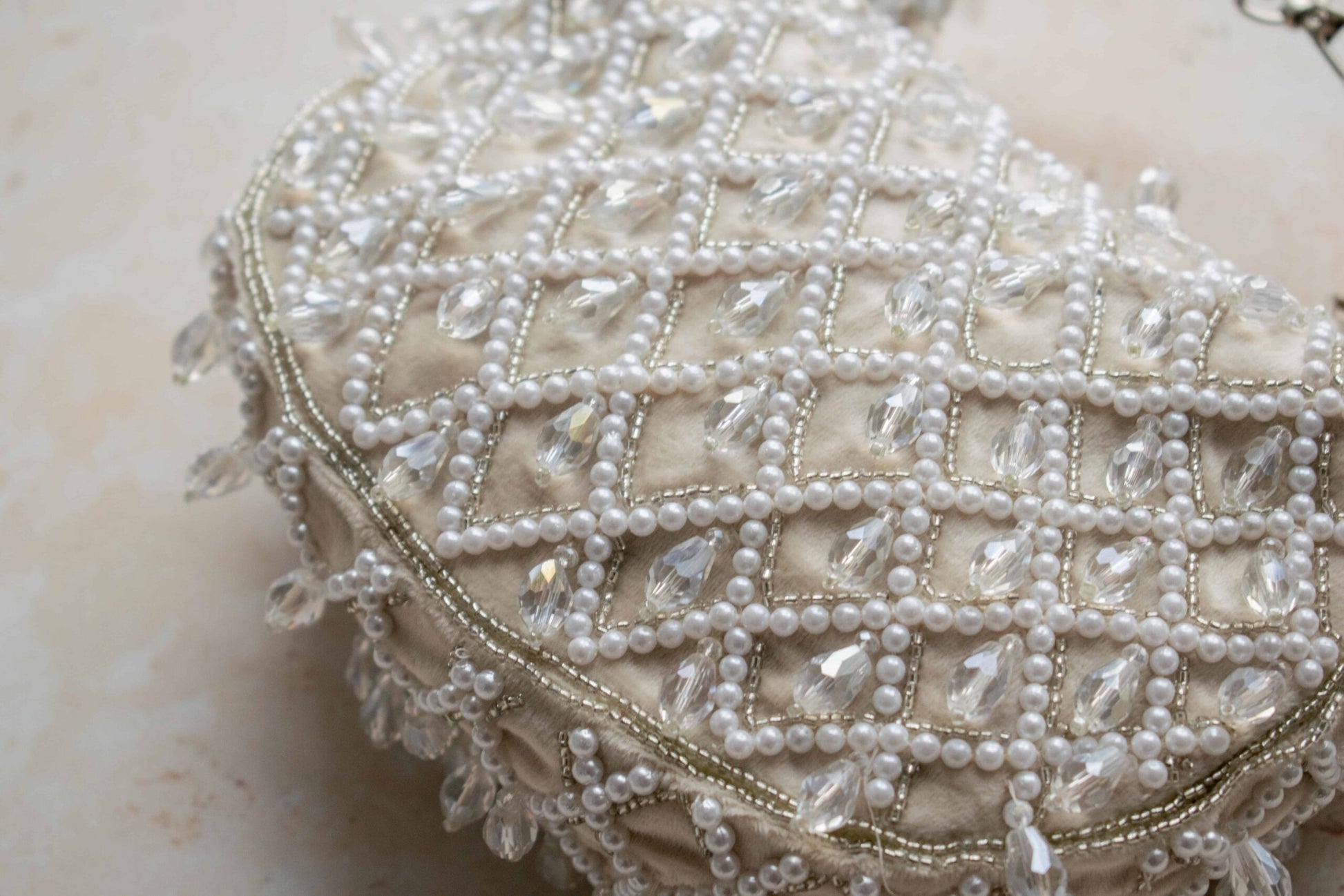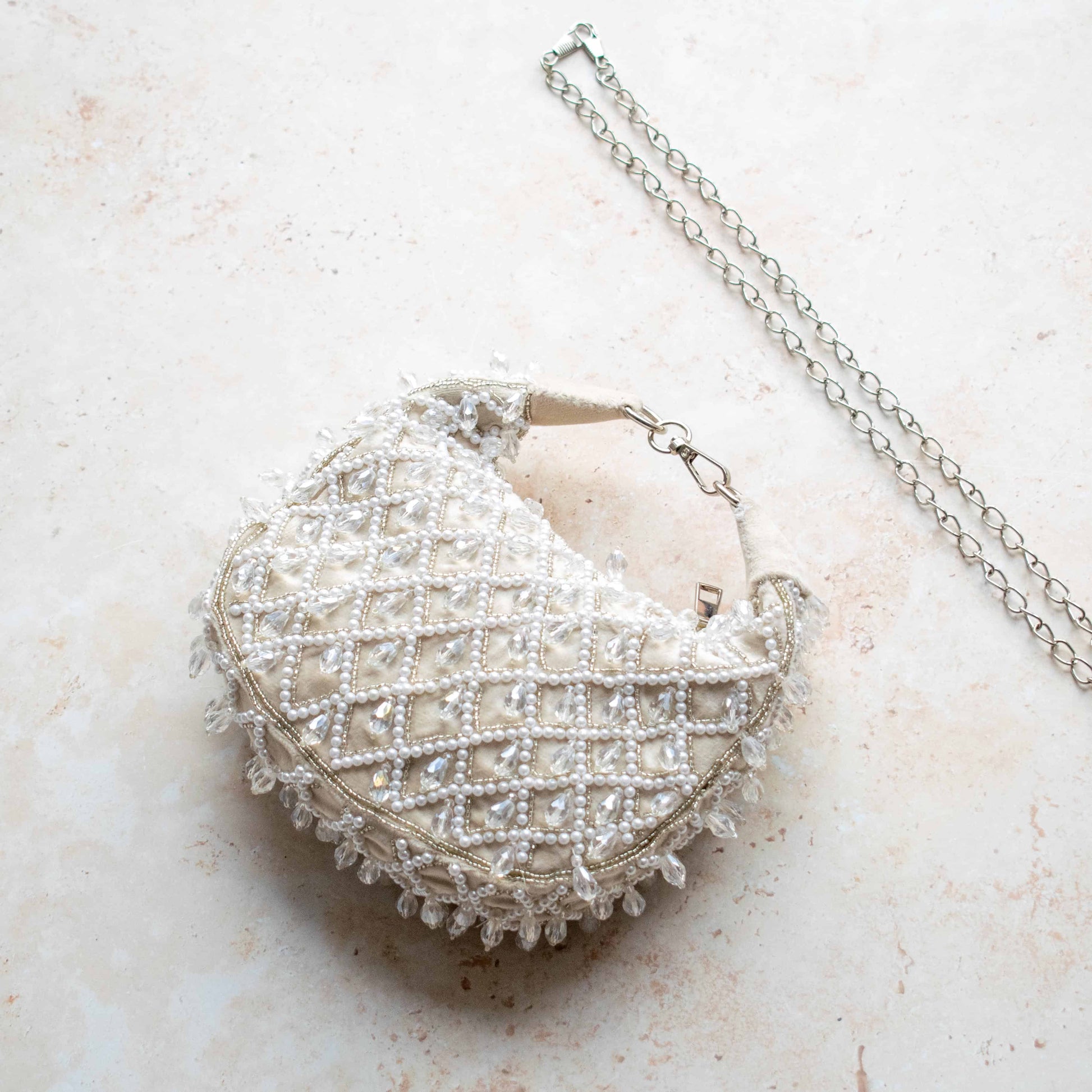 Introducing the Tala Handbag in Ivory Suede, a chic and versatile addition to any wardrobe. This mini tote bag features stunning embellishments on both sides, adding a touch of elegance to your look. Crafted with a luxurious suede base, it effortlessly converts from a clutch to a shoulder bag with its included strap. Enjoy secure storage with its convenient zip closure. Perfect for adding a stylish flair to any occasion.