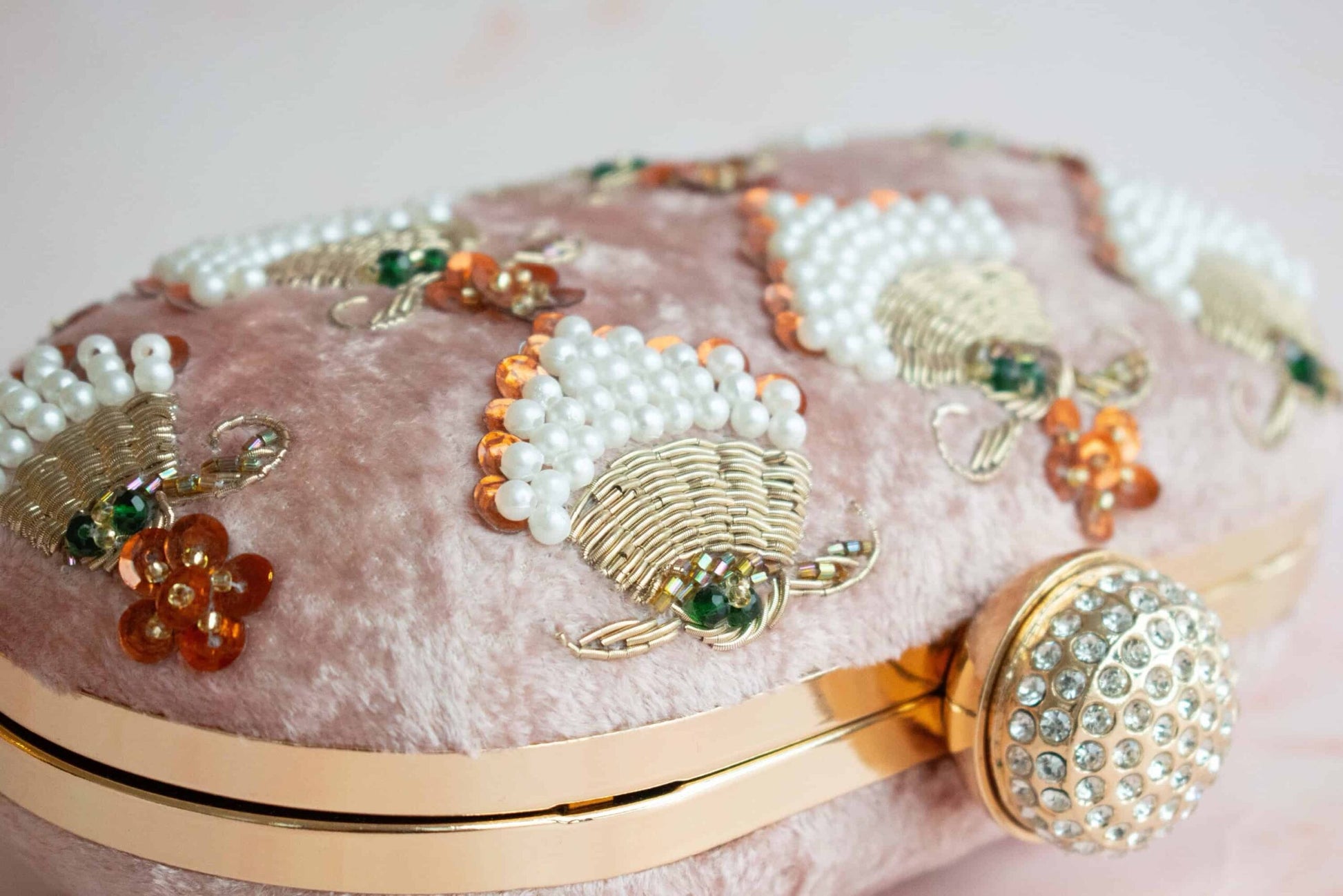 An exquisite oval dusky pink velvet clutch adorned with intricate zardozi work, pearls style beads and shimmering copper sequins. The delightful touch of green beads enhances the unique charm of this handcrafted piece. It comes complete with a shoulder chain for added convenience.