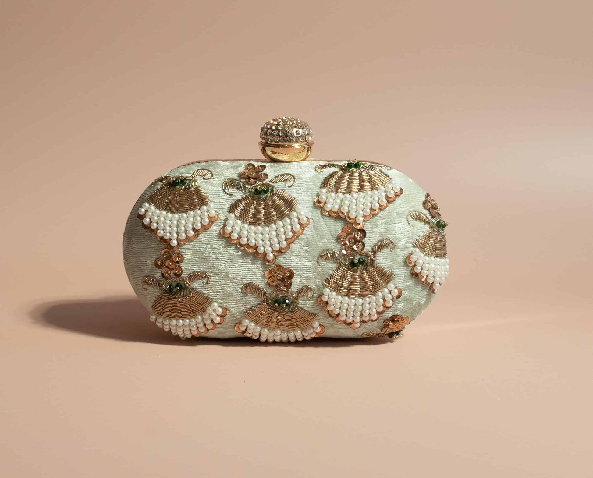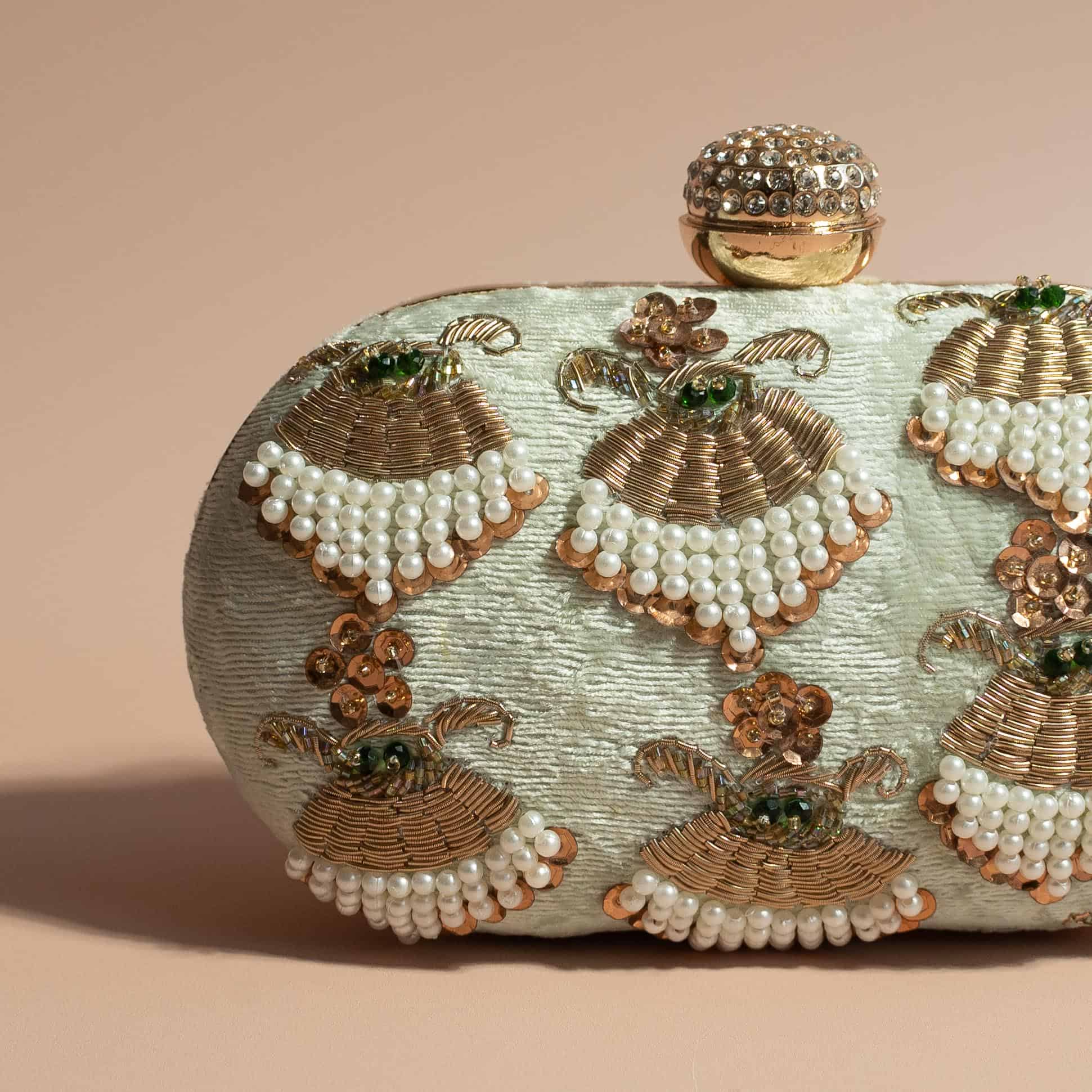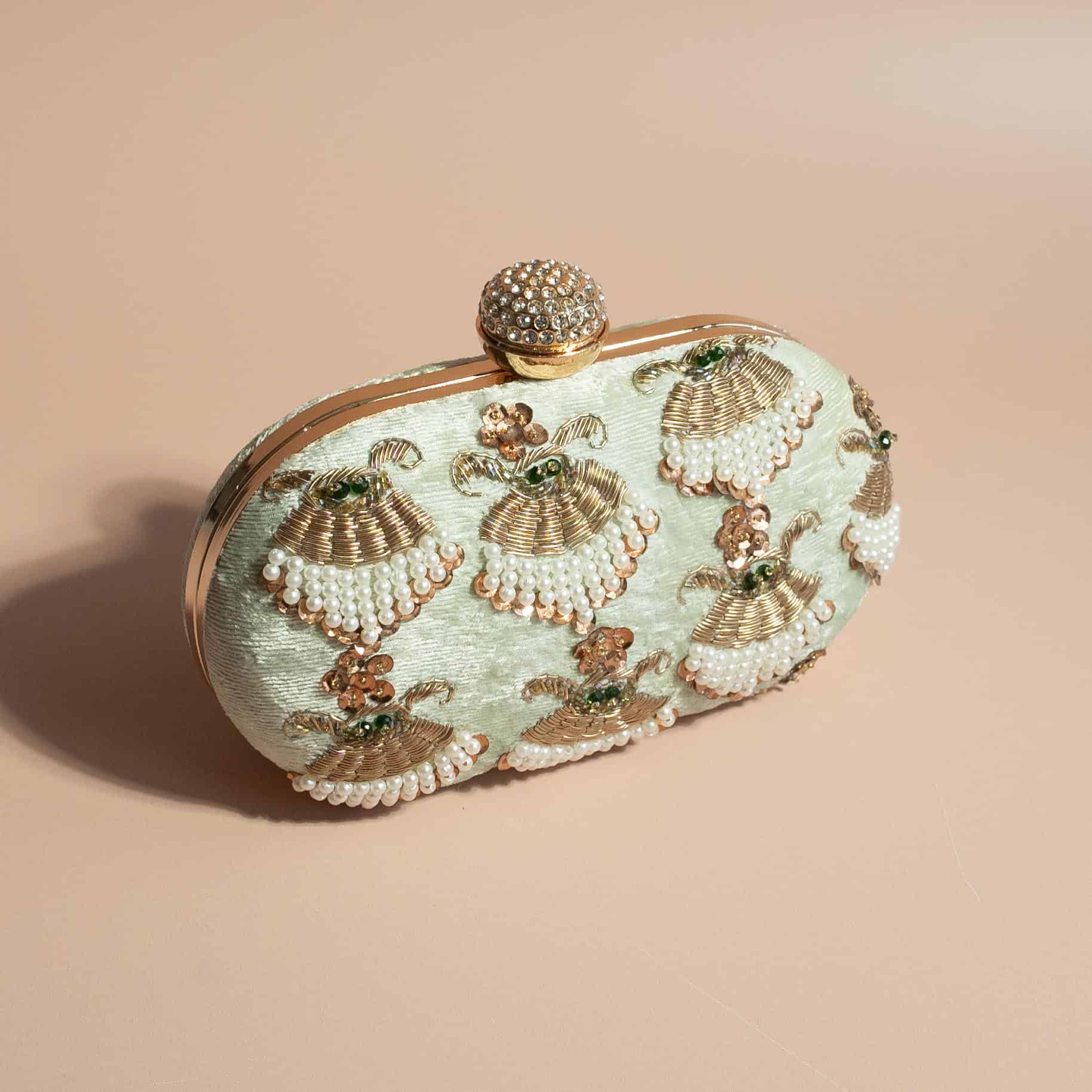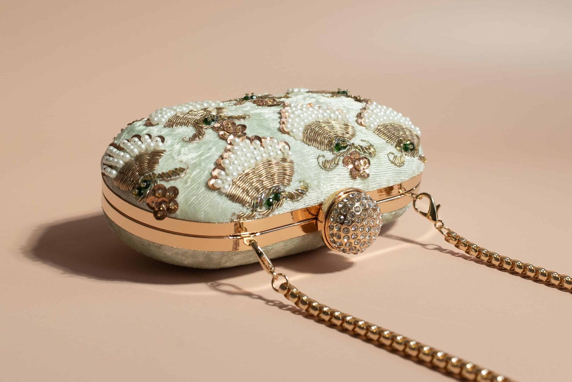 Introducing the stunning VANIYA (Mint) minaudière clutch, a luxurious accessory perfect for any special occasion. The oval shaped design, adorned with intricate zardozi, pearls, and sequins on a soft velvet base, exudes elegance and charm. Make a statement and stand out with this beautiful and unique piece that will elevate any outfit.