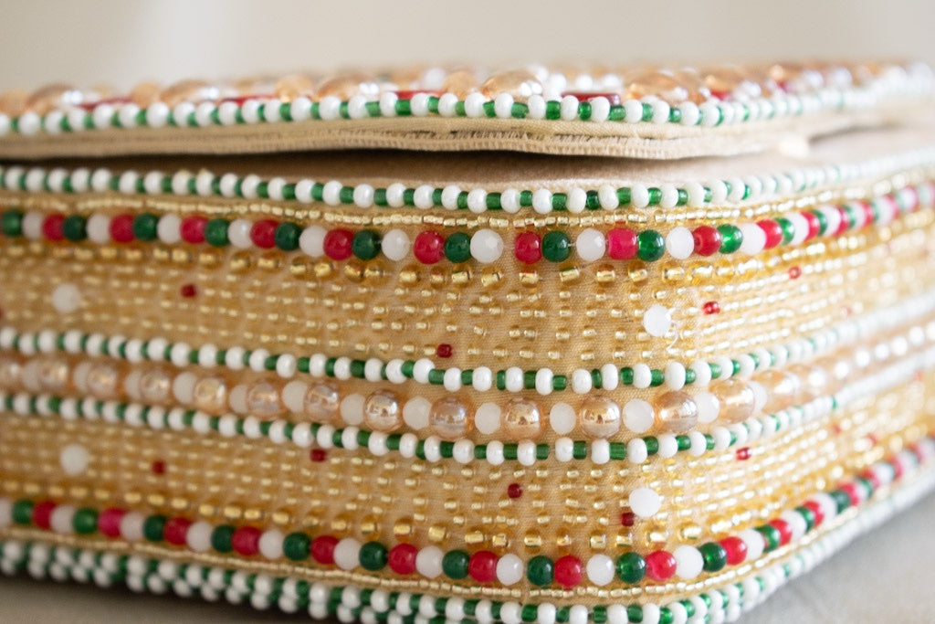 This exquisite handbag is a true work of art, handcrafted with meticulous detail and adorned in vibrant jewel-toned beads. Rows of ruby red, emerald green, pearl white, and golden accents come together in mesmerizing geometric patterns, creating a design that feels both traditional and refreshingly modern.
