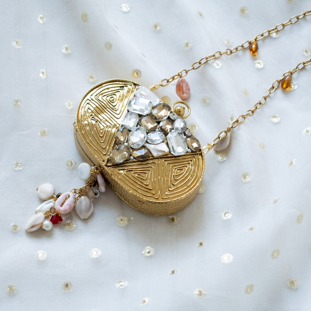 The exquisite Siyana Mini Clutch is a celebration of nature's beauty and traditional Indian craftsmanship. The elegant oval silhouette showcases a stunning fusion of lustrous mother of pearl, sparkling crystals, and brilliant diamante details, all set against a luxurious gold-tone textured brass base.
