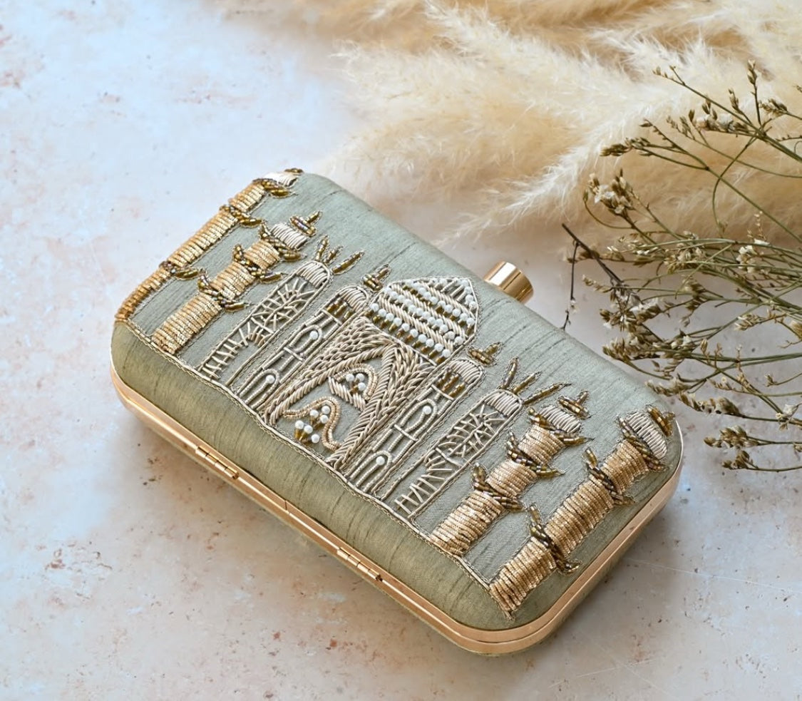 Sage green silk clutch. Beautiful, chic and trendy all at once! Make a statement with this beauty. Can be worn with your south-asian outfits or even with a pair of jeans!